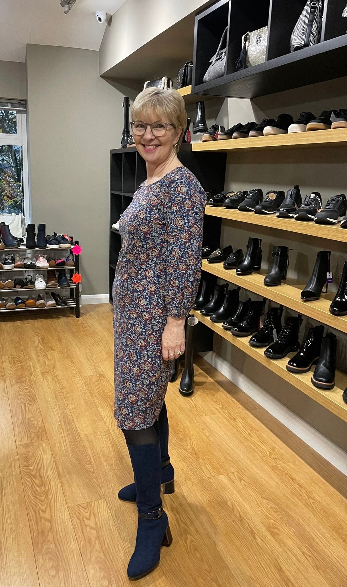 -Adini 'Antara' blue marina print dress. Soft slub jersey with front gathers for shape & side pockets. Pull on with elasticated cuffed three quarter sleeves.
