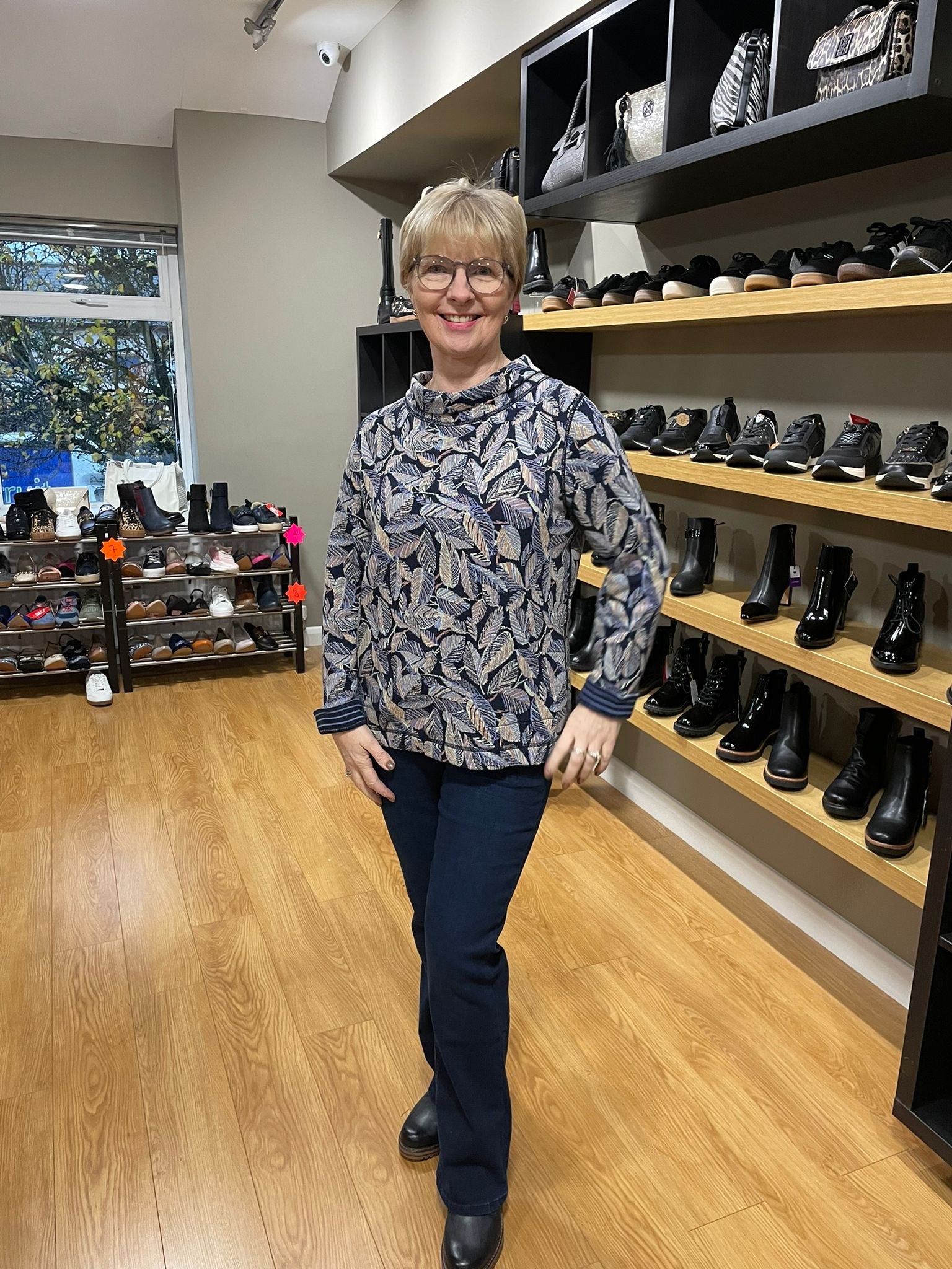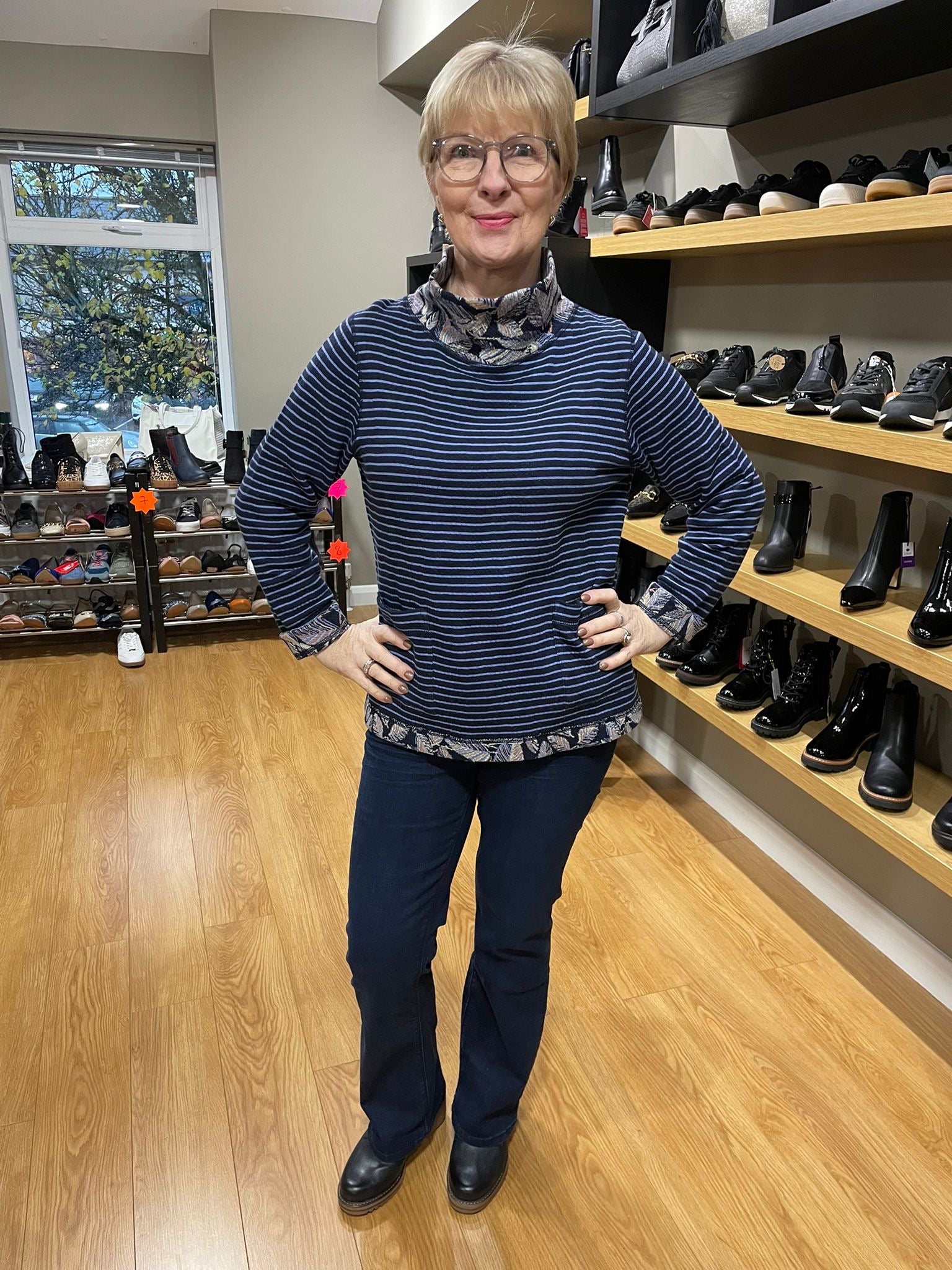 -Adini 'Bhavi' autumn leaf/navy striped top. Fully reversible giving two designs/prints in one. Short roll neck in soft cotton jersey jacquard.