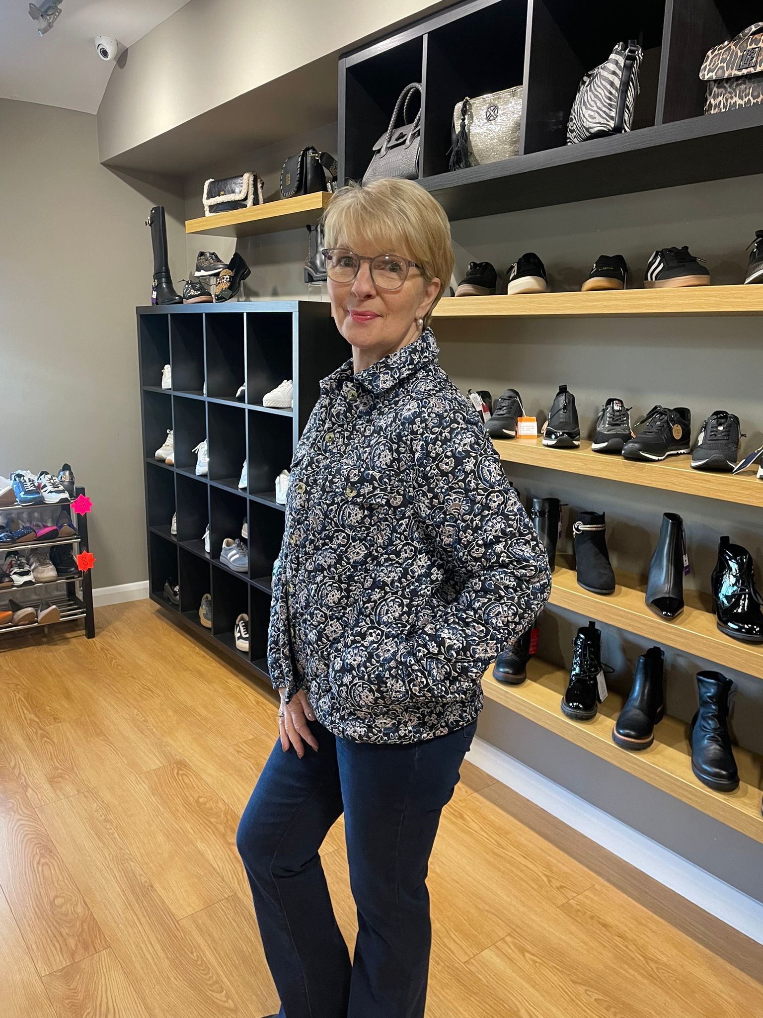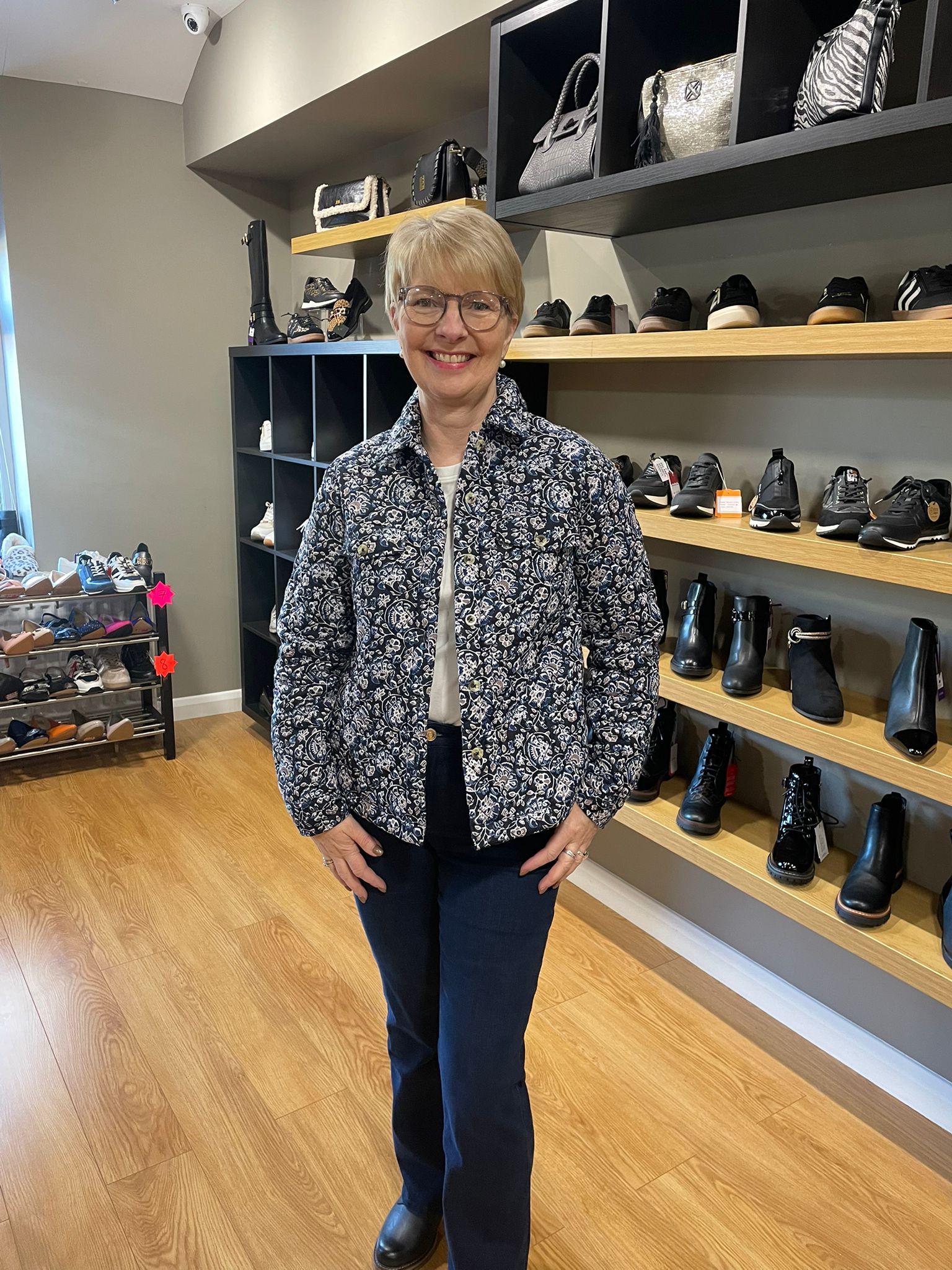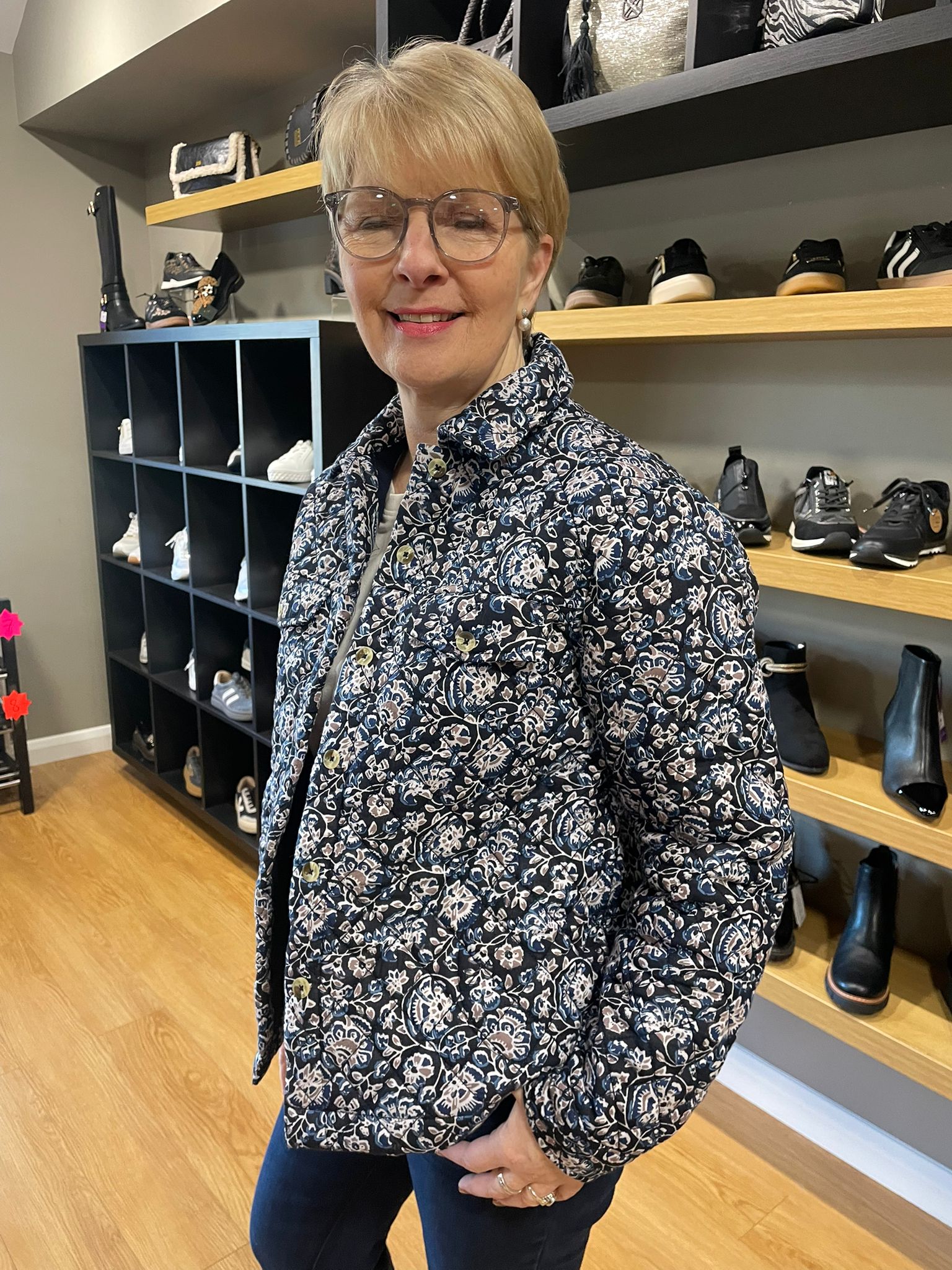 -Adini 'Shree' navy floral printed shacket. Classic collar, fully lined & button through, finished with breast pocket.