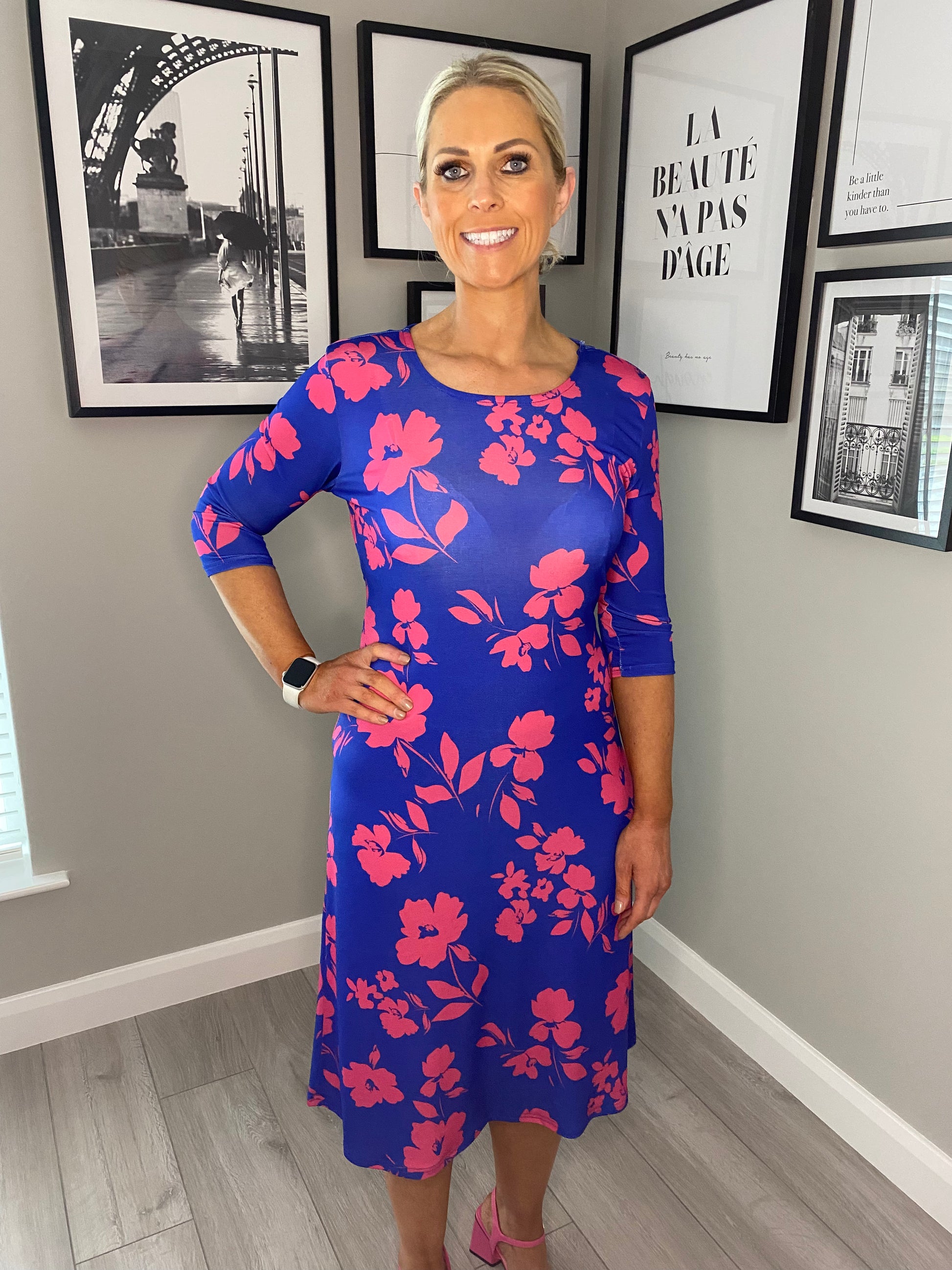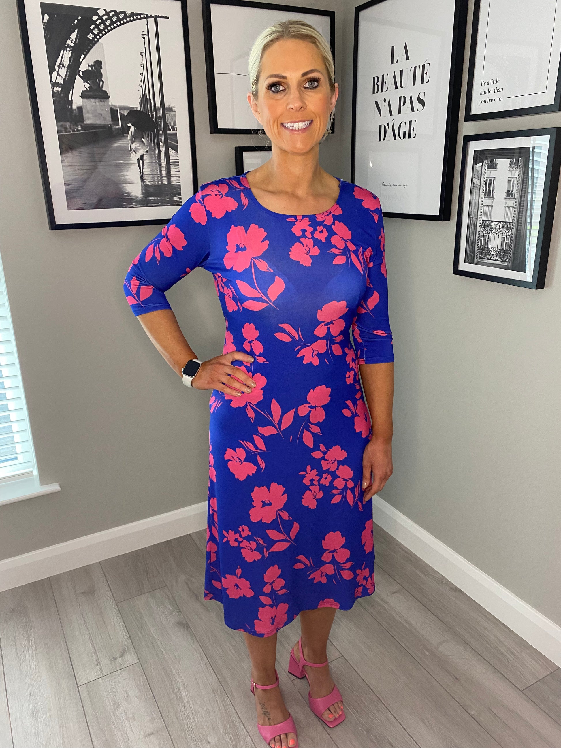Our Anonymous royal & pink floral dress is an eyecatcher with calf length half sleeve number for many occasions! With tie belt (pictured at the back) it clinches in the waist & is so very flattering! We've matched it with our Marco Tozzi hot pink sandals for a special occasion look.