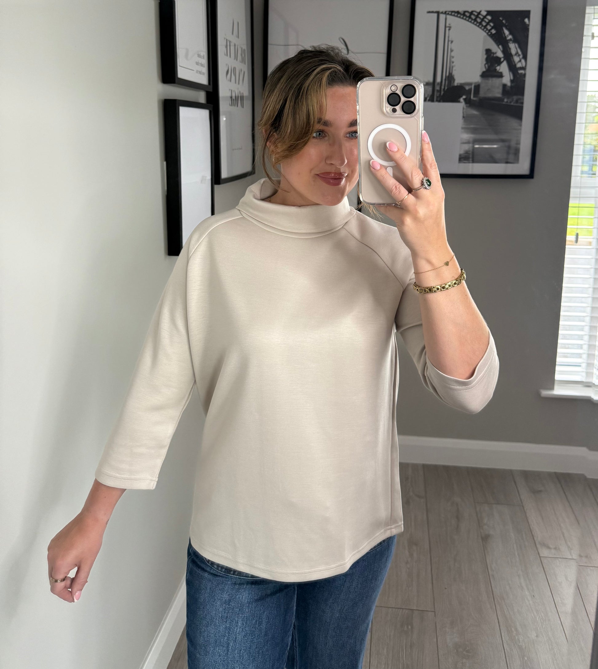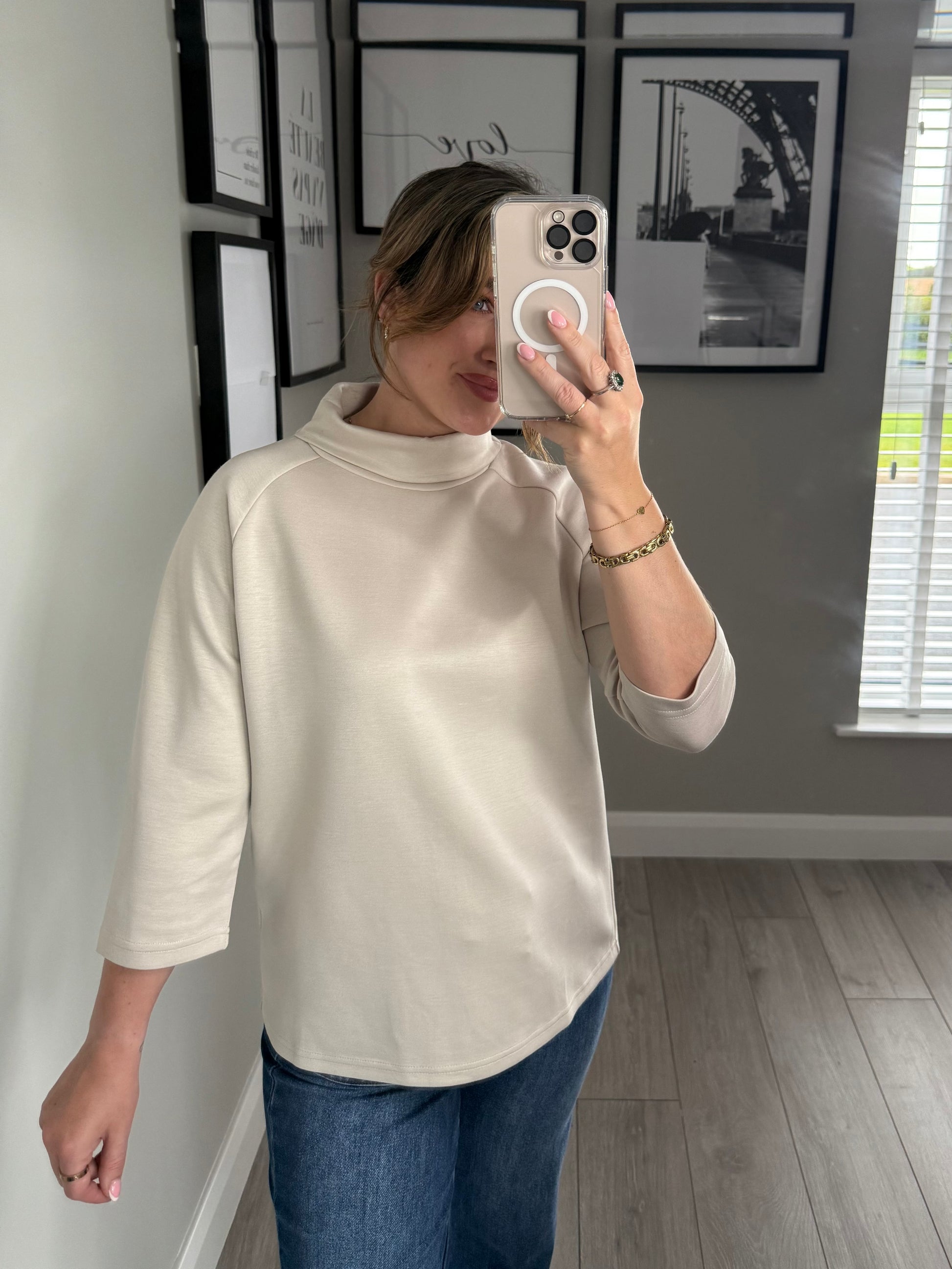 -MXO soft beige travel fabric top with cowl neckline, three quarter length sleeves & tortoiseshell button detailing to the back.