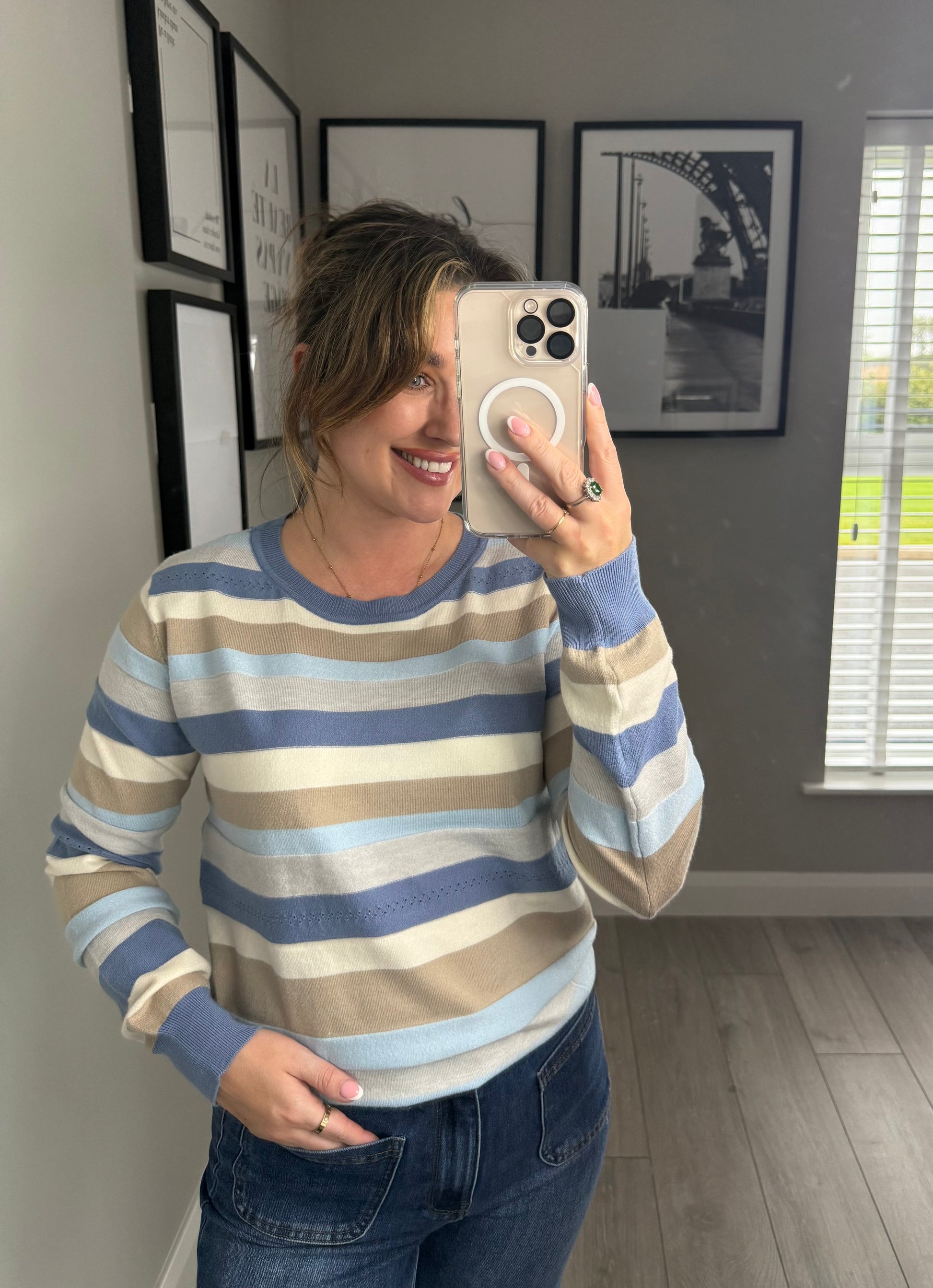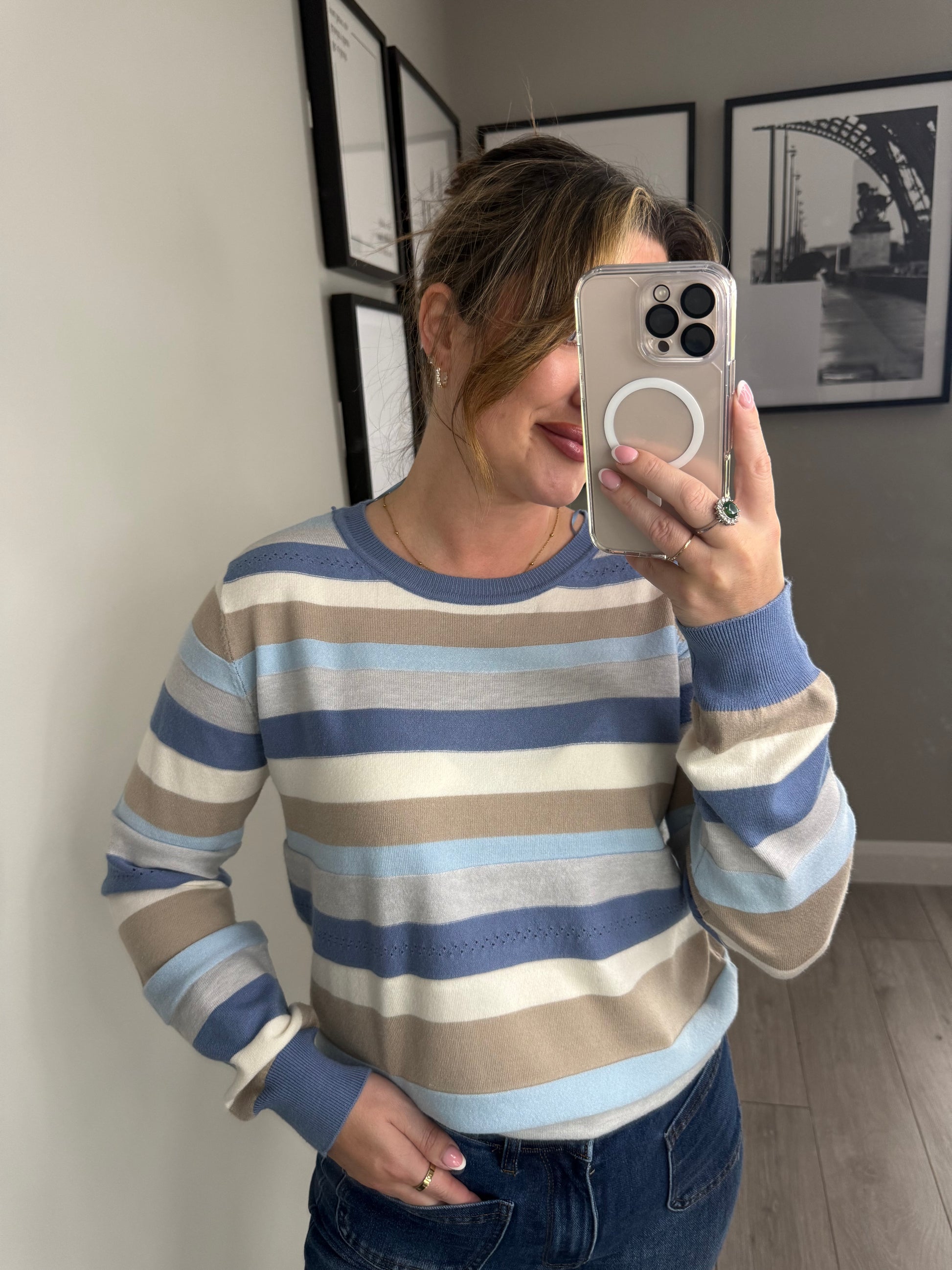 -Jessica Graaf blue multi (with cream, beige & grey) stripe jumper with round neckline & cuffed sleeves.