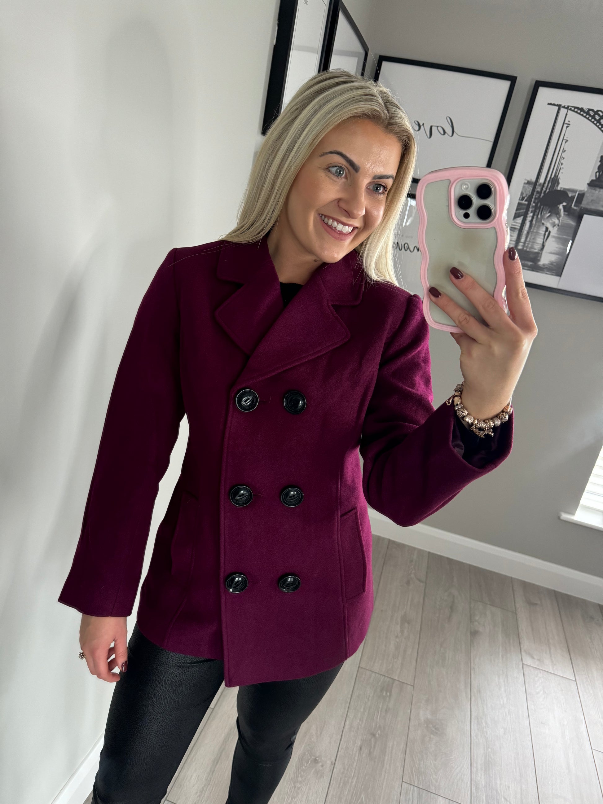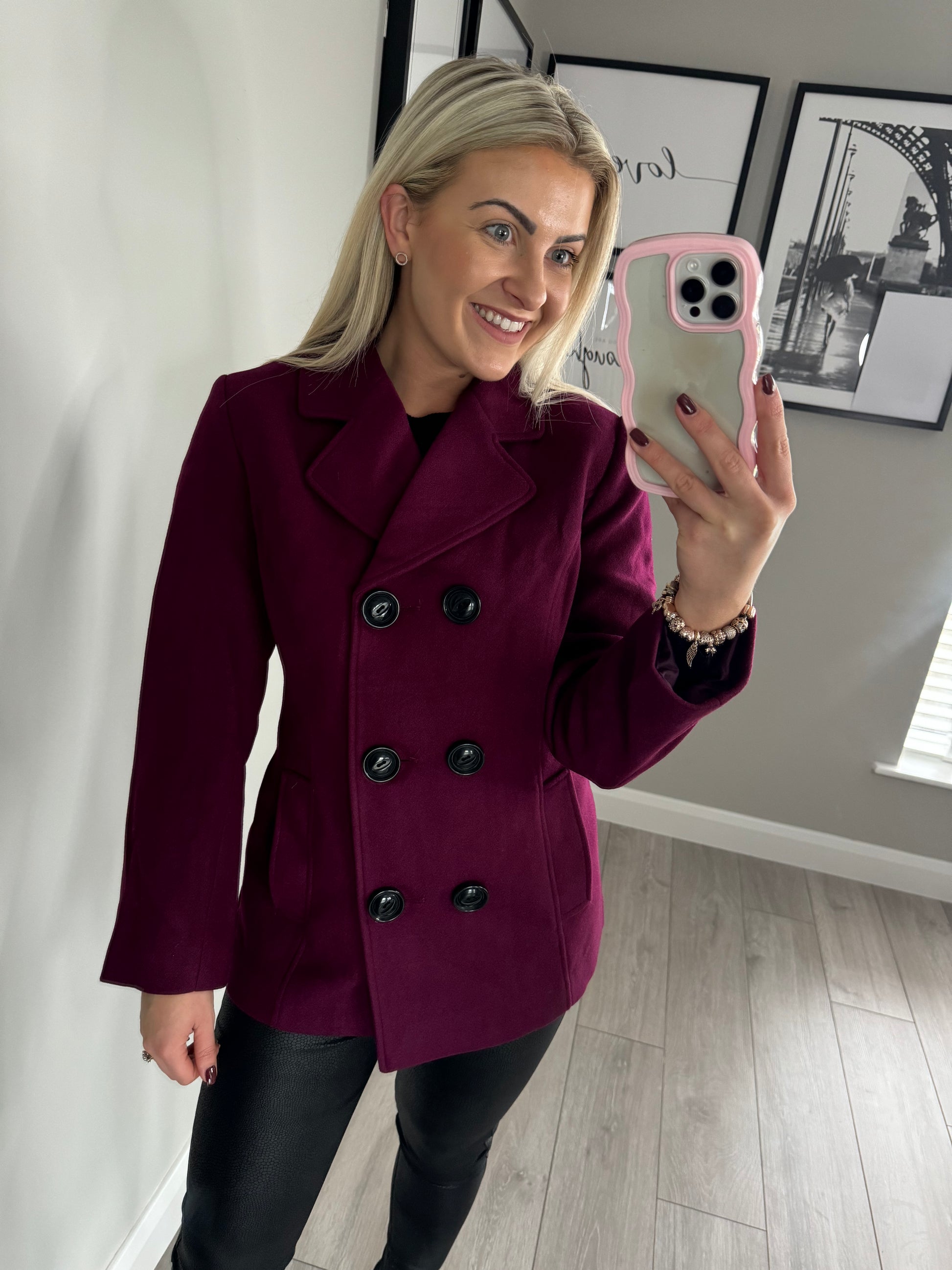 -Classic double breasted coat in burgundy with black buttons, flat lapel collar & double pockets.