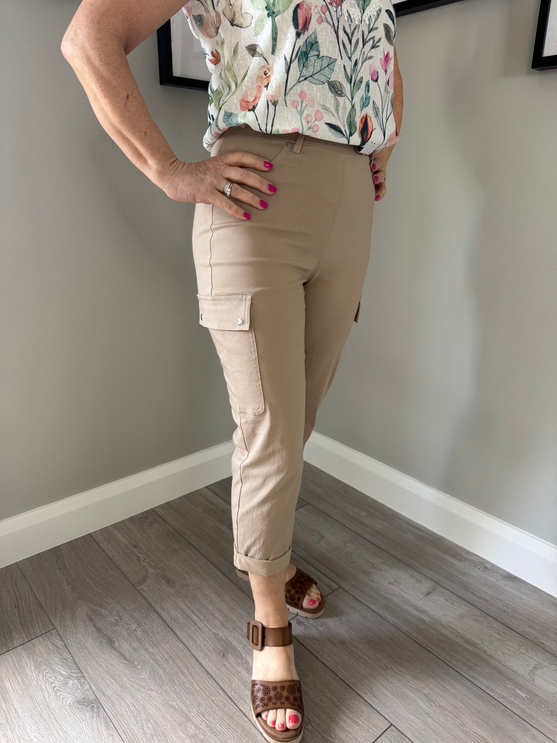 -Classic pull on bengaline crops (22 inch) with cargo style pockets & turn up hem detail.