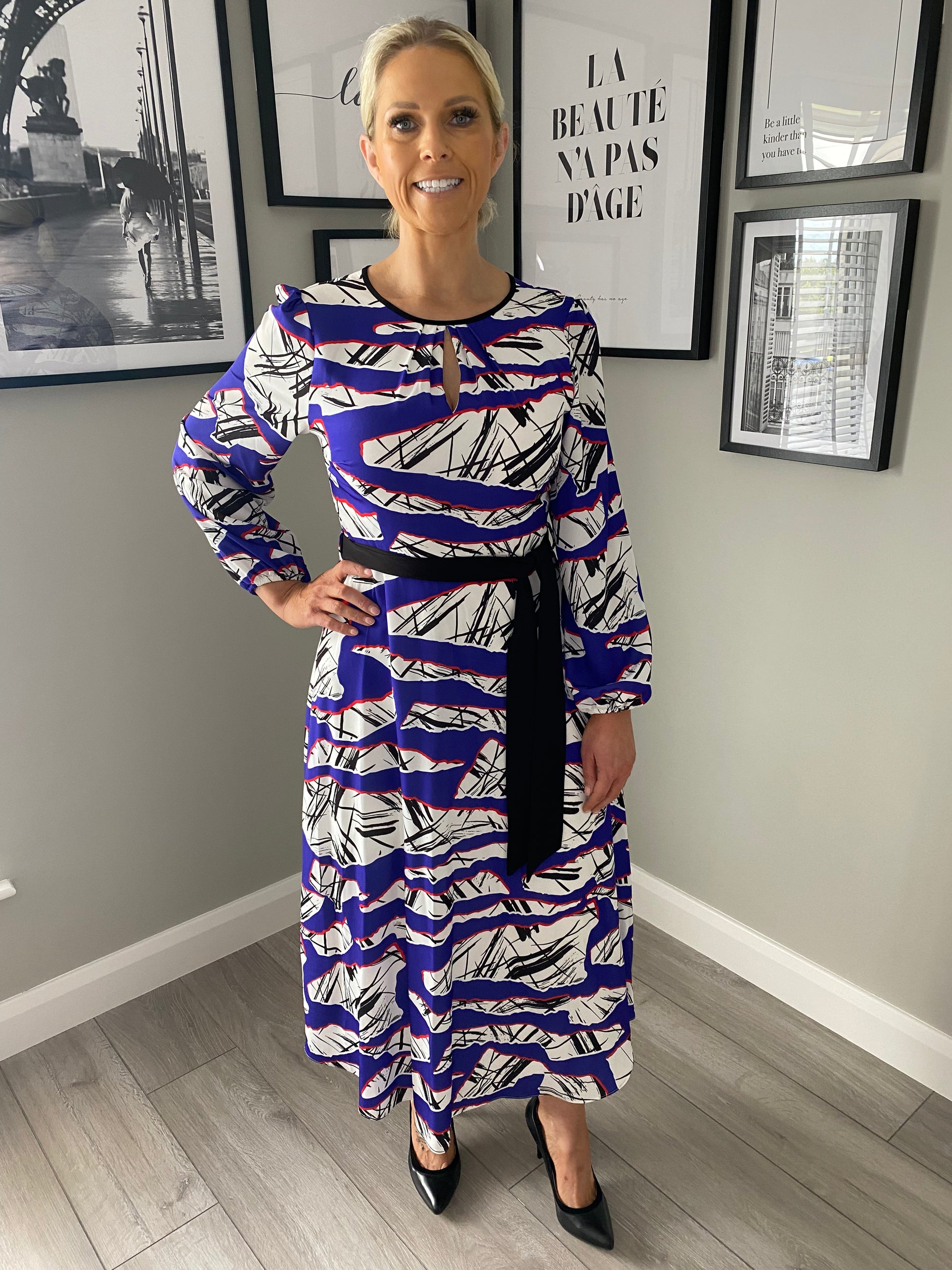 From the Ella Boo range we have this uniquely coloured print dress. It's in a deep purple with monochrome (black & white) print throughout & trimmed in red. It's got a keyhole neckline as well as full length cuffed sleeves & black waisted belt to clinch in the waist.