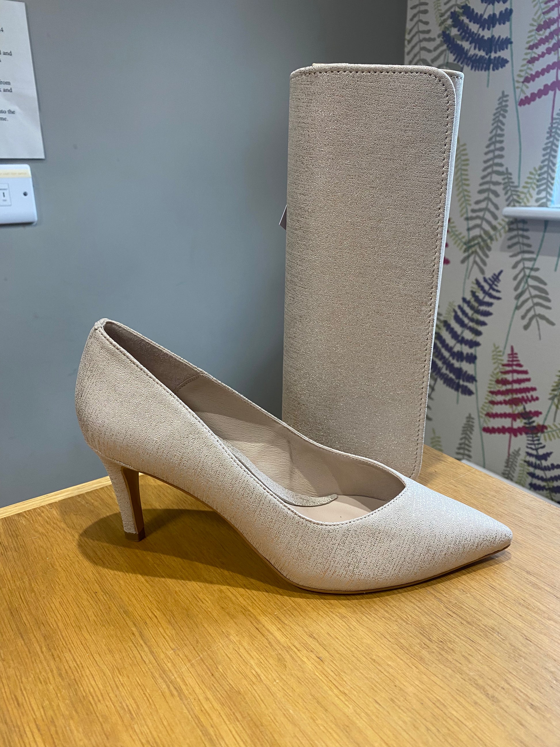 Emis Soft Leather Court Shoe with Pointed Toe, 3 inch Heel & Shimmer Finish