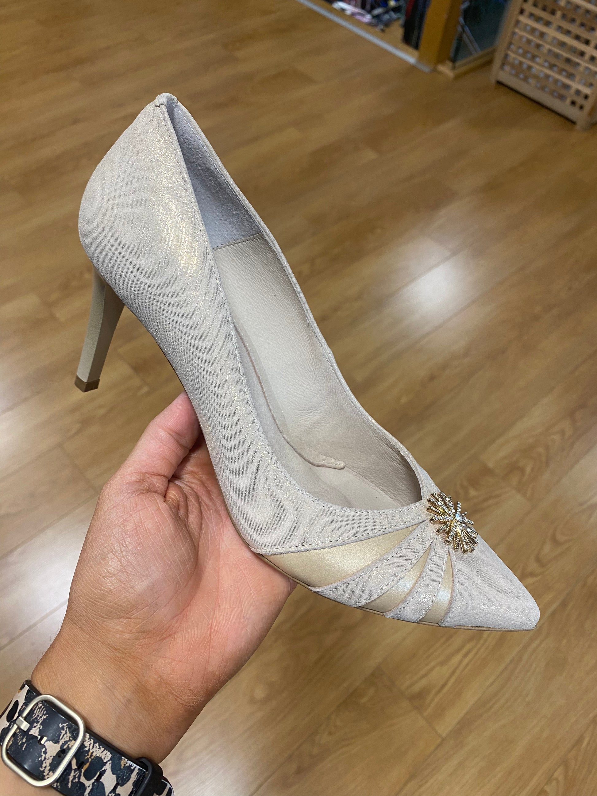 Emis Soft Leather Court Shoe with Two Toned Leather/Shimmer Design, Silver Brooch Front & 3.5 inch Heel