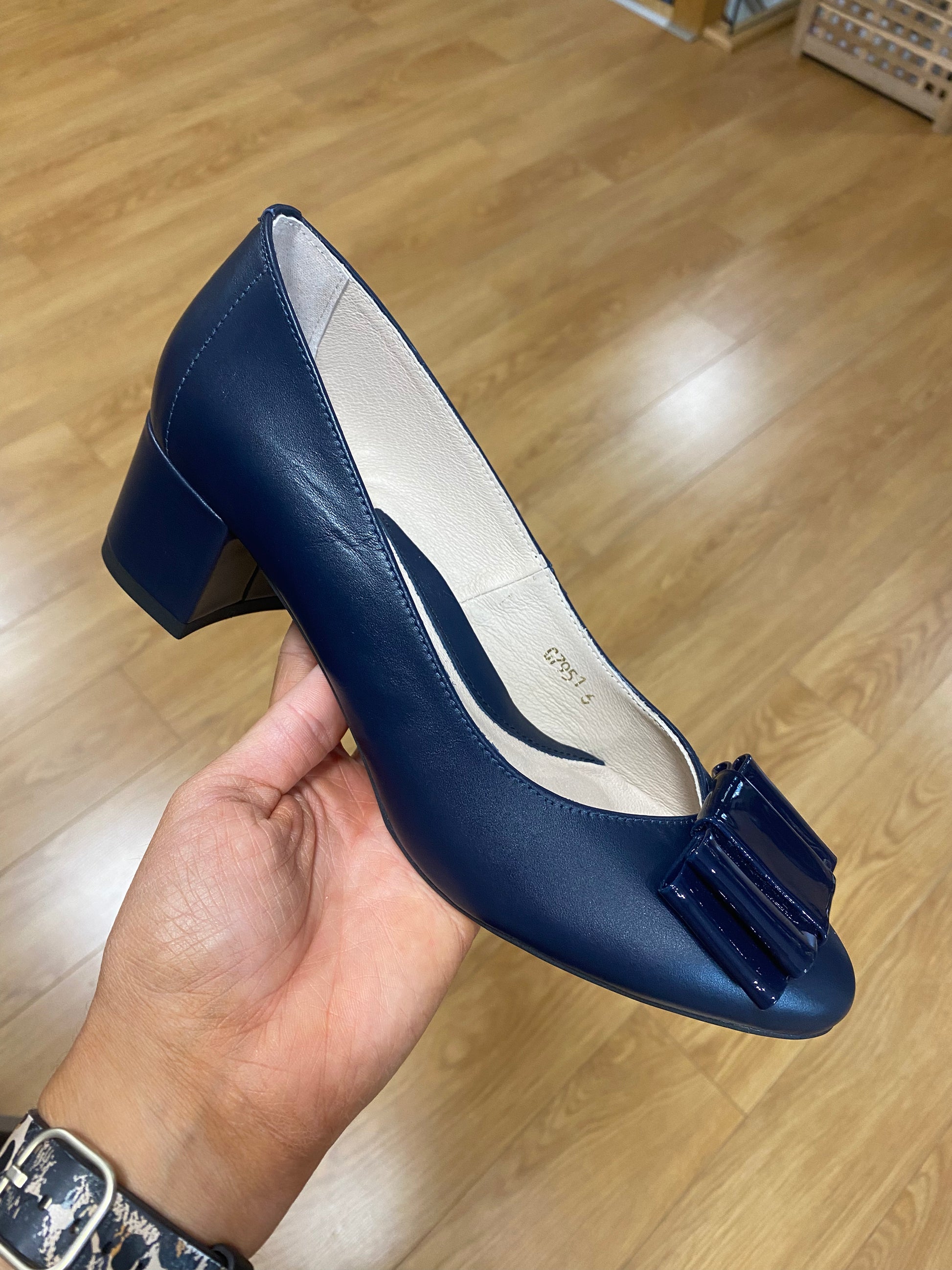 Emis Soft Leather Court Shoe in Leather Finish with Patent Bow Front & 1.75 inch Block Heel