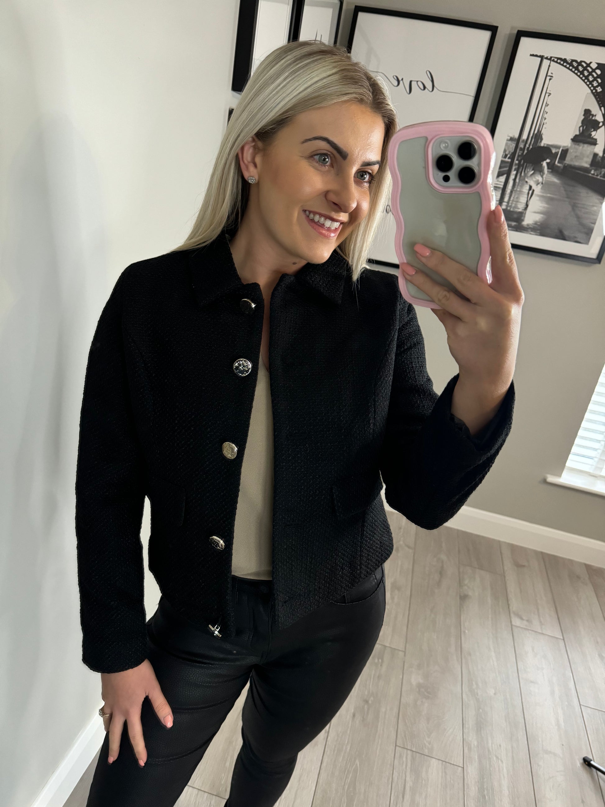 -Emreco short boucle style jacket in black. Finished with large gold buttons, small collar & imitation pocket detail