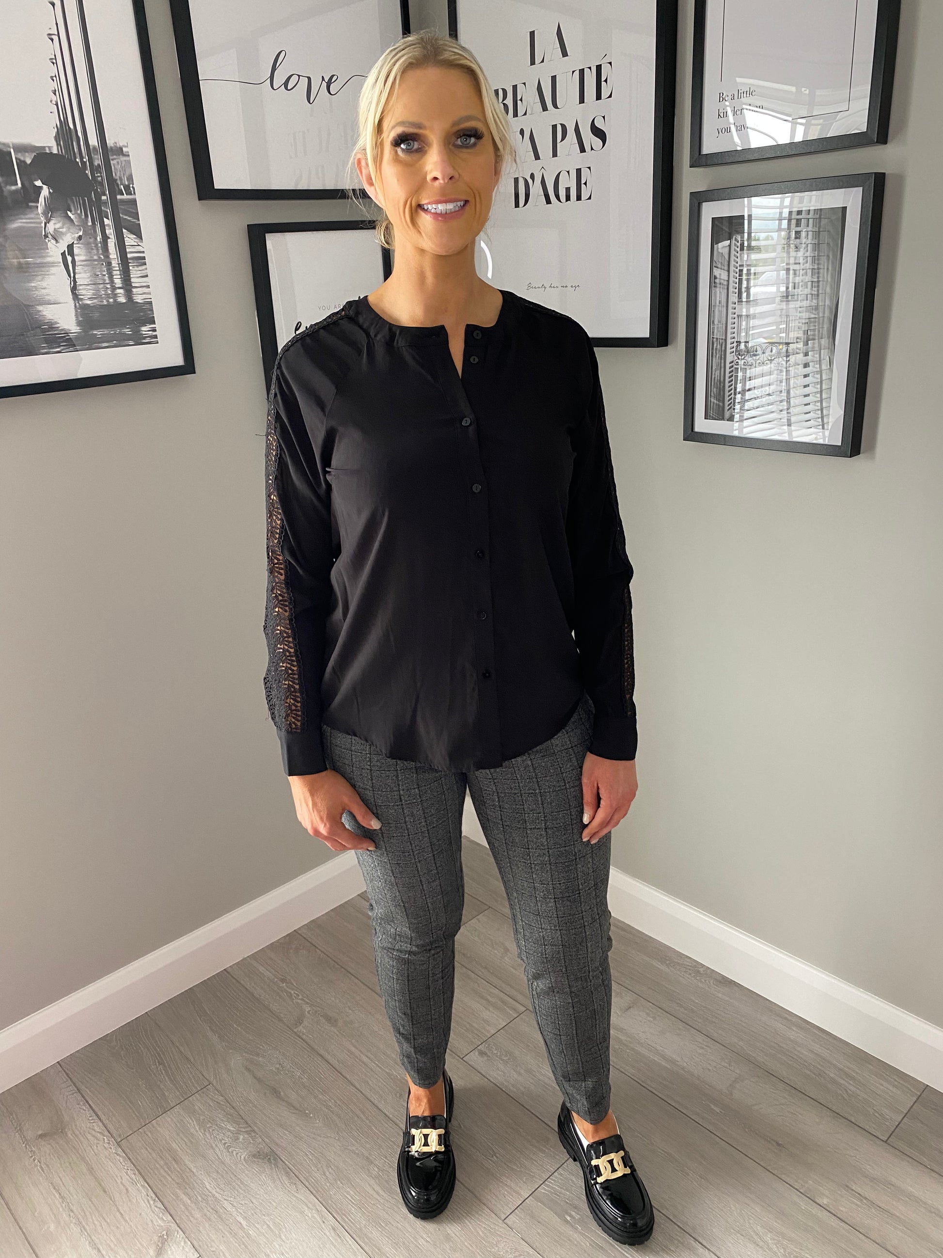 From the Freequent range a black blouse is a timeless essential! In light chiffon with V neckline & lace running down the centre of both sleeves this ones great for matching up with trousers & skirts for your outfit finishes. We've shown both tucked in & out.