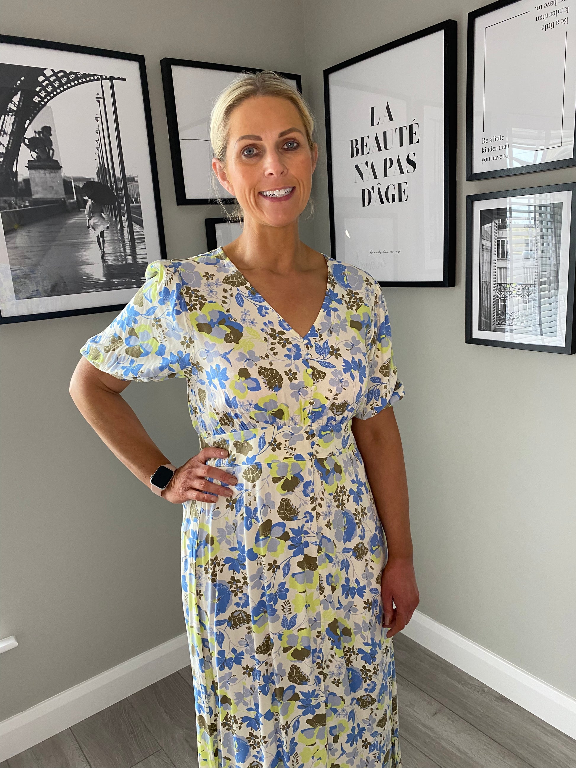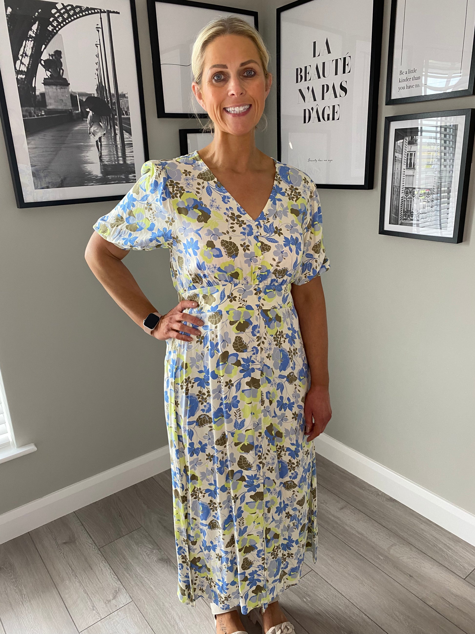 From the Freequent range we have our stunning blue multi coloured maxi style dress. With short elasticated puff sleeves & V neckline the dress is perfectly fitted to the waistline before dropping into a slightly flared skirt. It's a mix of blues & khakis on a soft cream base. Perfect for holidays or travelling. We've teamed it our Redz cream chained sandals.