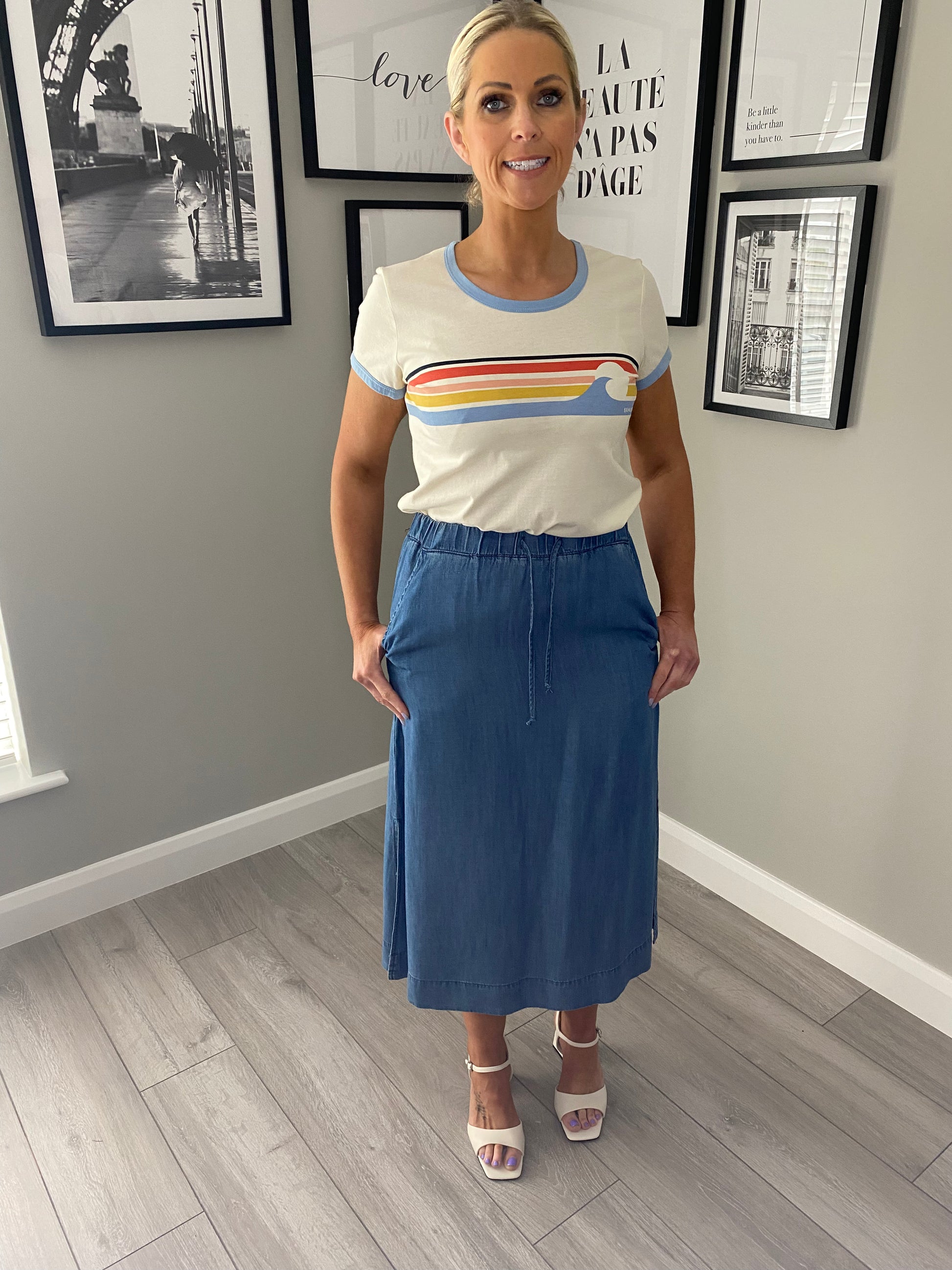From the Freequent range we've got our lightweight long denim skirt. With elasticated drawstring waist & double pockets it's ideal for wee flat sandals for a day on holidays or a Summers day here! It's also got split sides for much freer of movements.