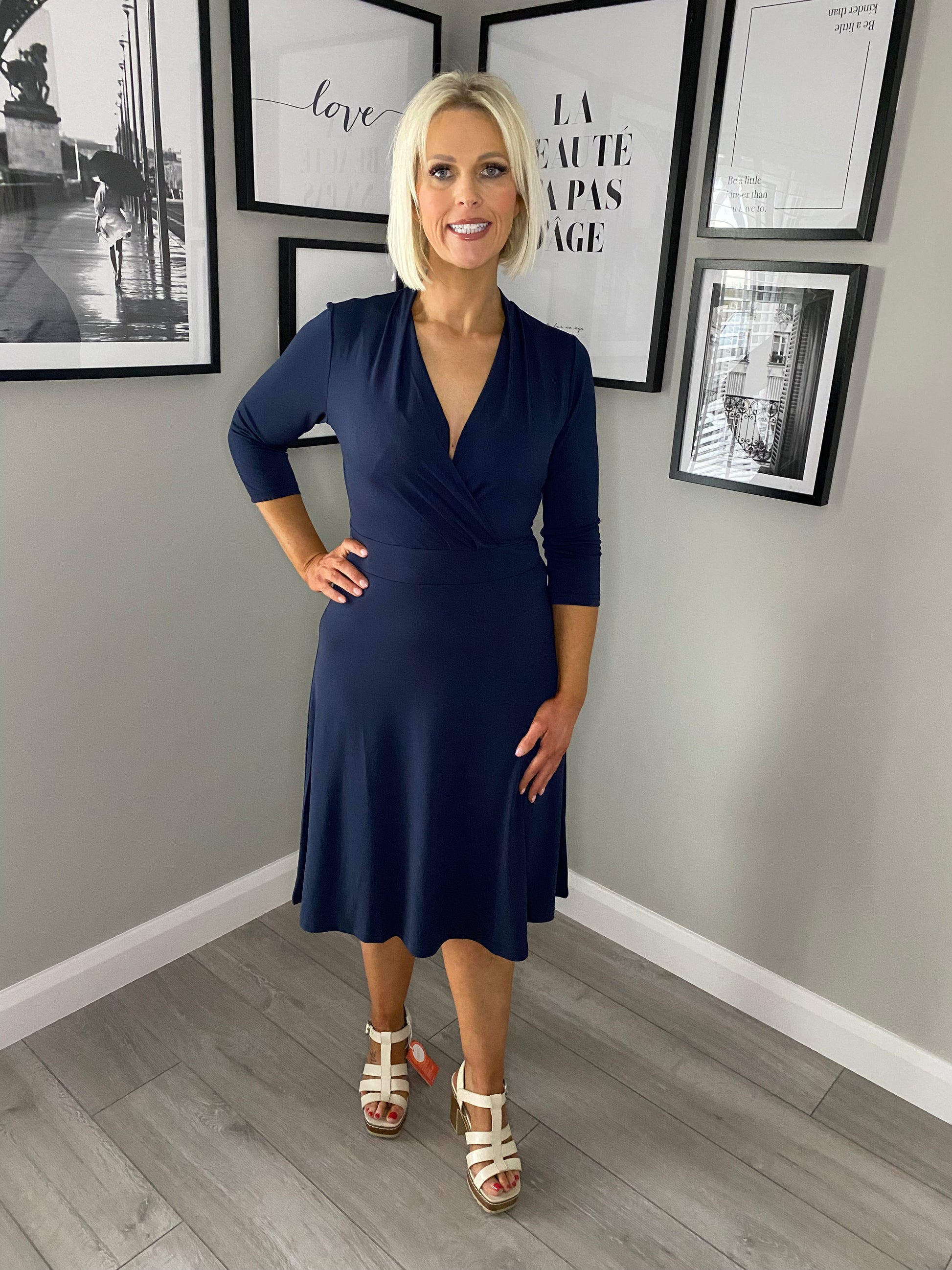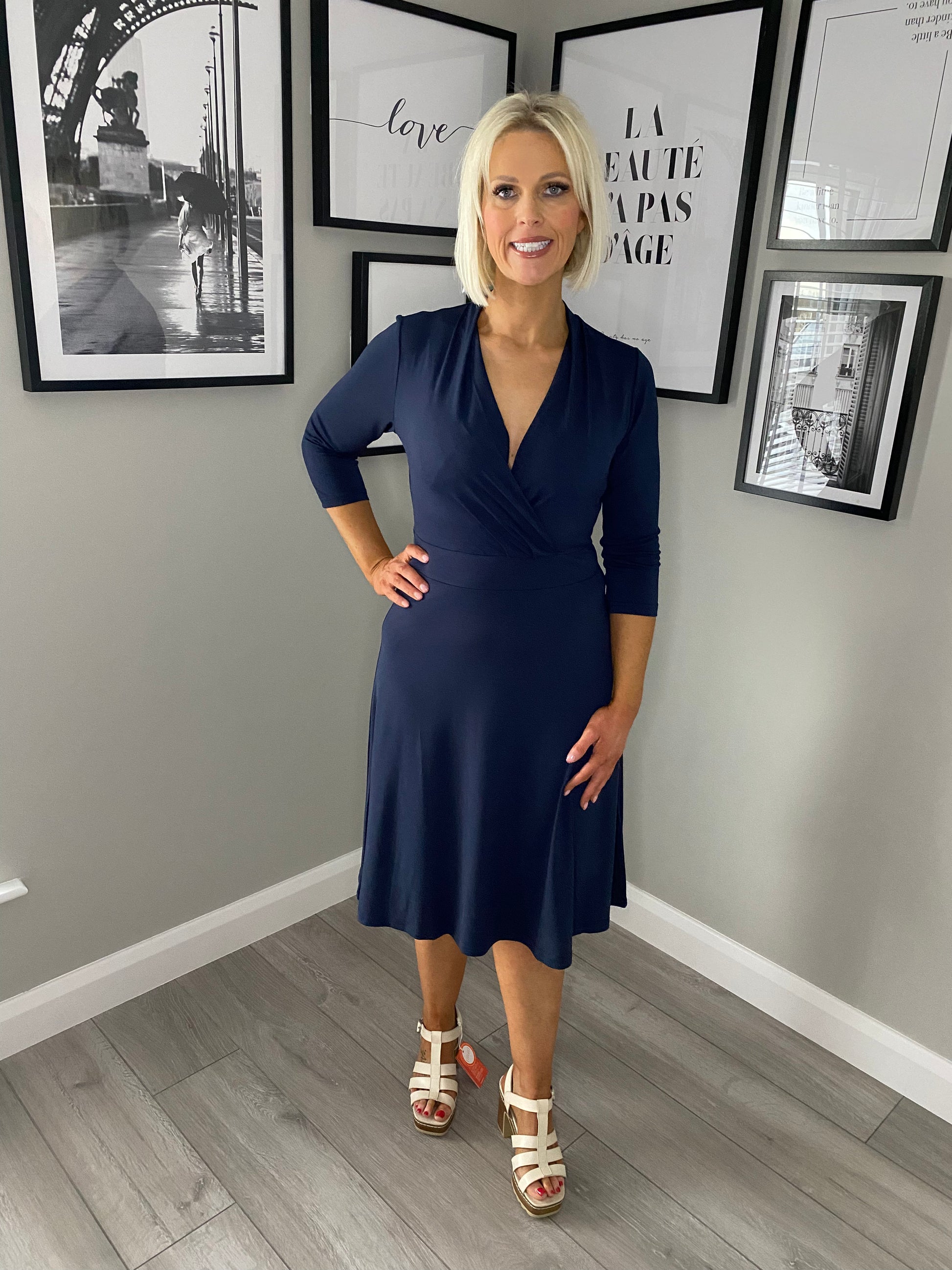 A wardrobe essential is a little swing dress! With light stretch it's both comfortable to wear & a sculpting fit. In basic deep navy it's got sculpting V neckline with light swing from the waist down. Style with or without tights.