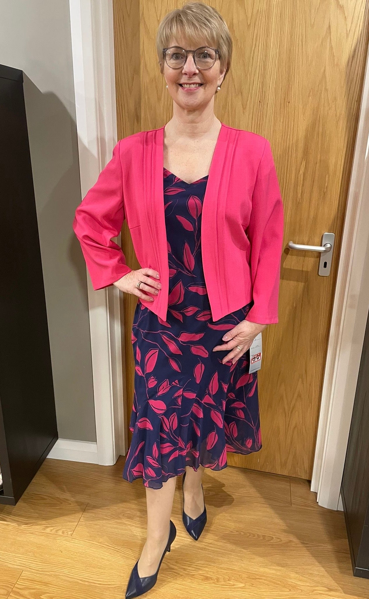 -Glitz two piece dress & jacket. Cerise pink & navy leaf print dress with cap sleeve & lightly pleated skirt. Jacket to match.