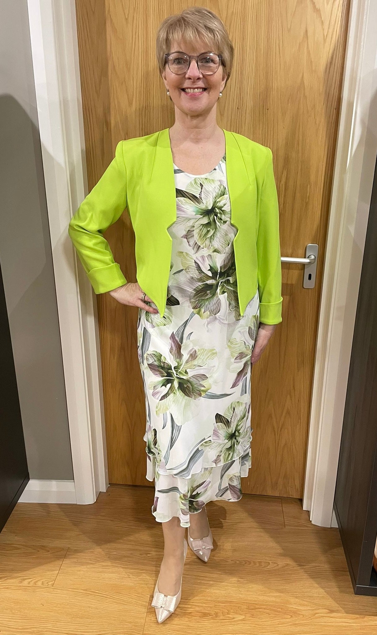 -Glitz two piece dress & jacket. Lime & white print dress with cap sleeve & lightly pleated skirt. Jacket to match.