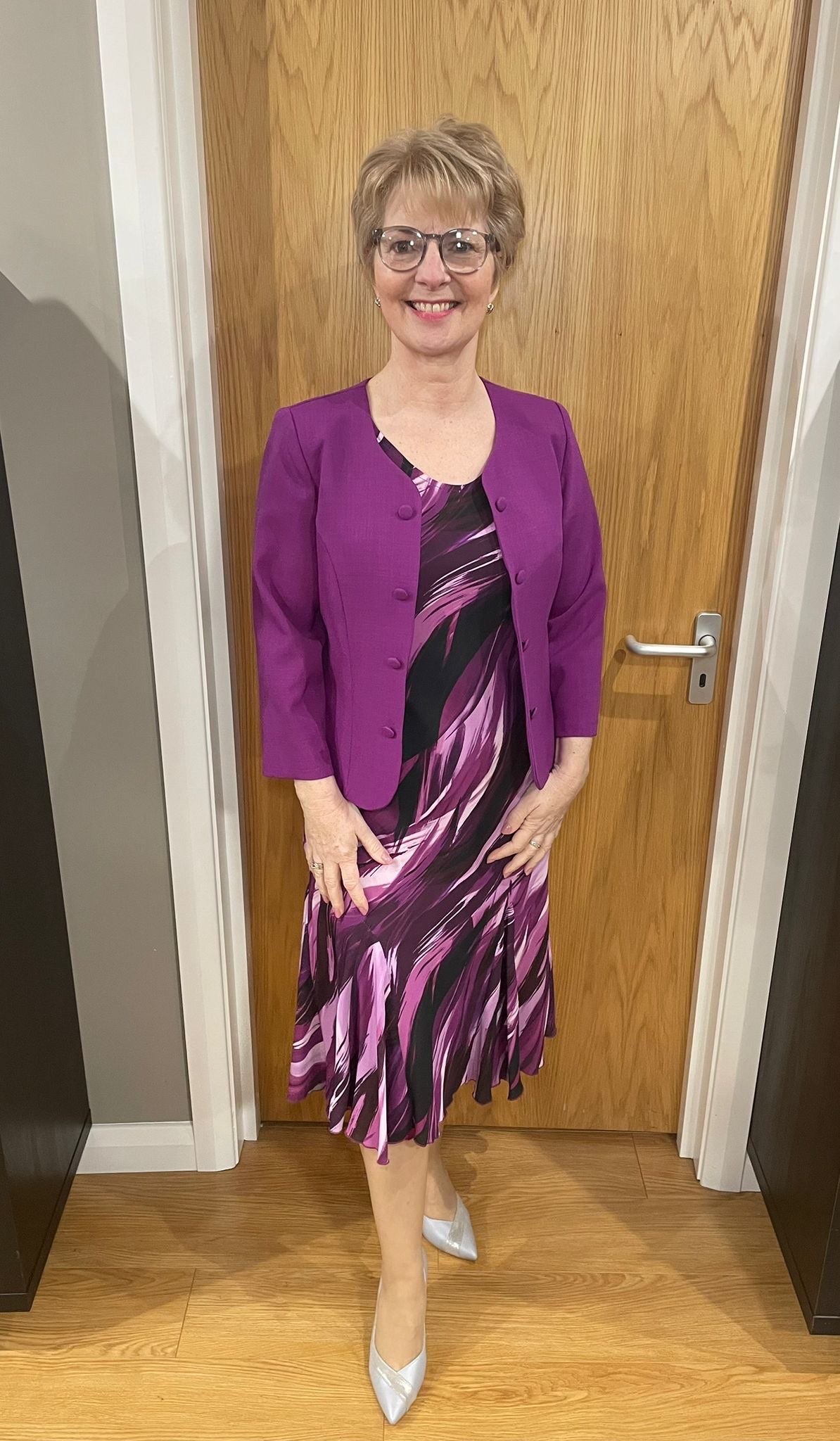 -Glitz two piece dress & jacket. Plum/blush multi dress with cap sleeve & lightly pleated skirt. Jacket to match.