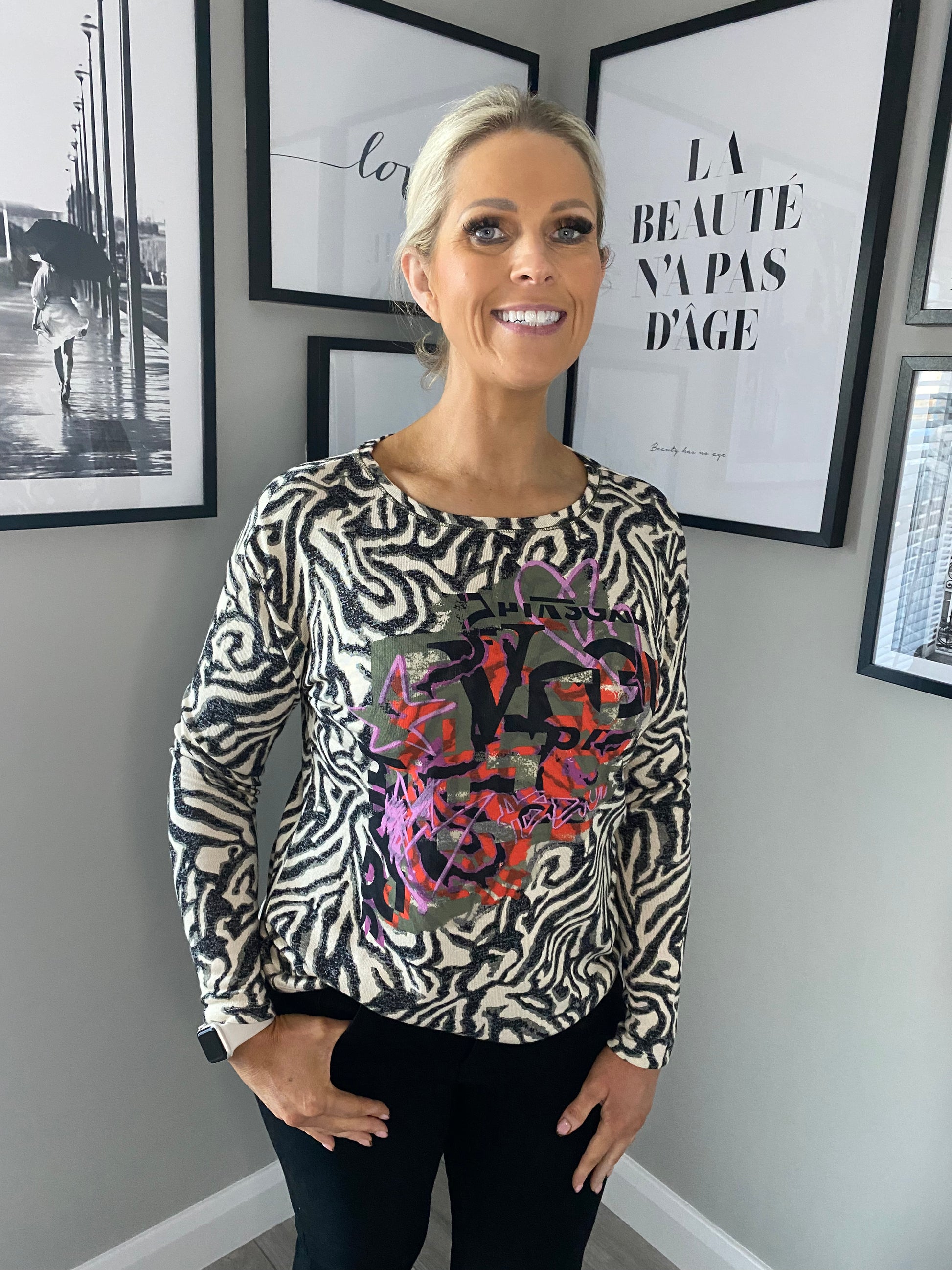 From the Barbara Lebek range this long sleeved soft touch fine jumper is beautifully on a cream base with two toned grey & khaki print throughout before being finished with multi coloured motif. The perfect match for our reversible green gilet.