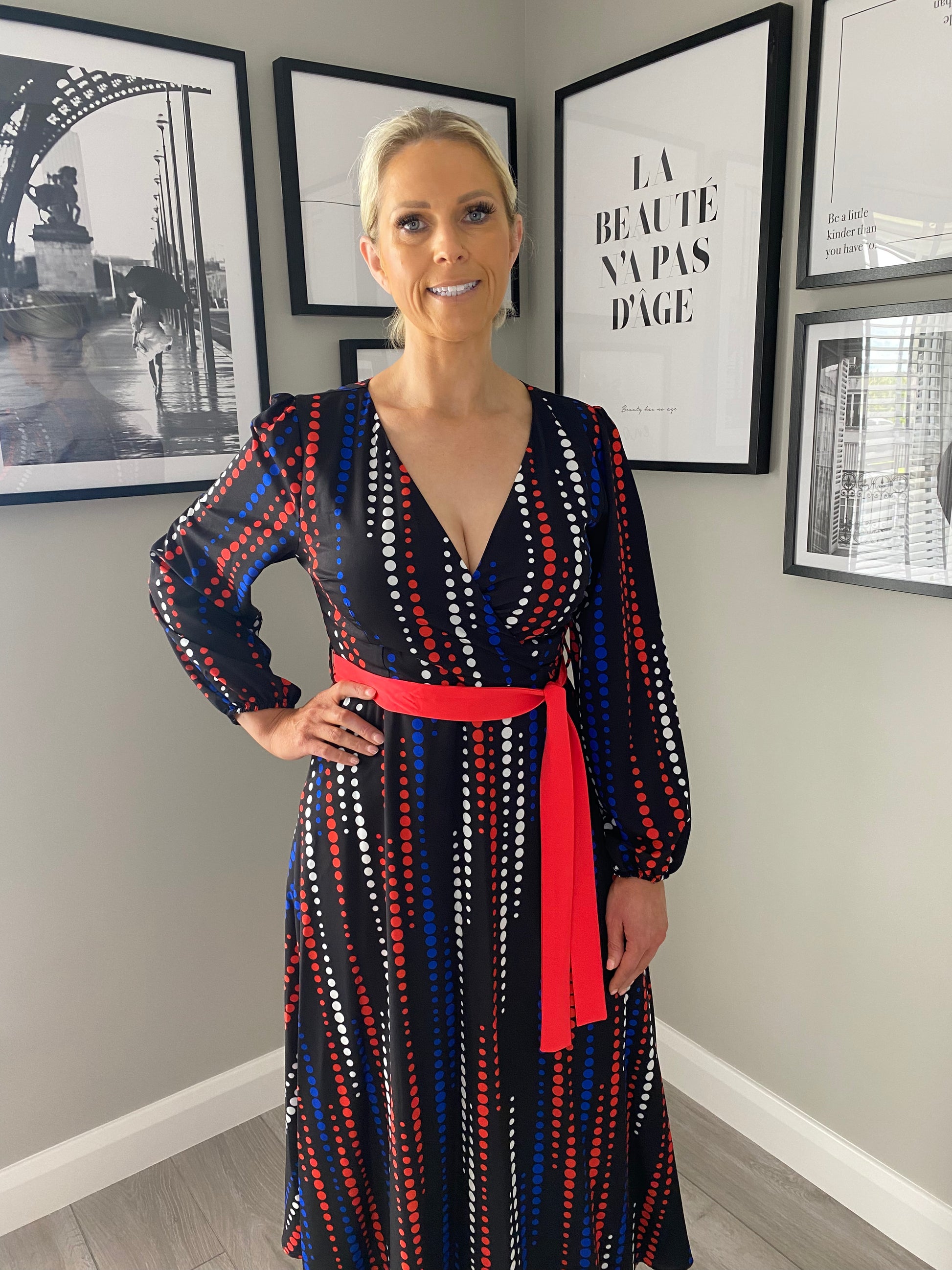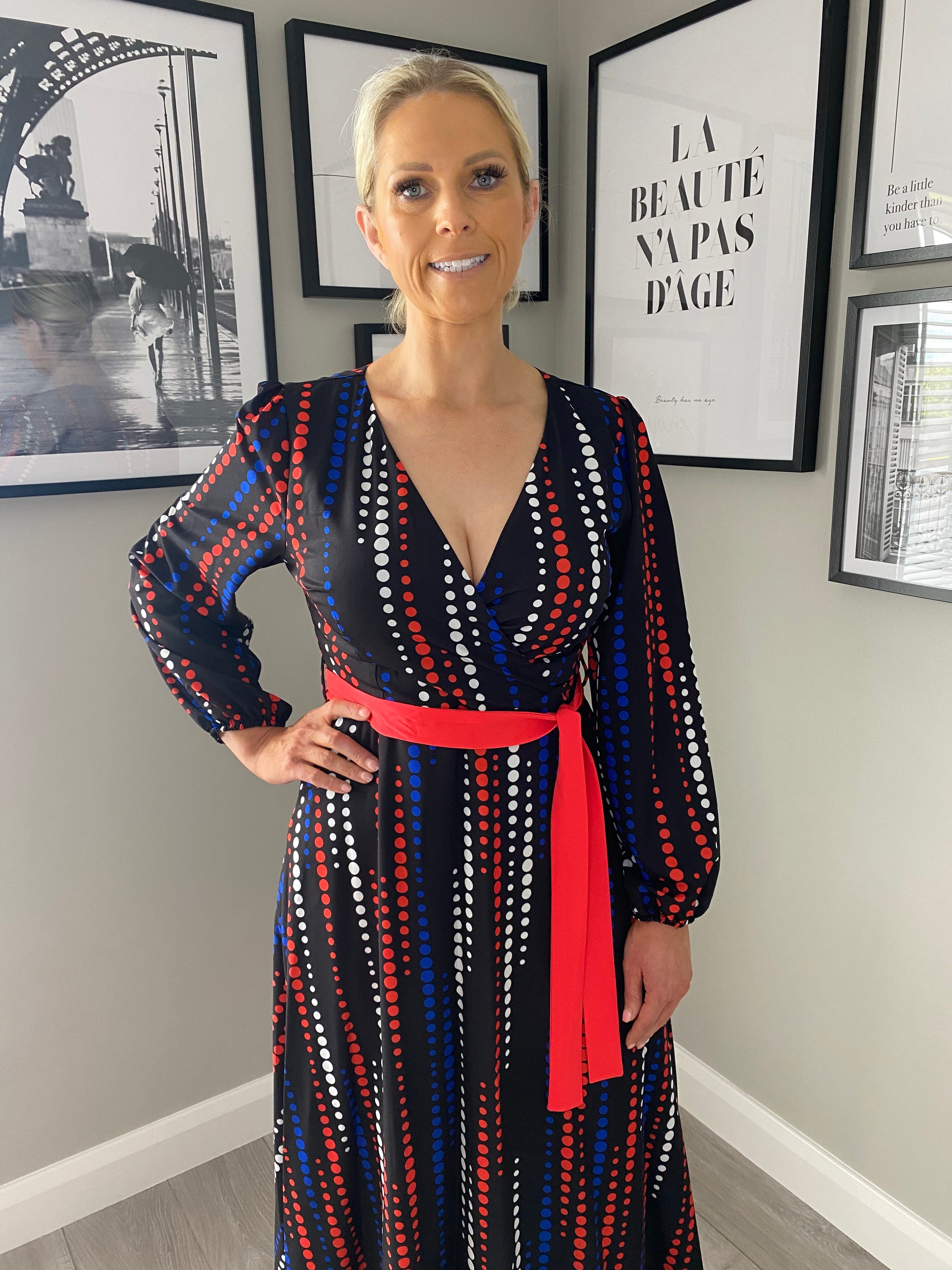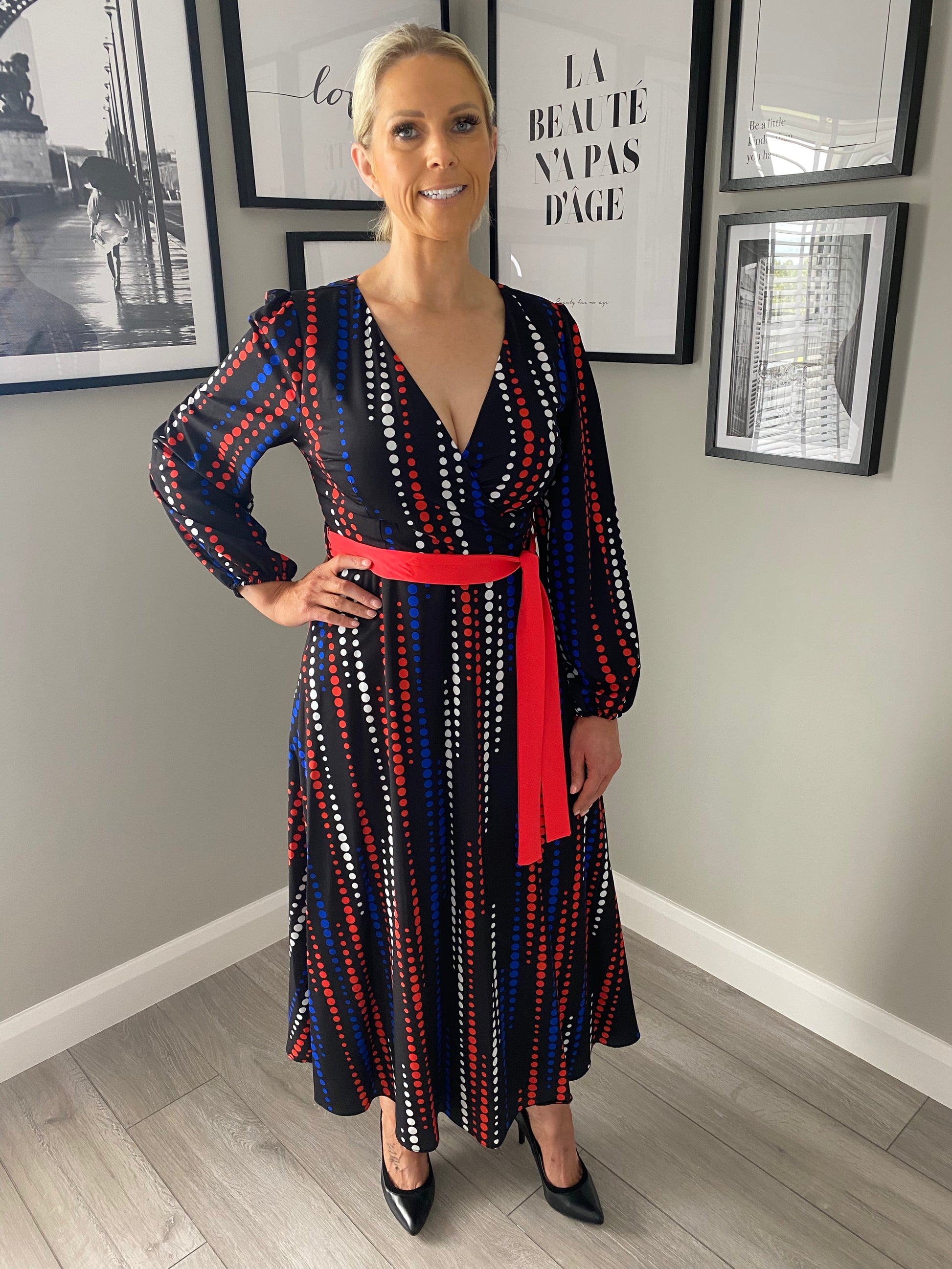 From the Lizabella range this is spots with a difference! On a black background it's covered with vertically arranged lines of white, red & royal blue spots to elongate the body. It's got a V neckline as well as full length cuffed sleeves & black waisted belt to clinch in the waist.