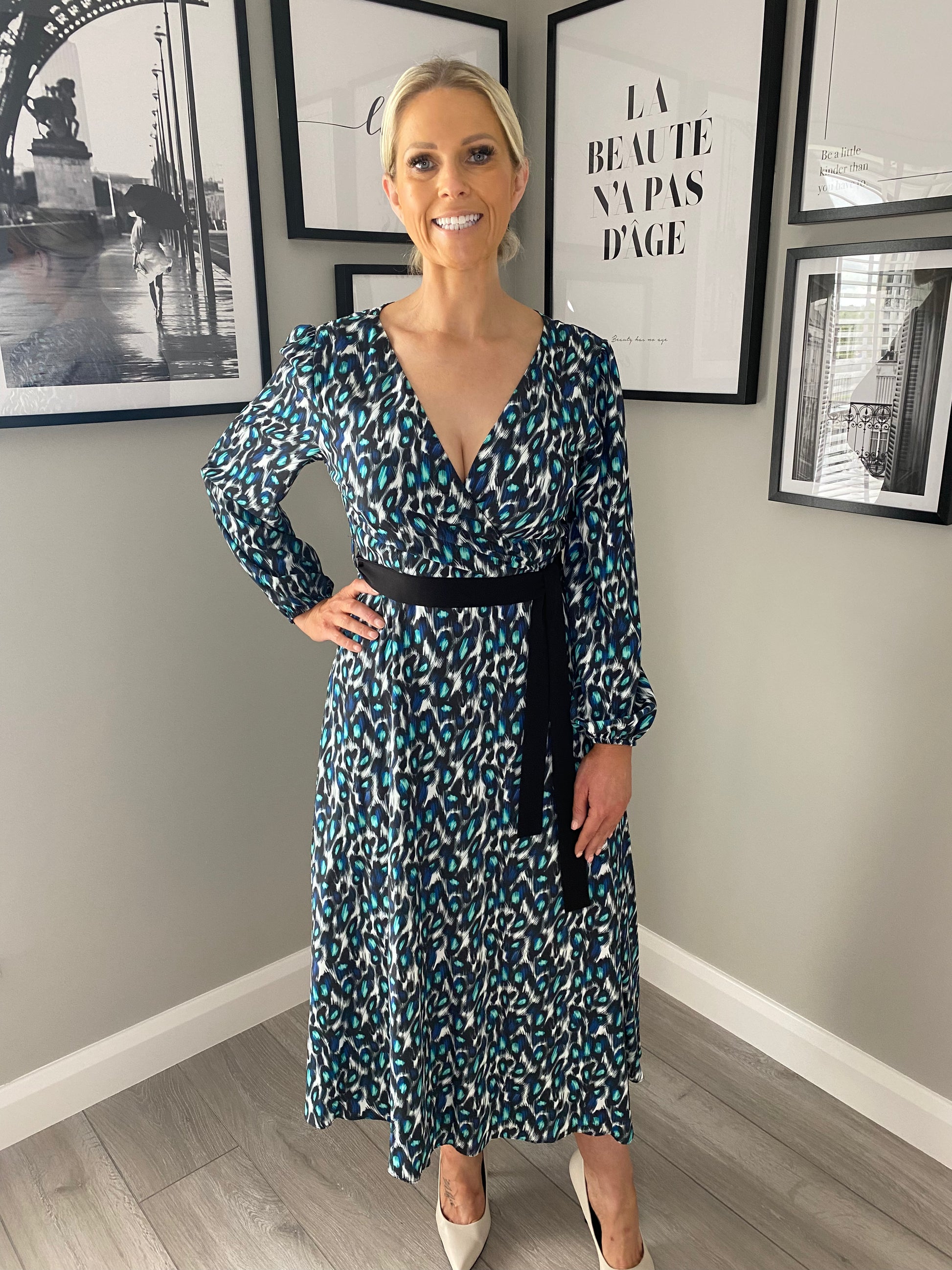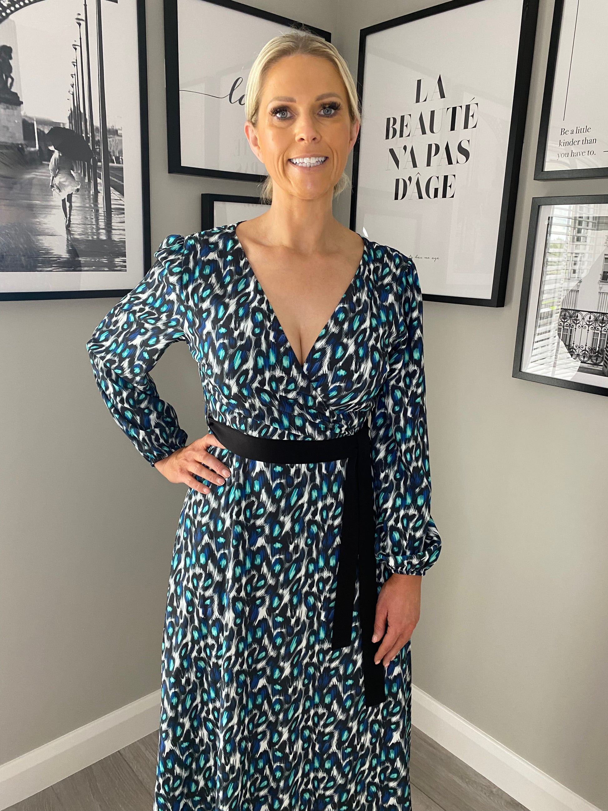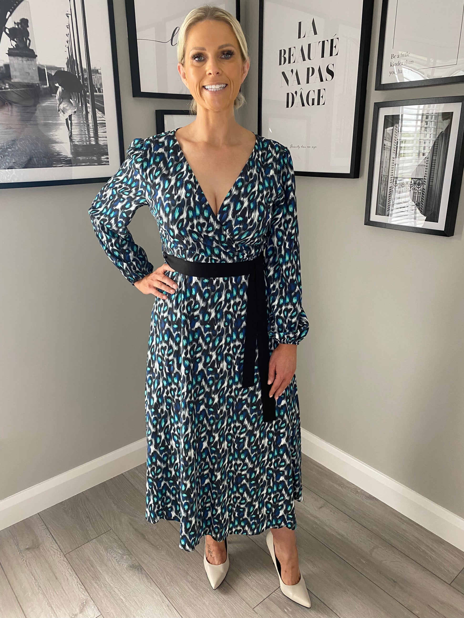 From the Lizabella range this is leopard print with a difference! With black & white leopard throughout its centred with aqua green & blue for that pop of colour. It's got a V neckline as well as full length cuffed sleeves & black waisted belt to clinch in the waist.