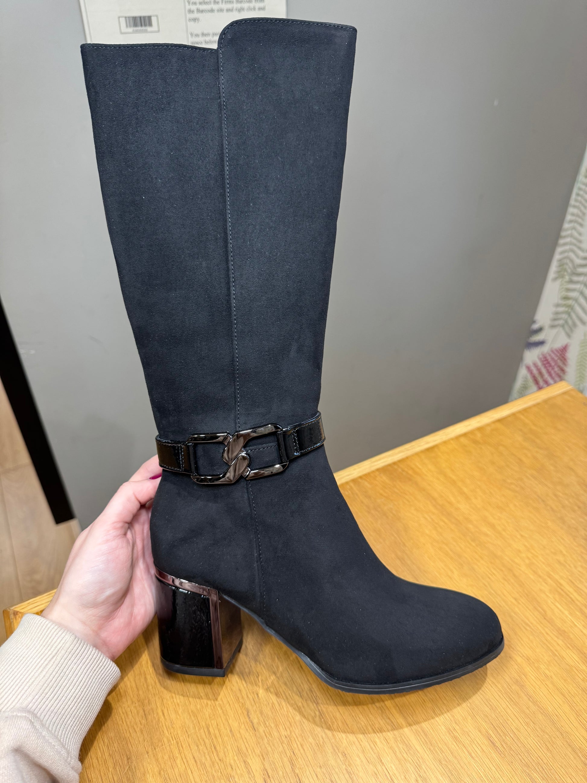 Lotus Block Heeled Knee Boot in Suede Finish with Gunmetal Buckle Design