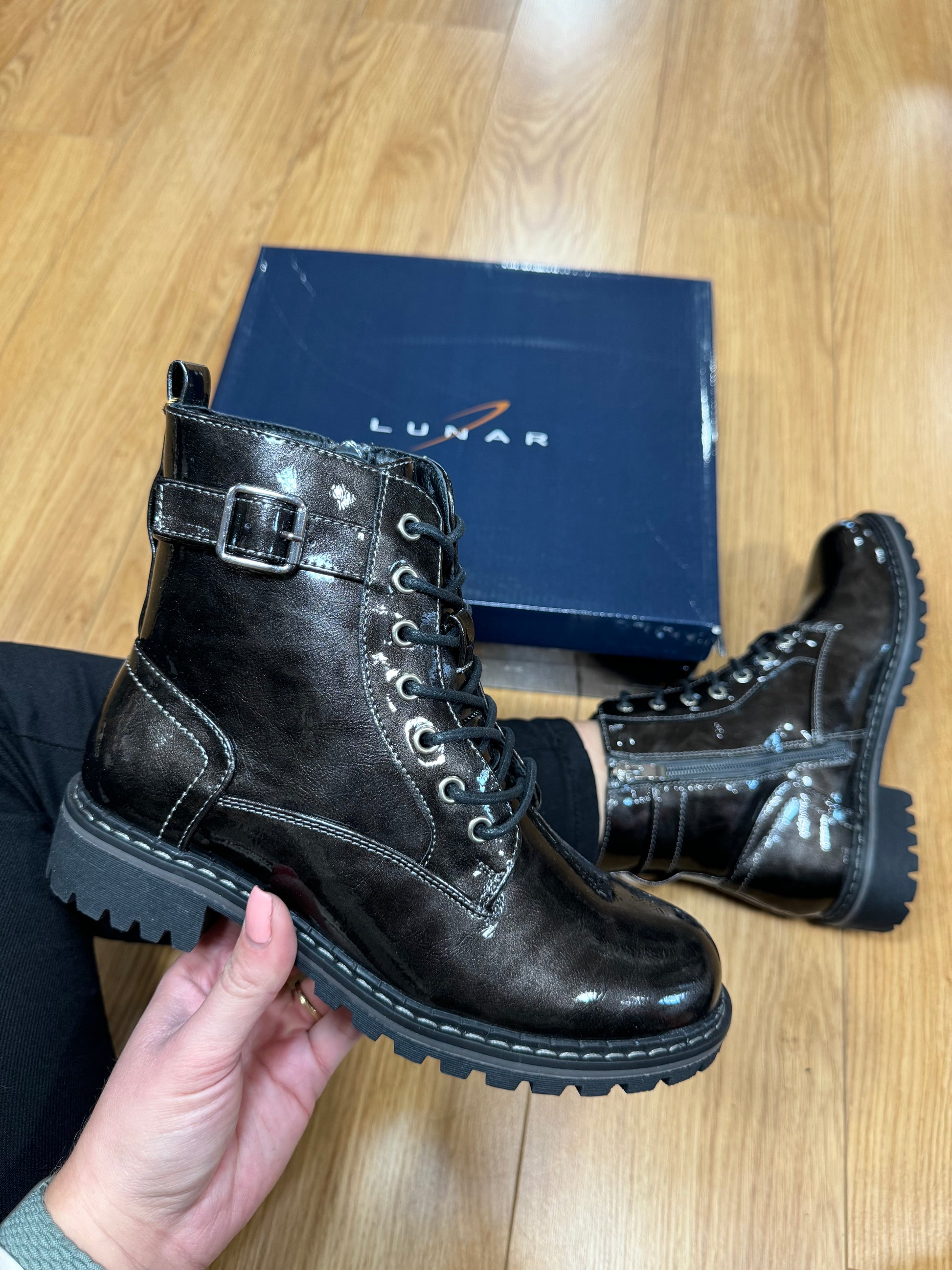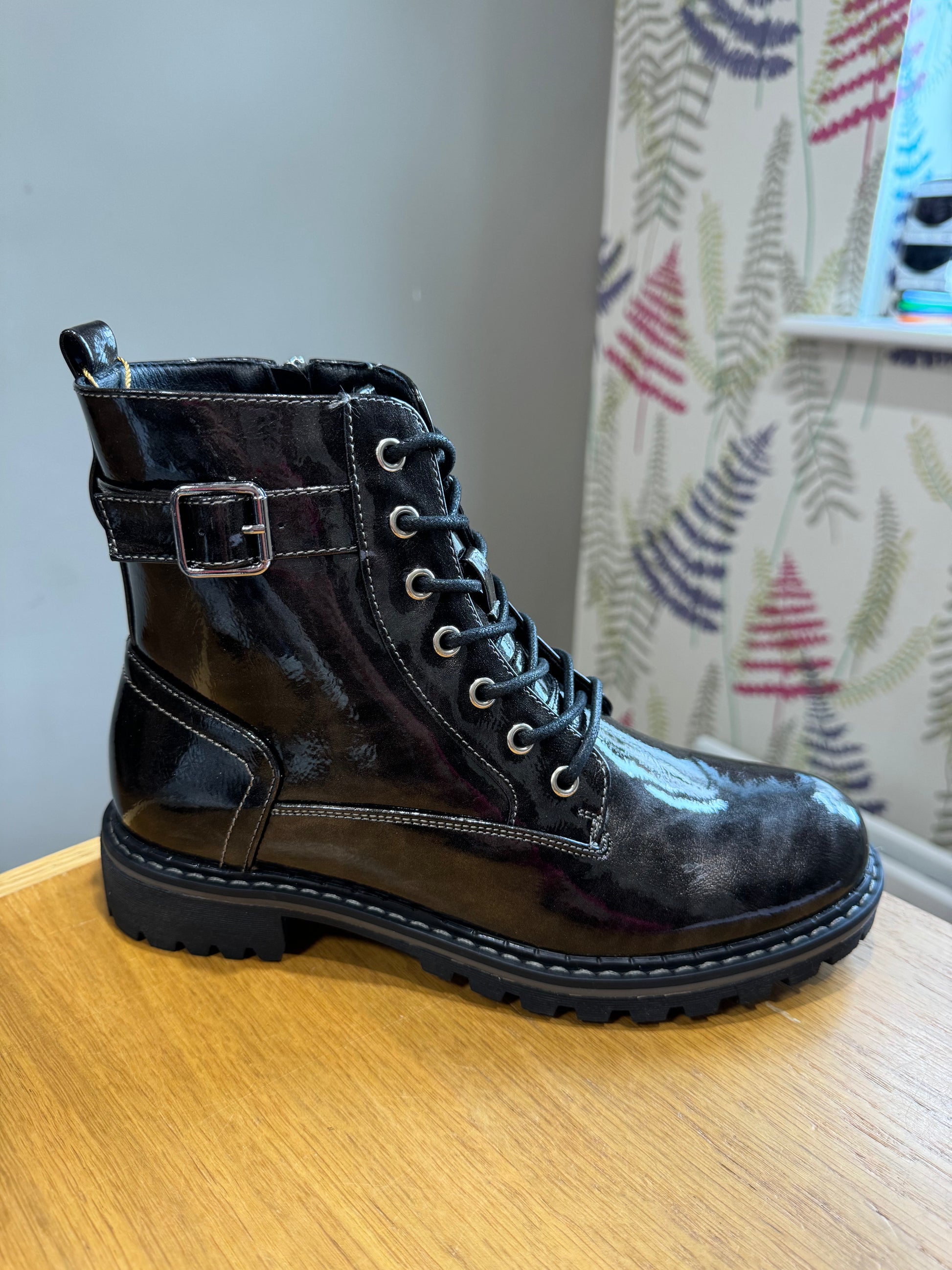 Lunar Lace Up Biker Style Boot (Inside Zip Opening) in Patent Finish & Buckle Detail