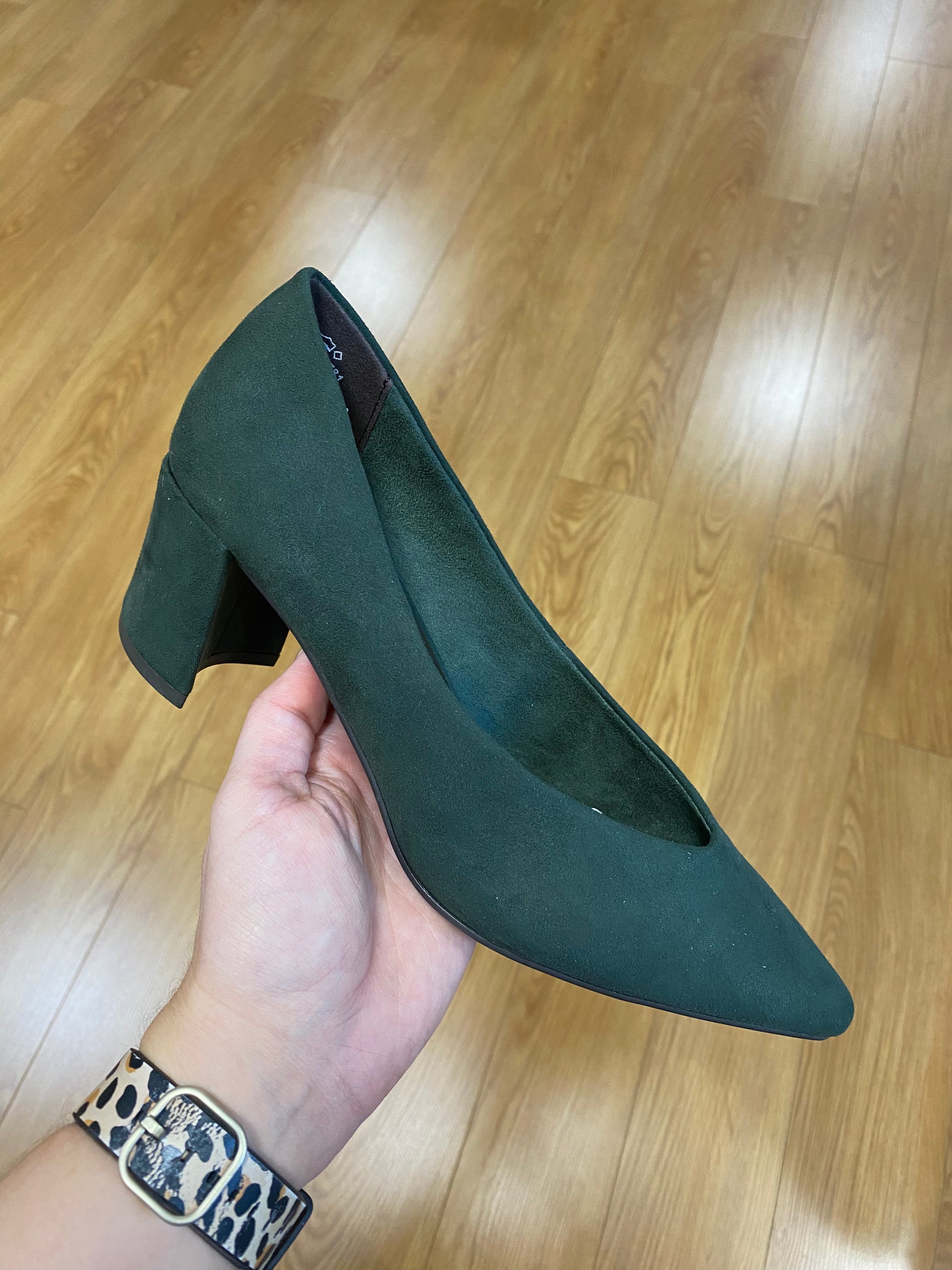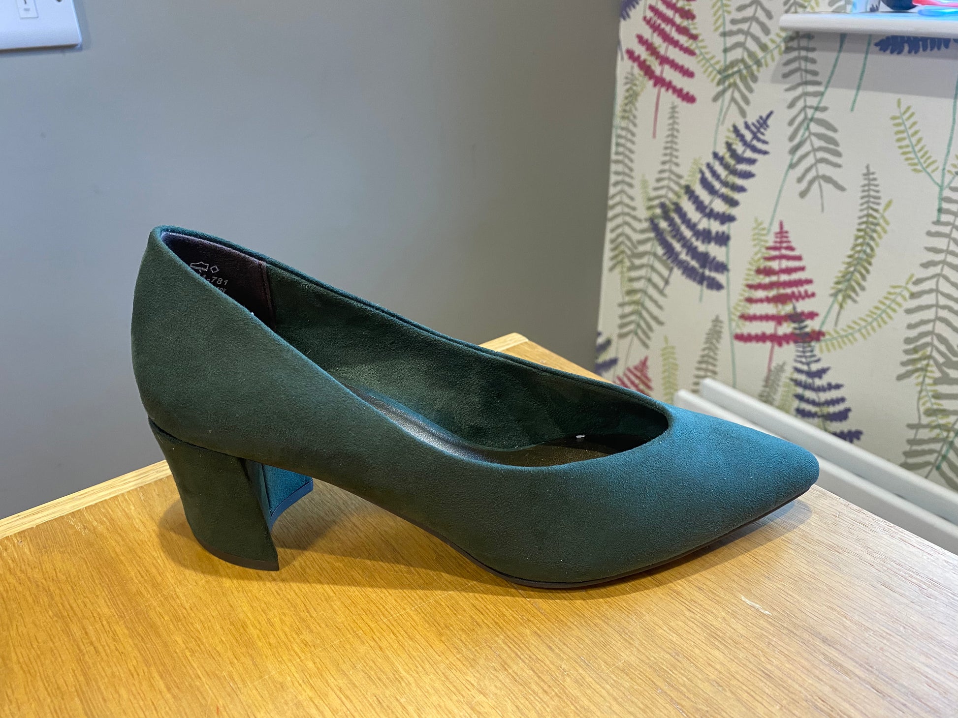 Marco Tozzi Triangular Block Heel Court Shoe with Pointed Toe in Suede Finish