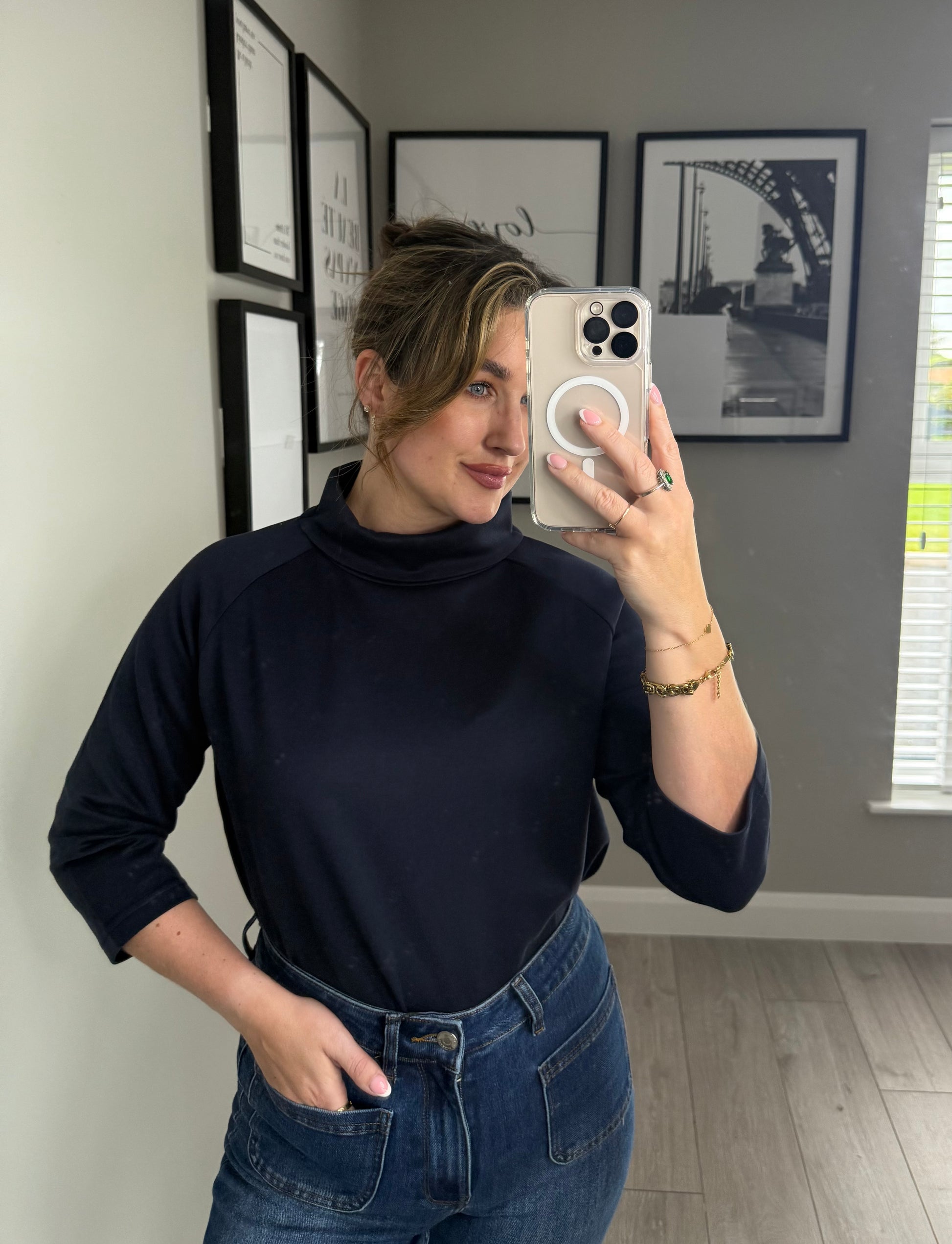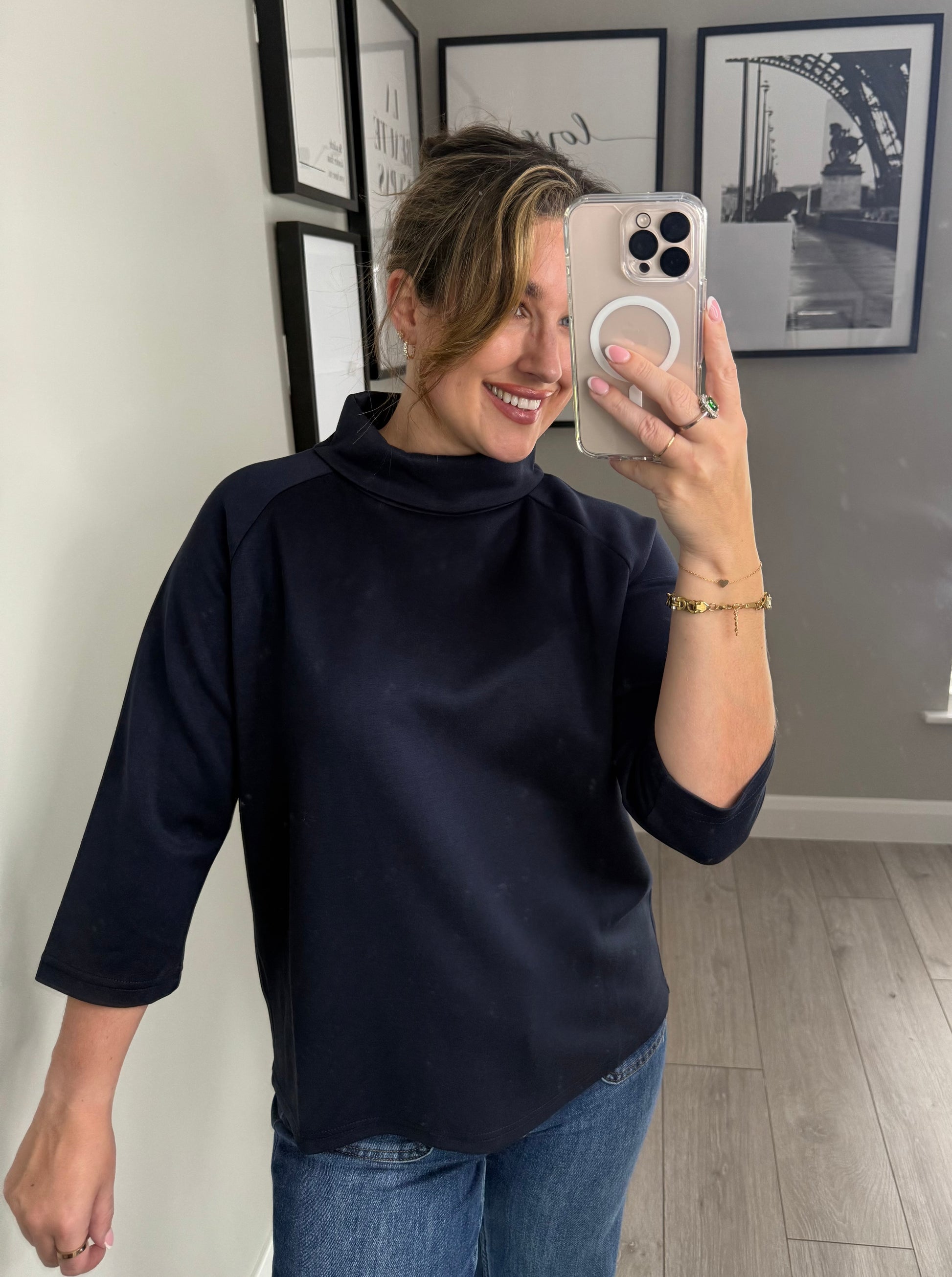 -MXO deep navy travel fabric top with cowl neckline, three quarter length sleeves & tortoiseshell button detailing to the back.