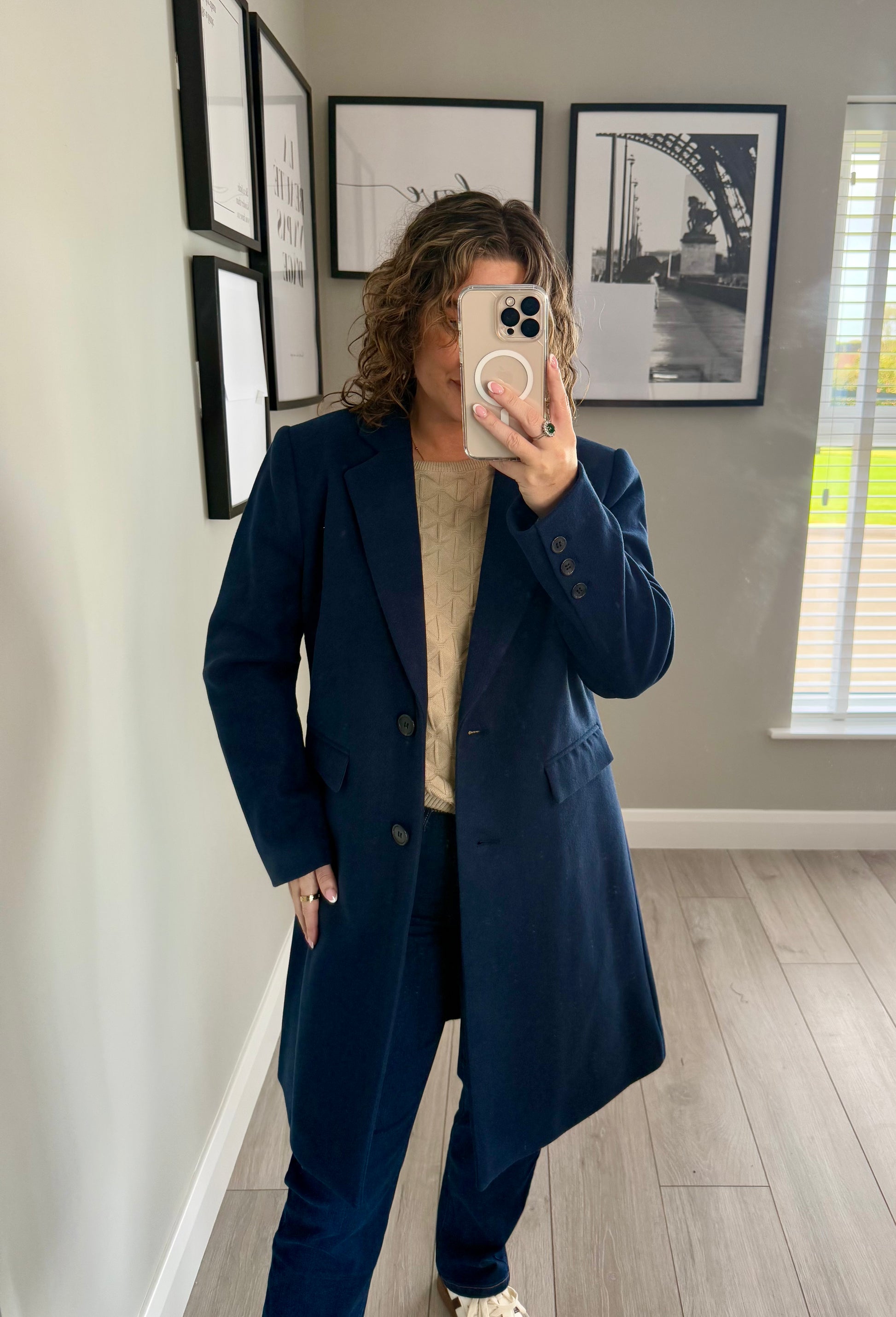 -Emreco simple navy single breasted coat. Finished with flat lapels, double flat pockets & double button fastening.