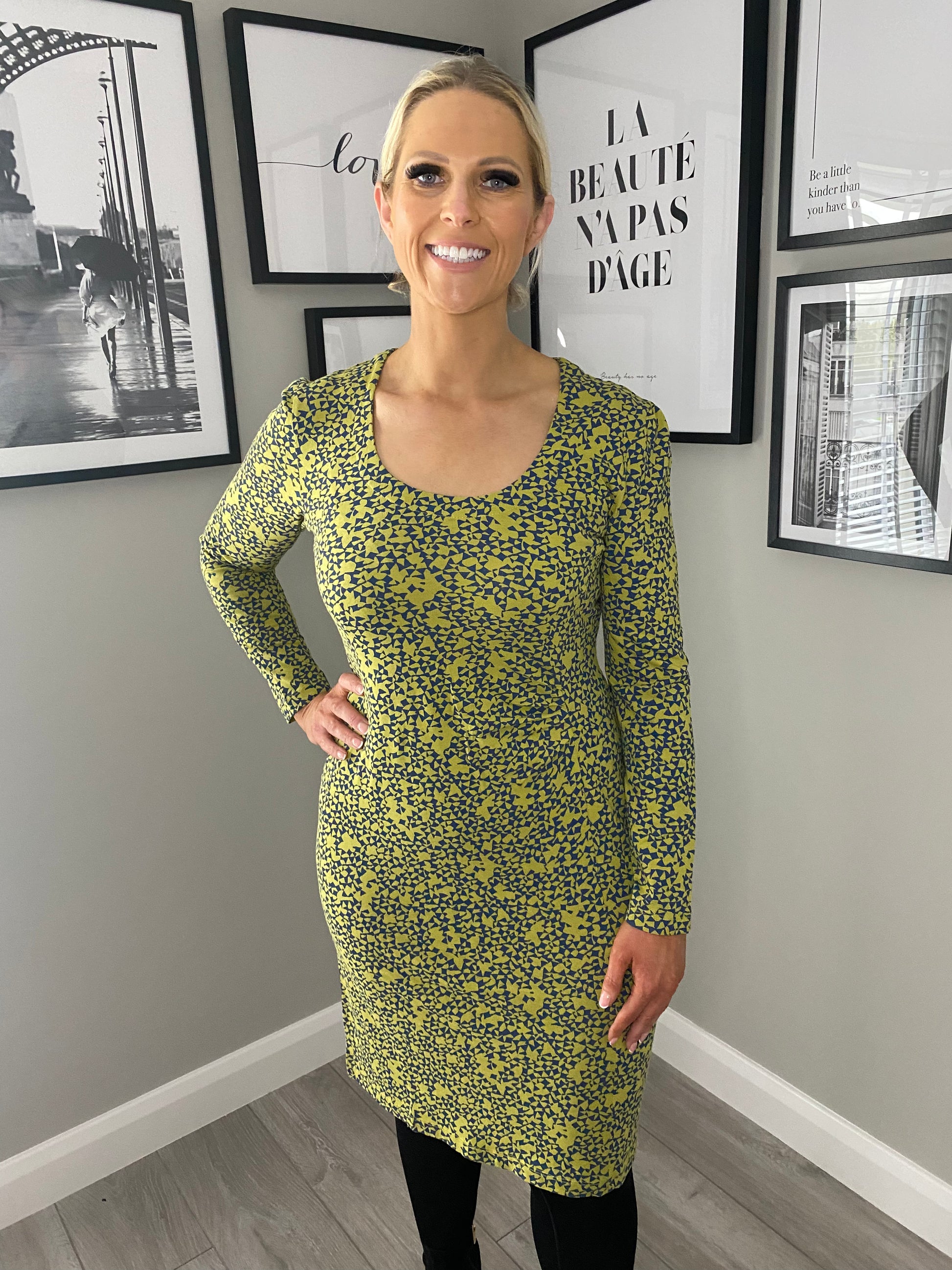 From the Nomads range it's all about vibrancy! With a low round neckline & full length sleeves this dress is printed in a geometric two toned print combining a vibrant lime & soft greys.