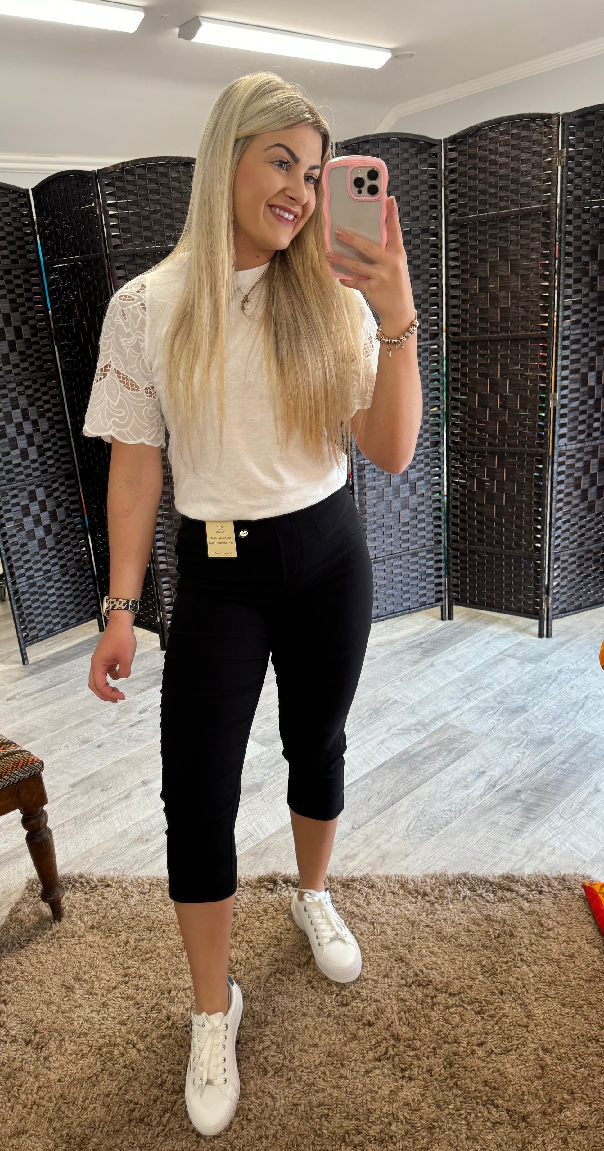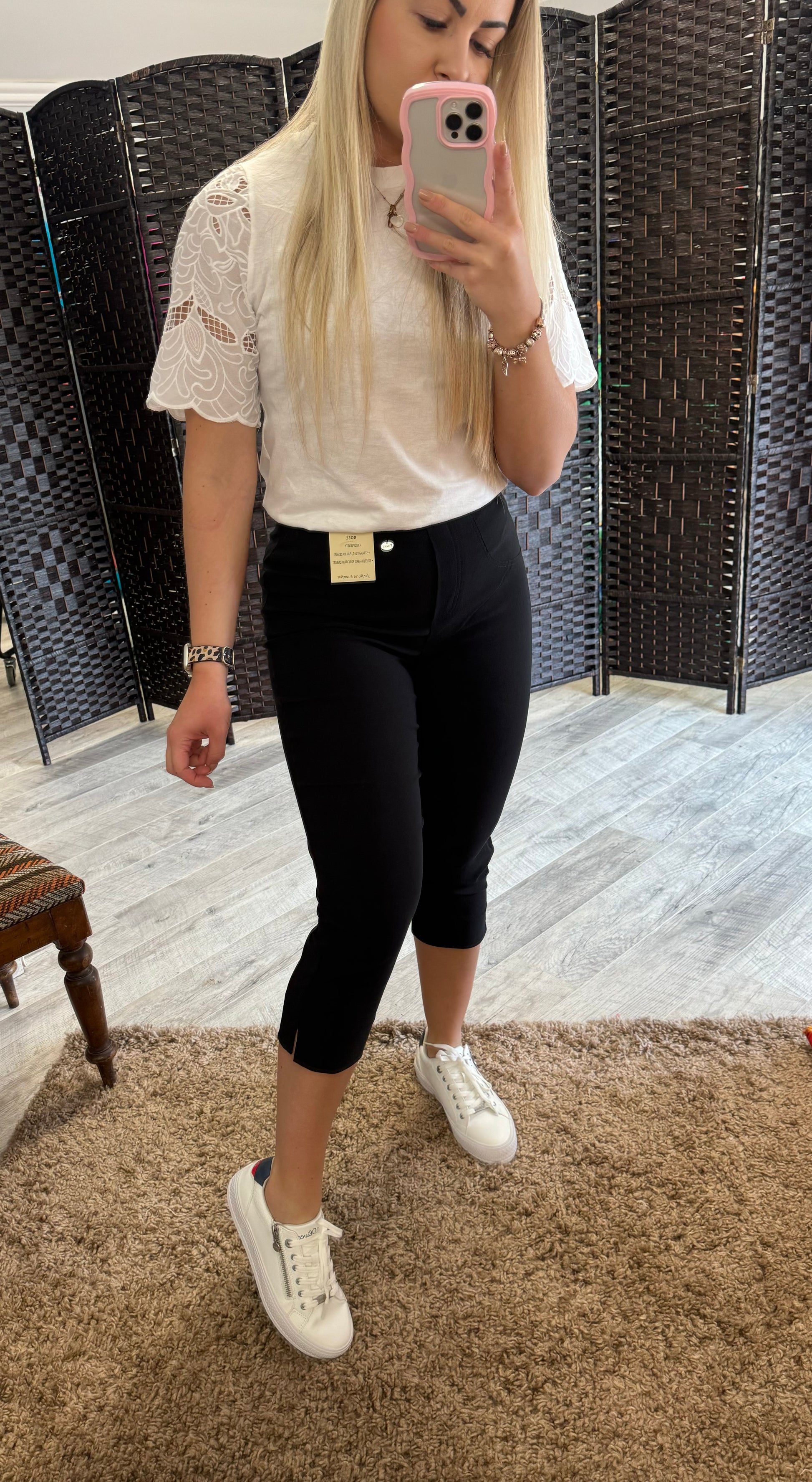 Figure Sculpting Bengaline Crop Trousers. Flattering slim fit three-quarter length trouser, with elasticated waist and tummy control. Super stretchy fit to provide all-day comfort.