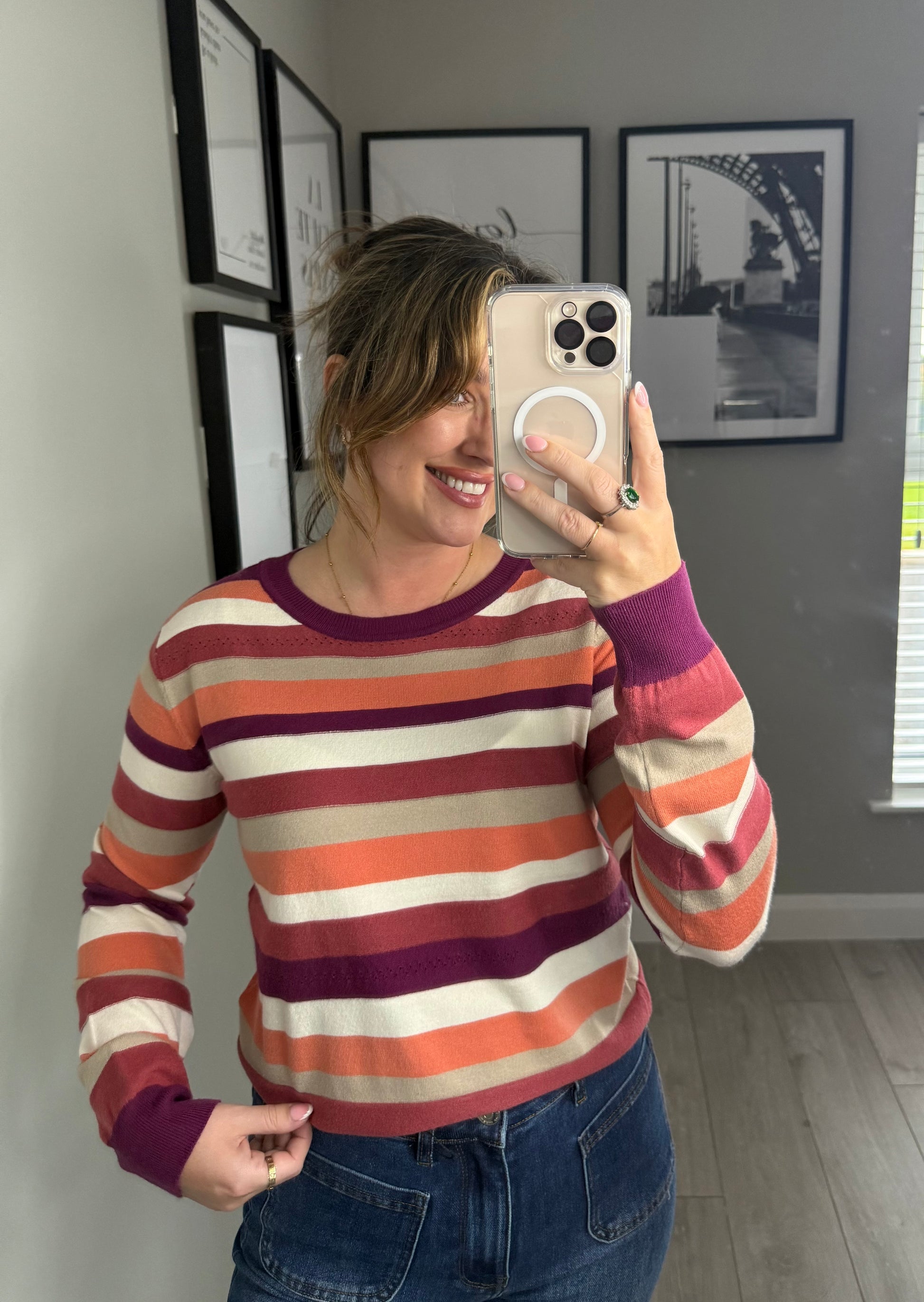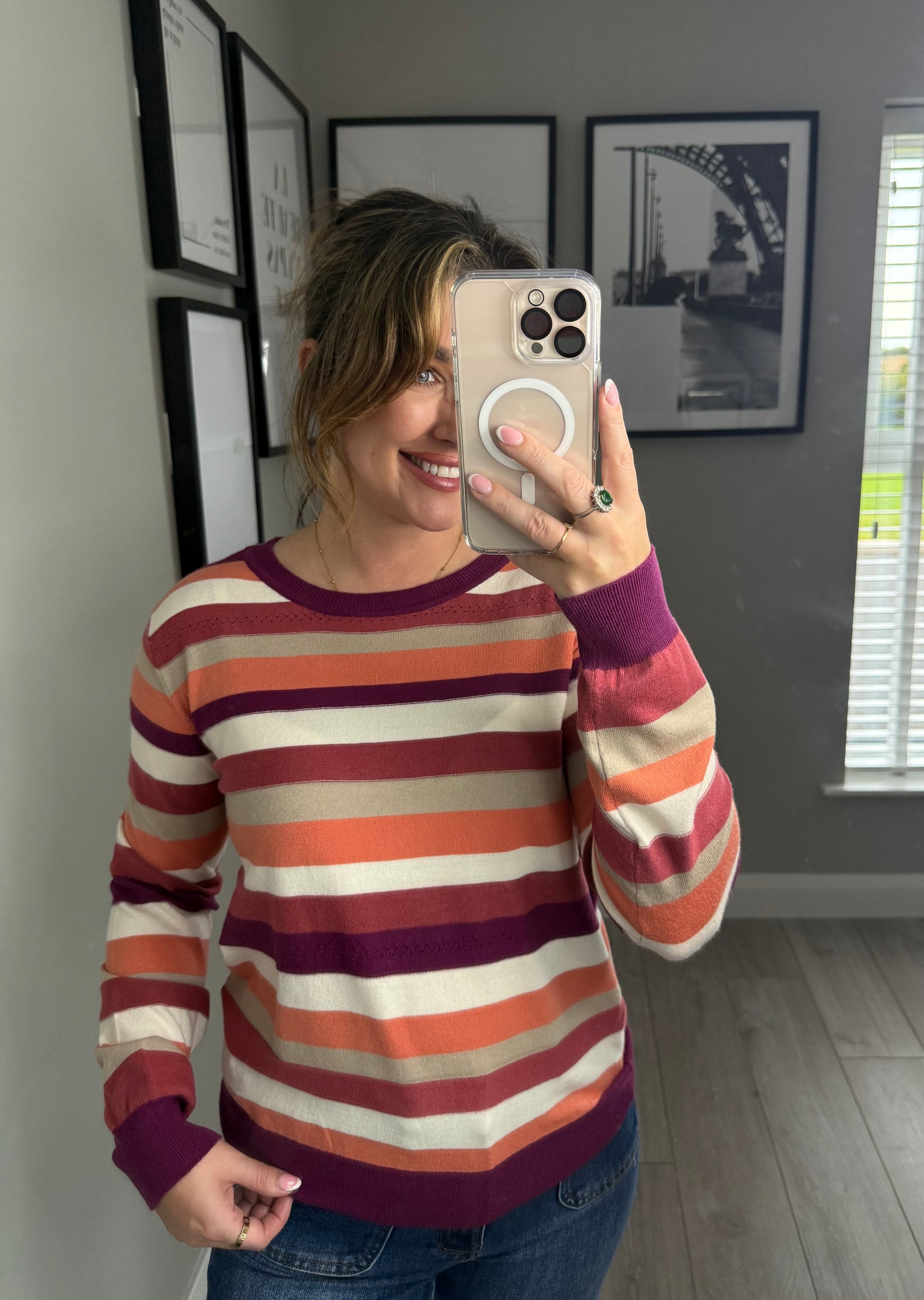-Jessica Graaf plum multi (with orange, rust cream & beige) stripe jumper with round neckline & cuffed sleeves.