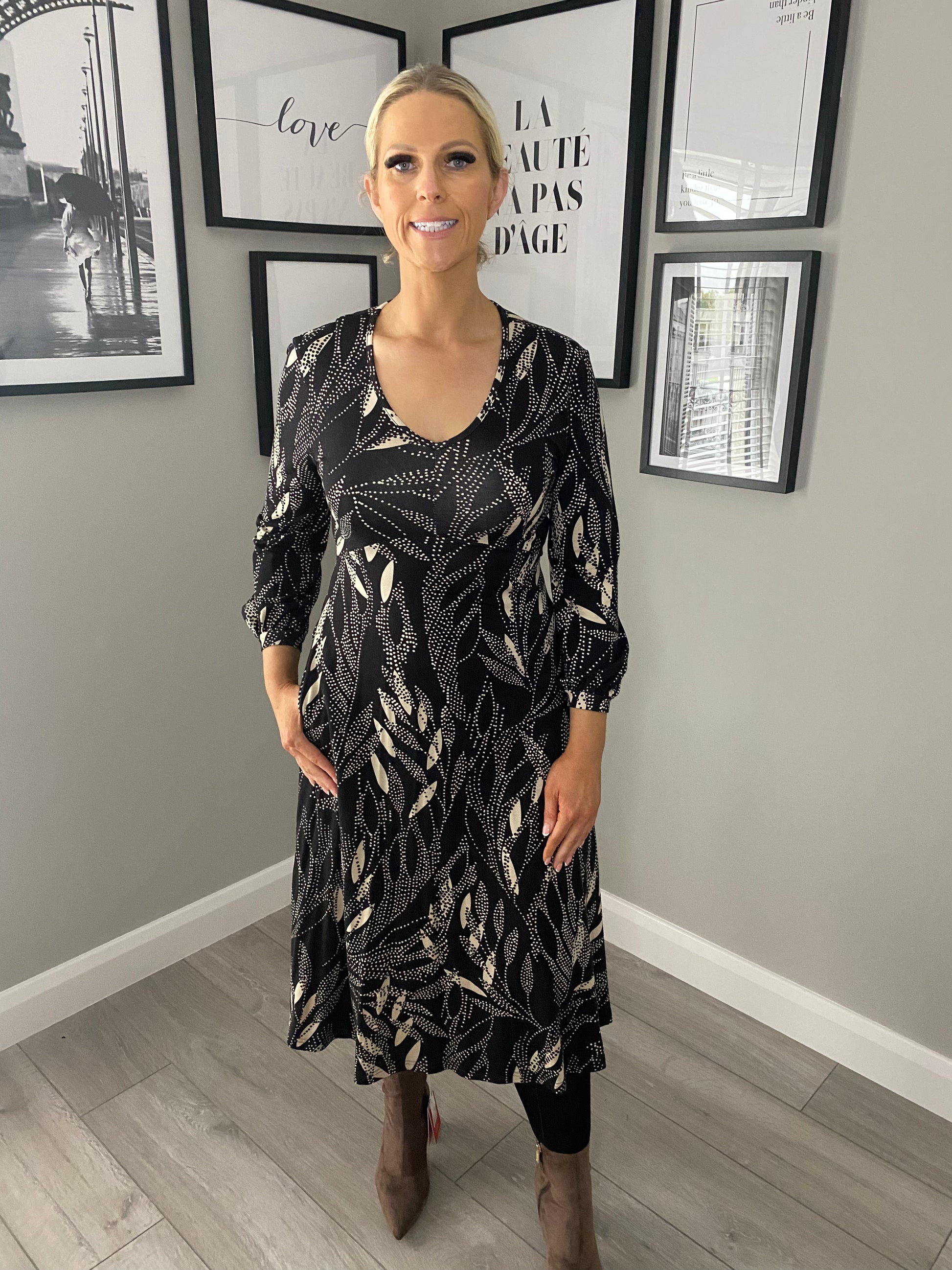 From the Pomodoro range this ones a real figure flatterer! In a two toned black & beige leaf design it's printed throughout. It's got V neckline before falling to a lightly flared skirt finishing on the mid calf with full length sleeves. We styled effortlessly with our XTI taupe sock boots.