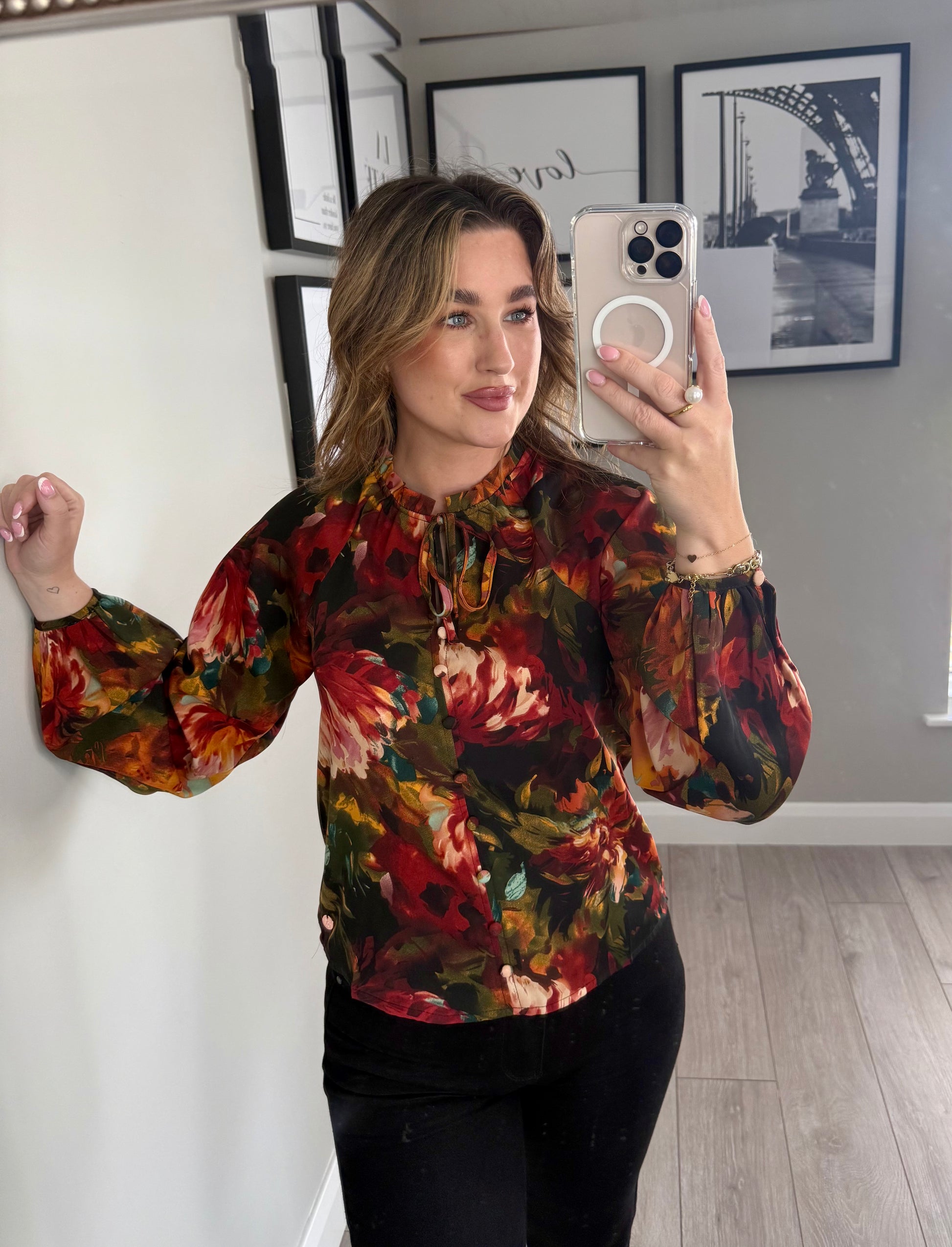 -Rant & Rave multi Billie top is matching everything! A unique blend of greens, rusts, black & orange its sitting with any colour base. It's finished with a stunning V tie neckline with small frill & long cuffed sleeves.