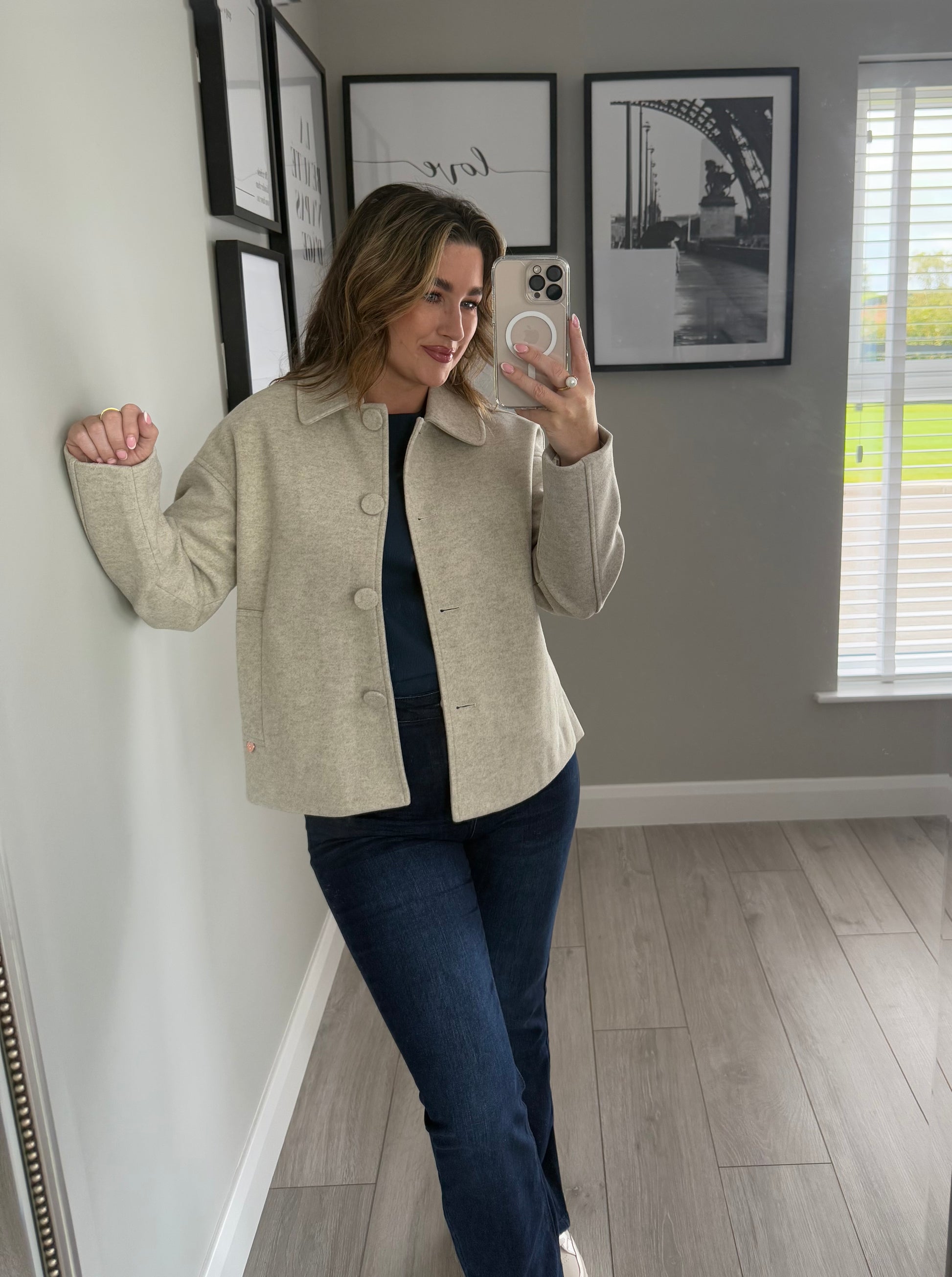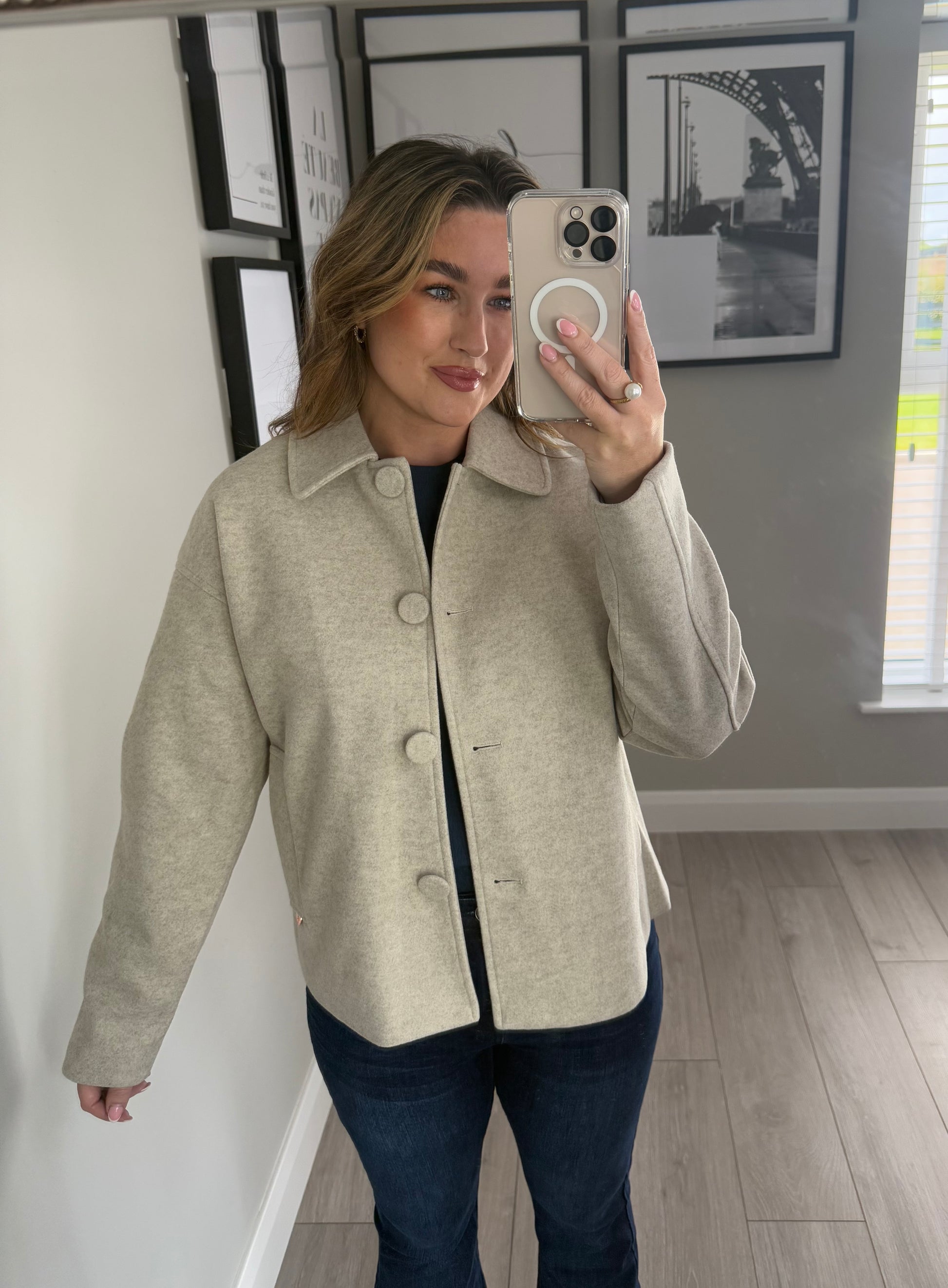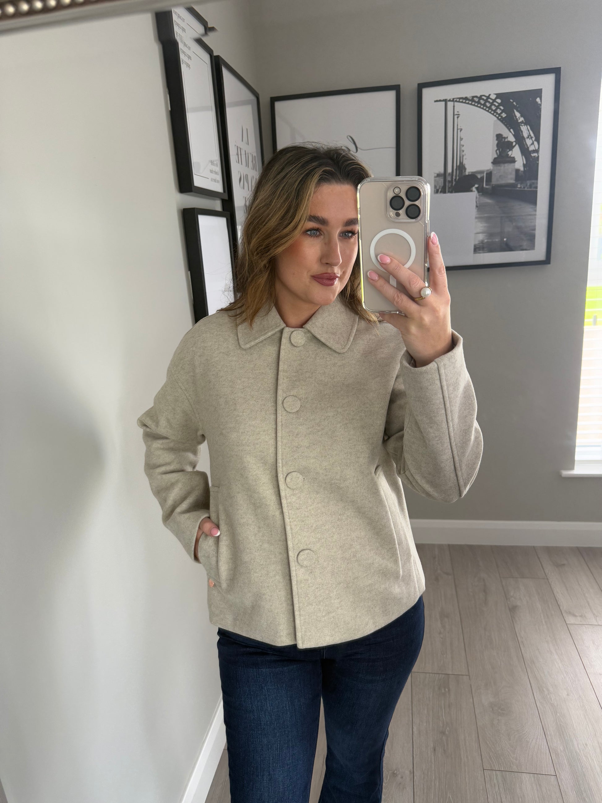 -Rant & Rave oatmeal short button jacket. Collared neckline with double pockets. Fully lined.