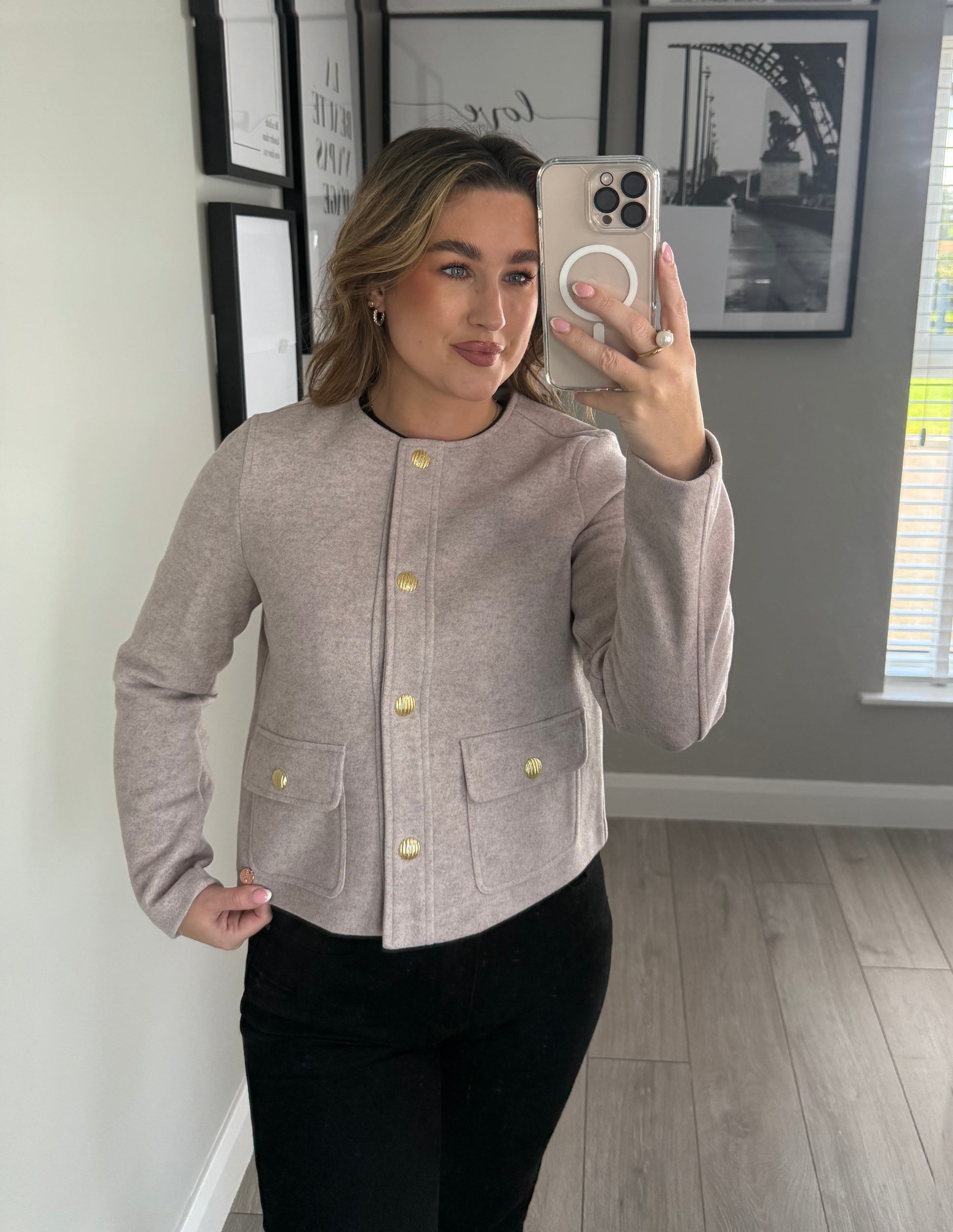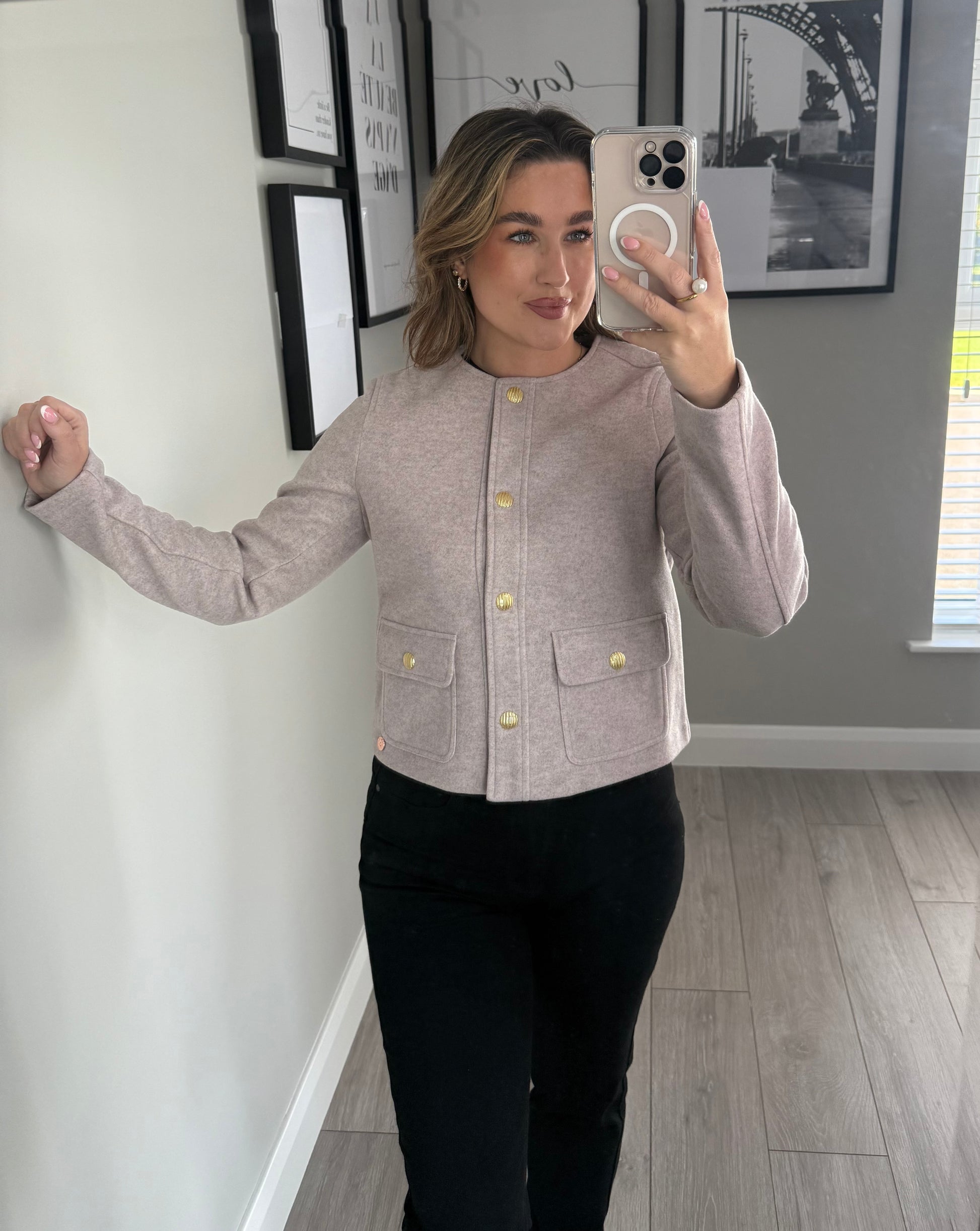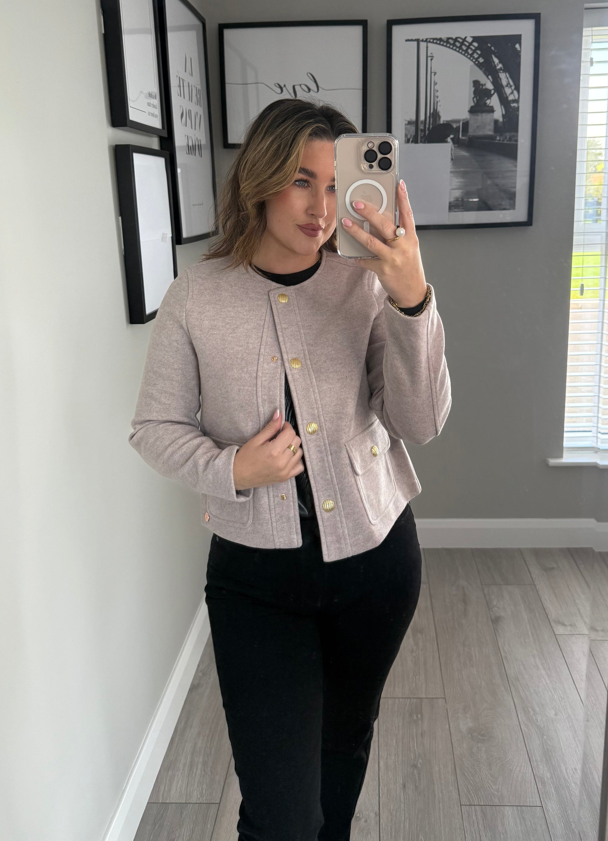 -Rant & Rave soft pink short jacket. Collarless bomber design with gold button/pocket detail. Wear open or shut as your Autumn layer.