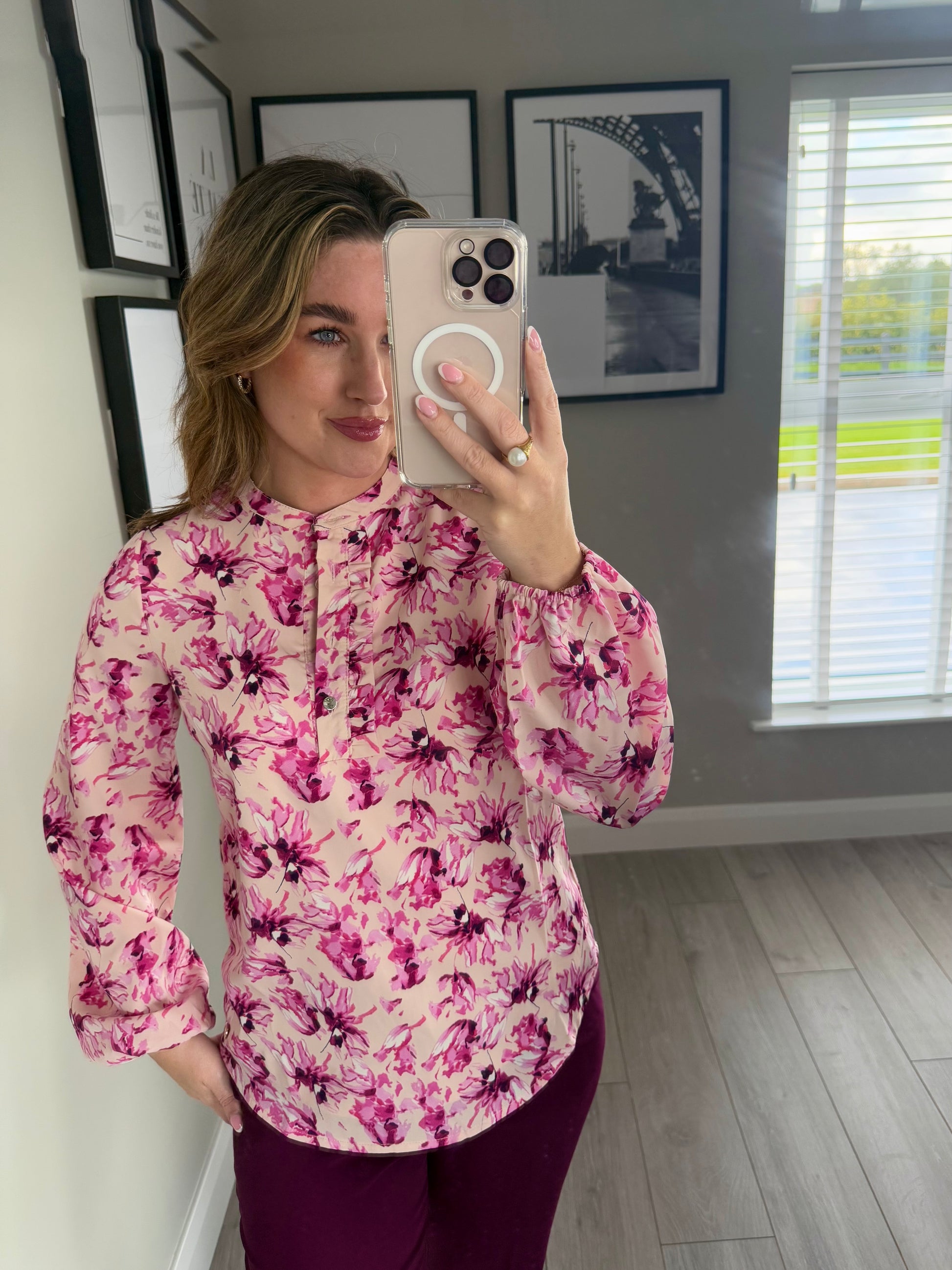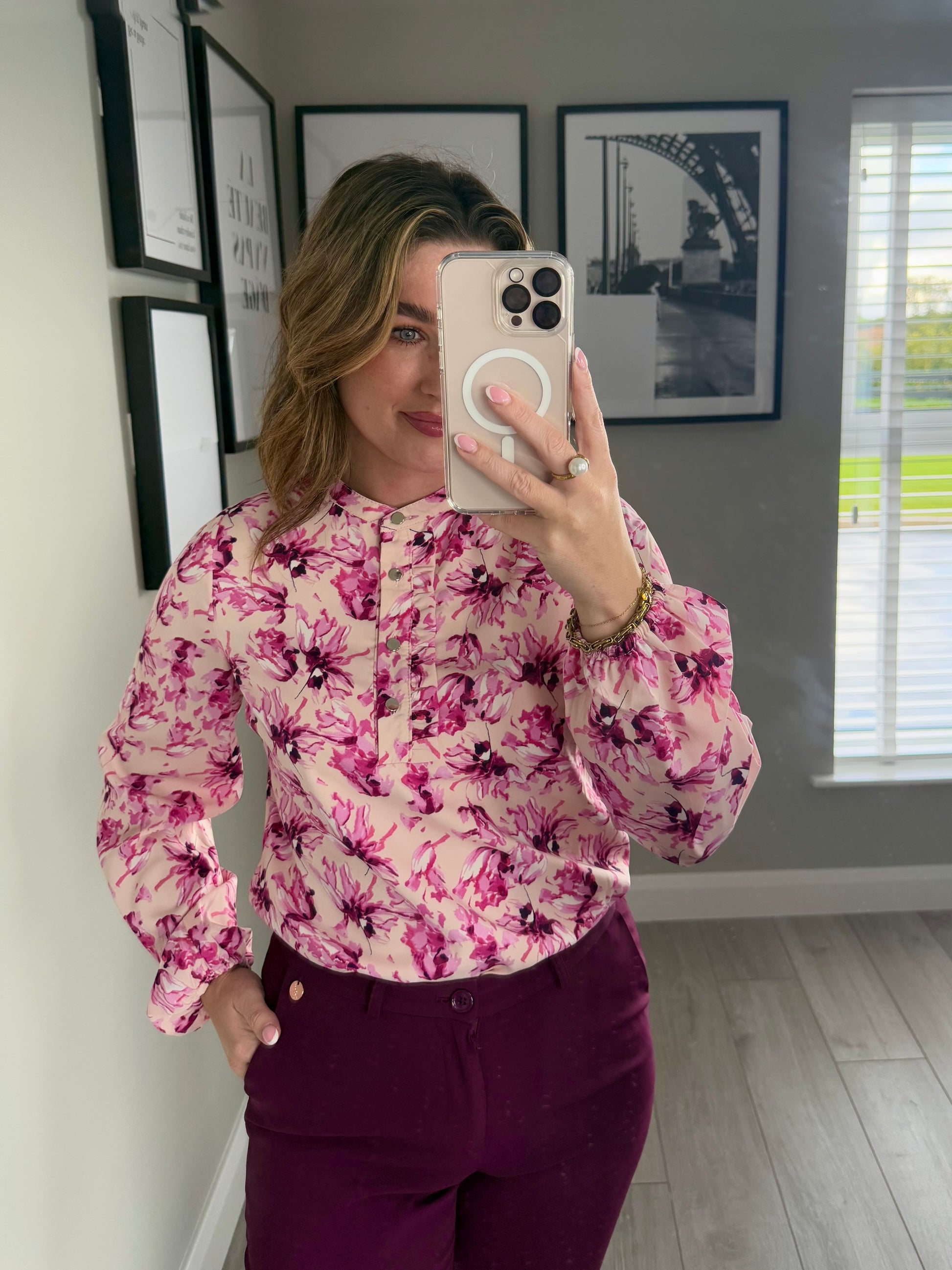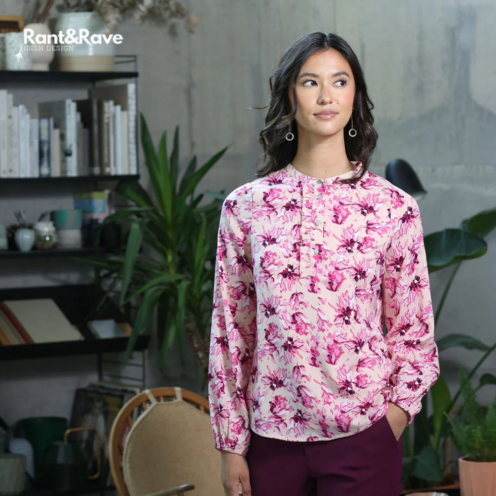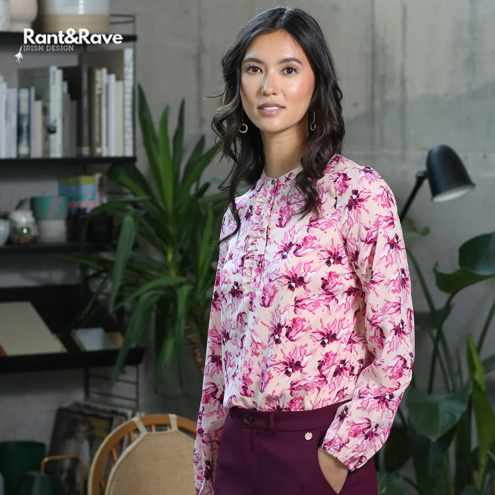 -Rant & Rave pink floral printed blouse. On the stunning soft pink base its floral print stands out in the contrasting cranberry. Finished with flat grandad style neckline with quarter button fastening & subtle frill.