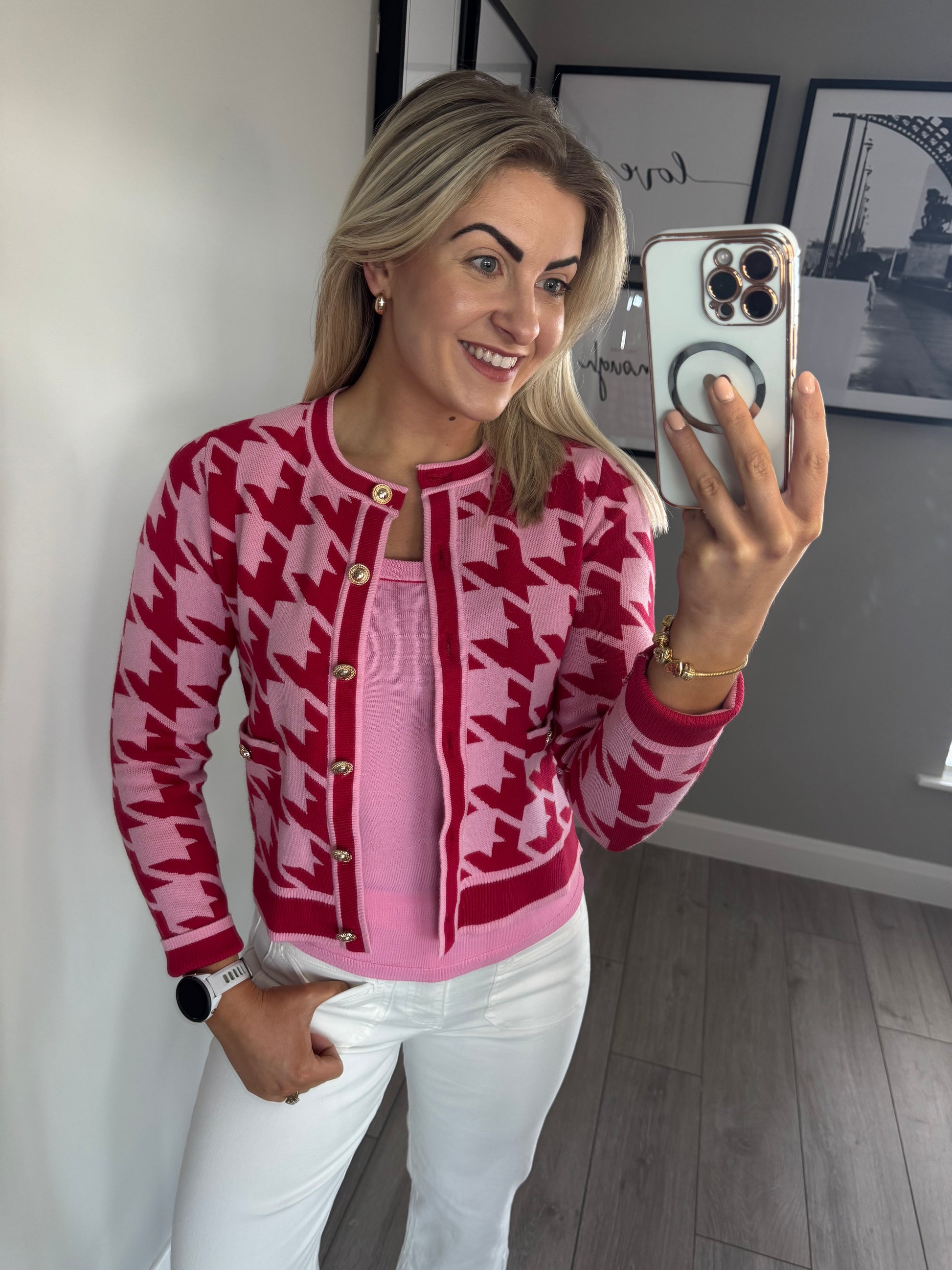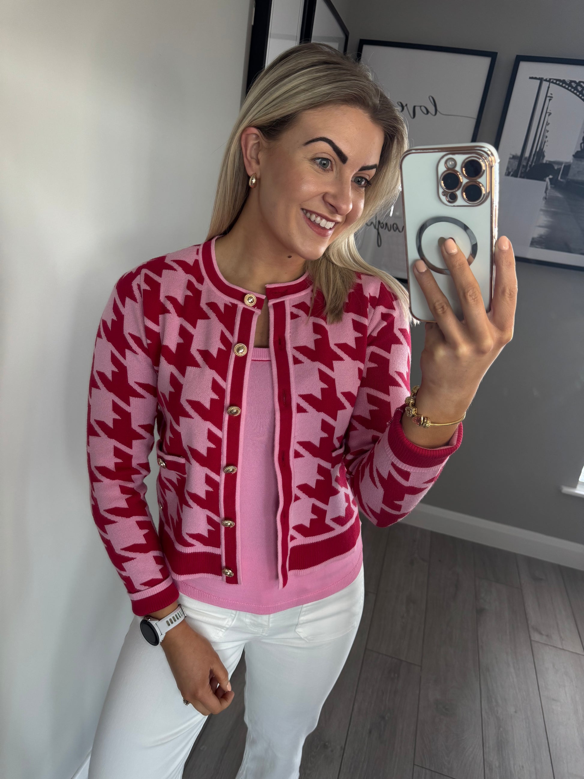 -Rant & Rave pink & red printed cardigan with striking gold buttons. Gracie vest top to match sold separately.