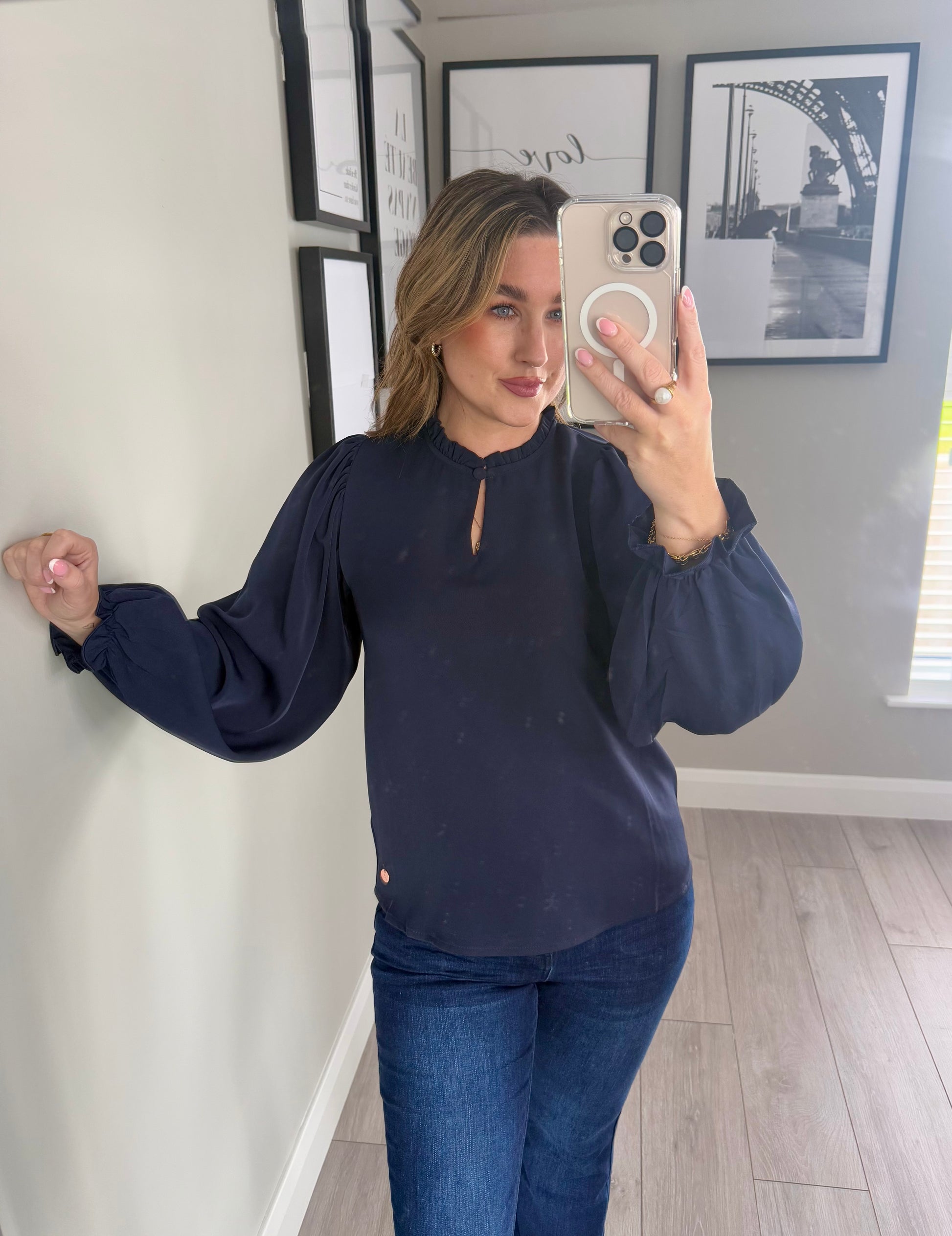 -Rant & Rave navy plain blouse. An effortless wear with frill detail to the high neckline & cuffed sleeves, finished beautifully with small keyhole/button fastening.