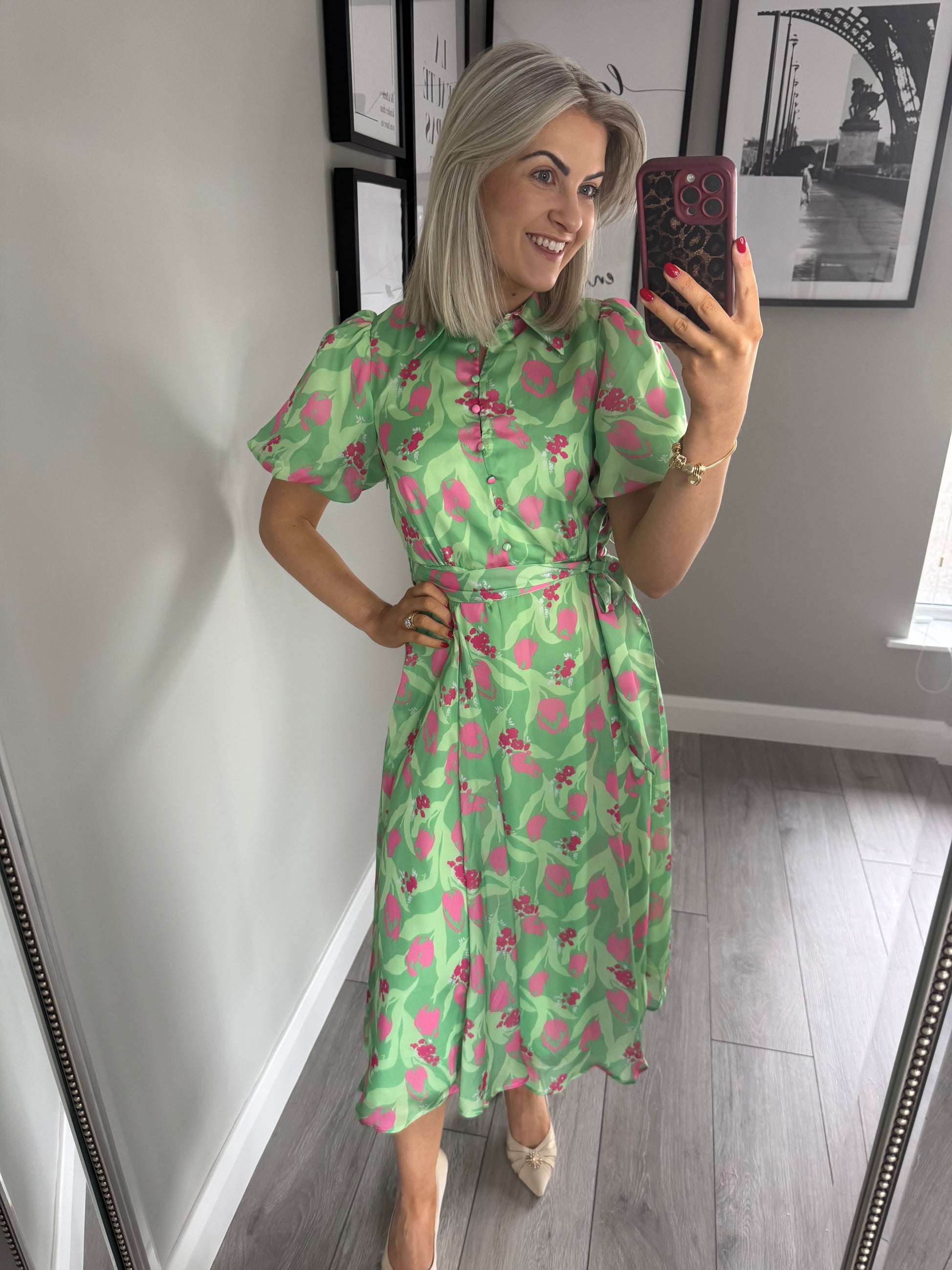 -Rant & Rave pretty green & pink printed dress. Classic collar with buttoned bodice, short puffed sleeves & tie waistband the Ida dress has a soft flowing skirt.