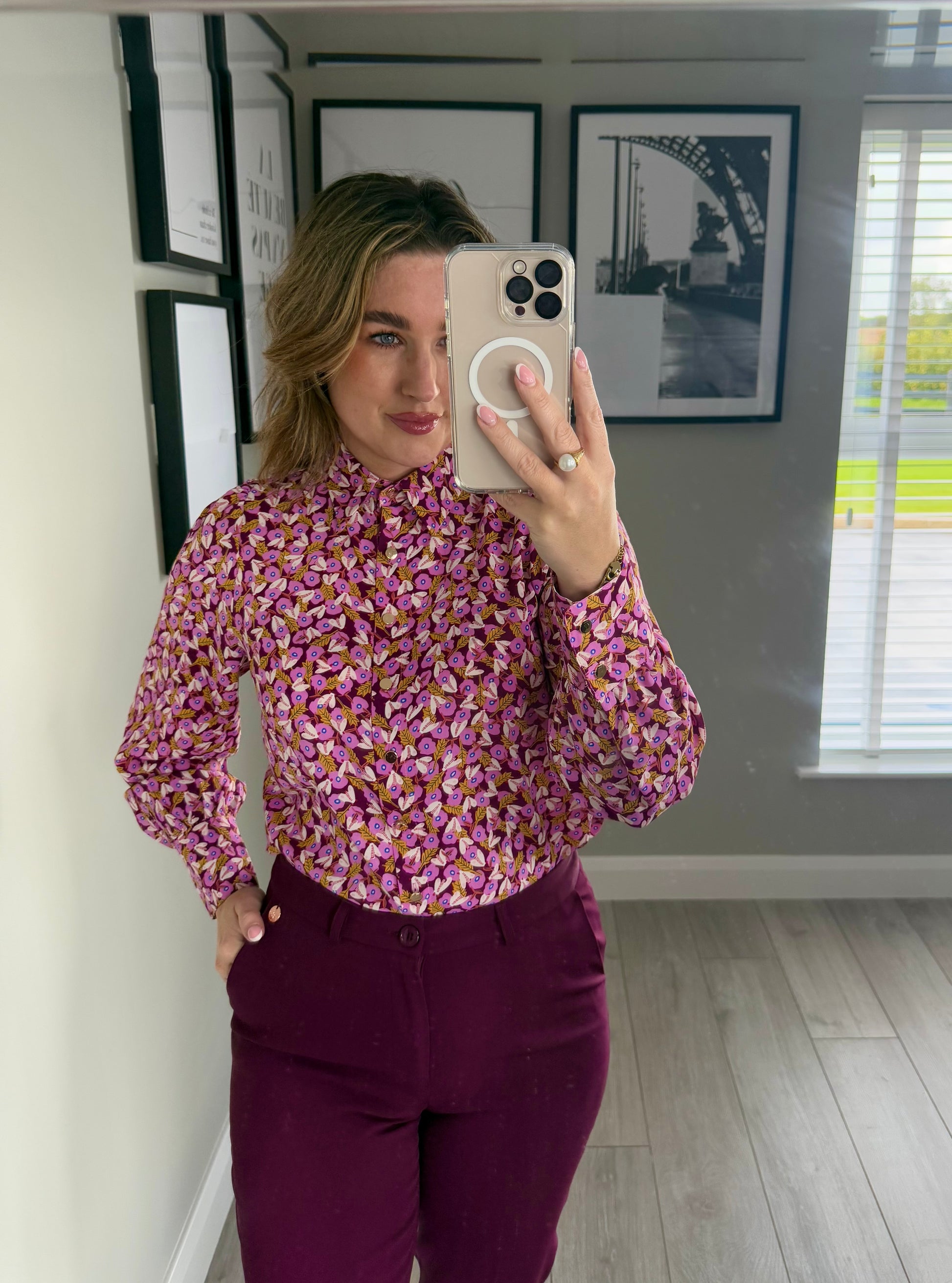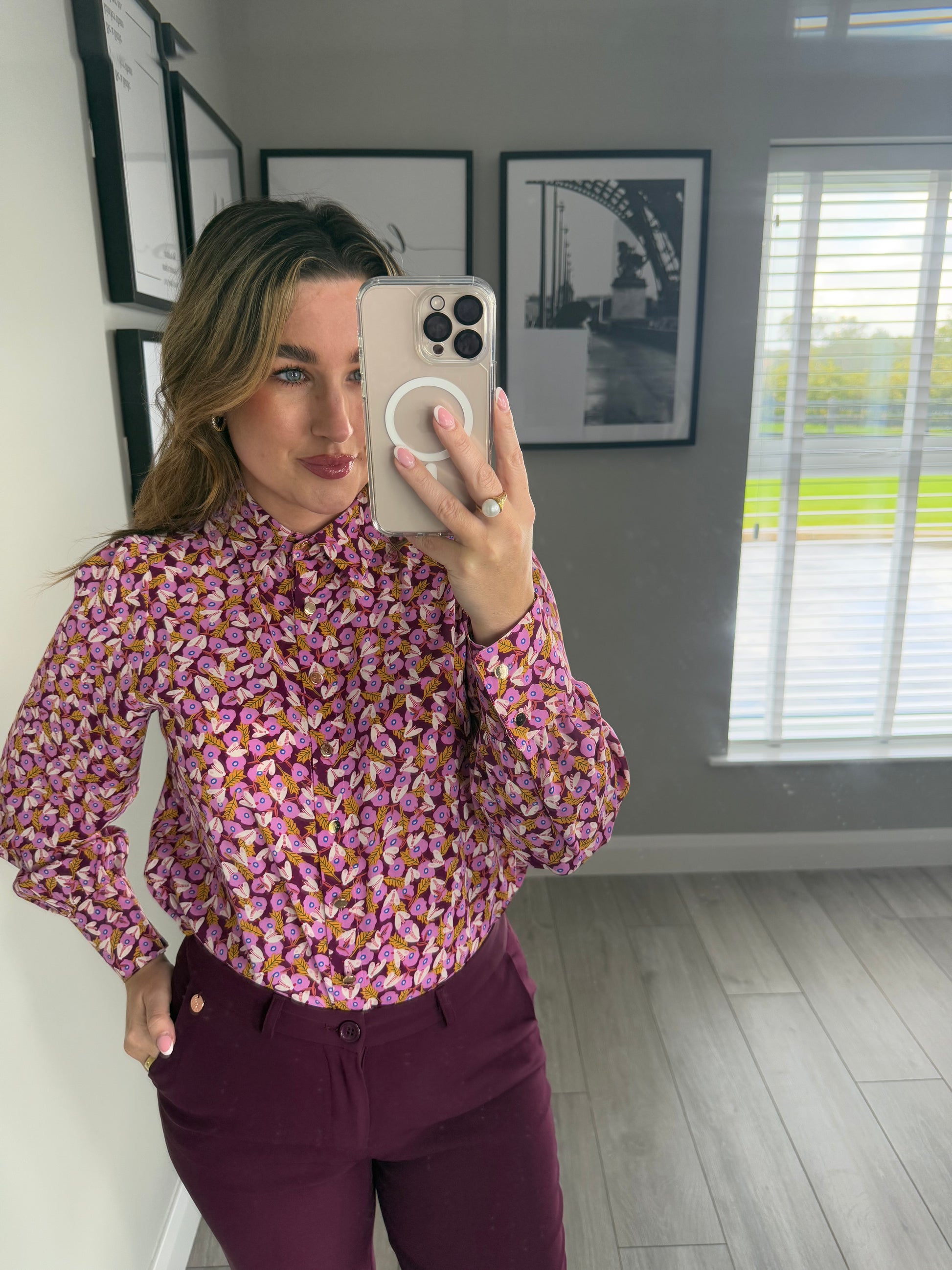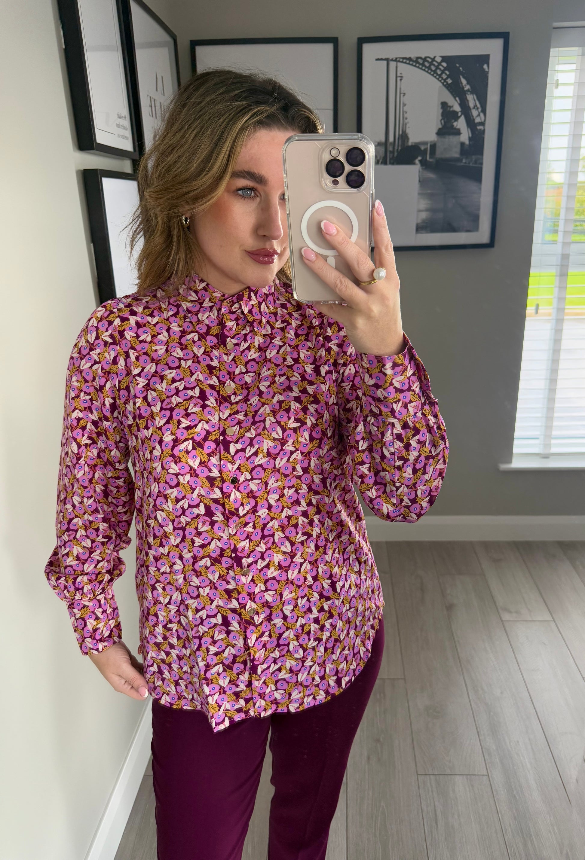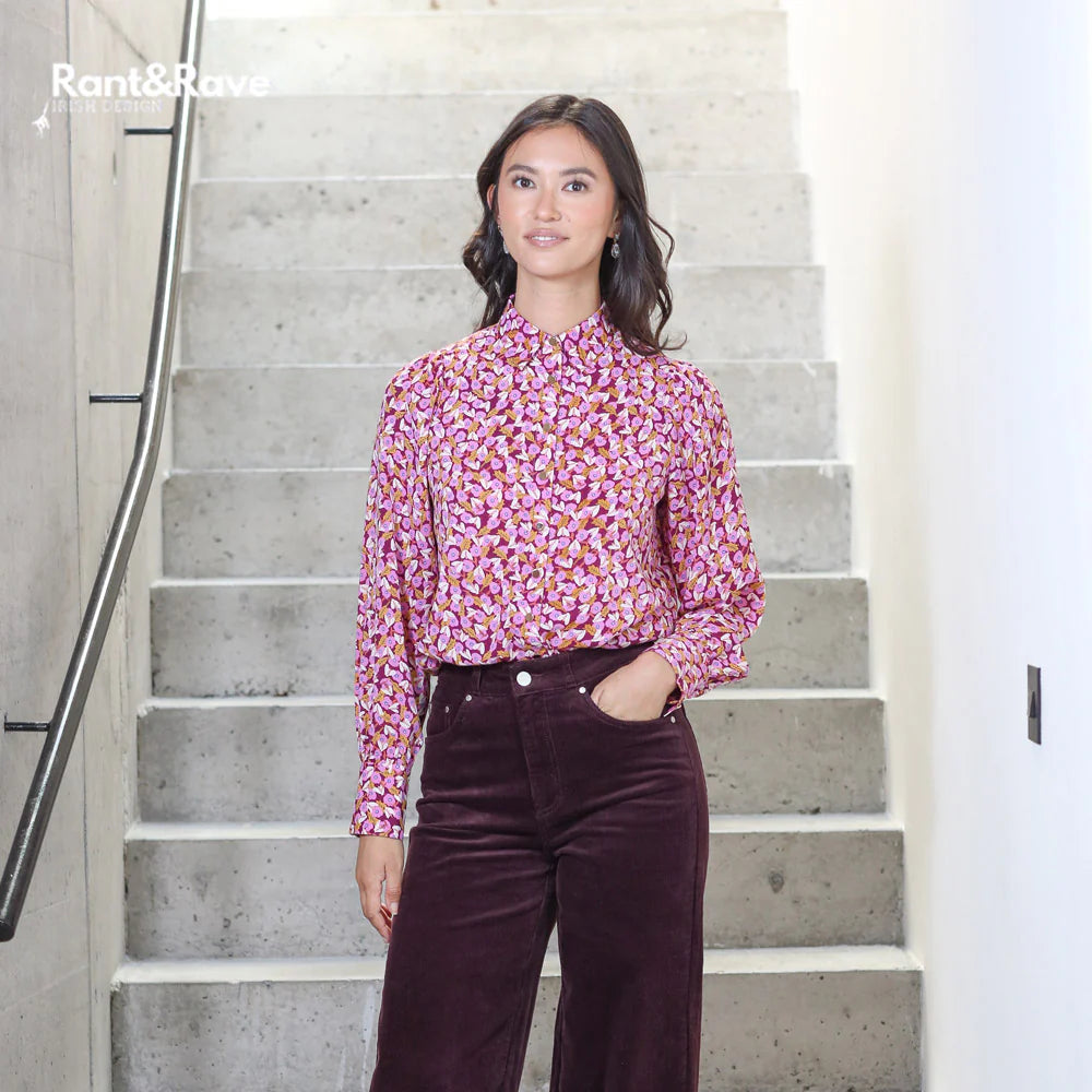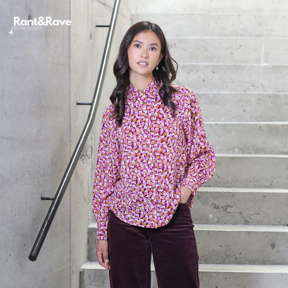 -Rant & Rave pink printed blouse. In a blend of pink, white & cranberry Jasleen has a classic collar & button through (gold buttons) from collar to hem. A perfect match for our cranberry trousers, our plum jeans or your own denims!