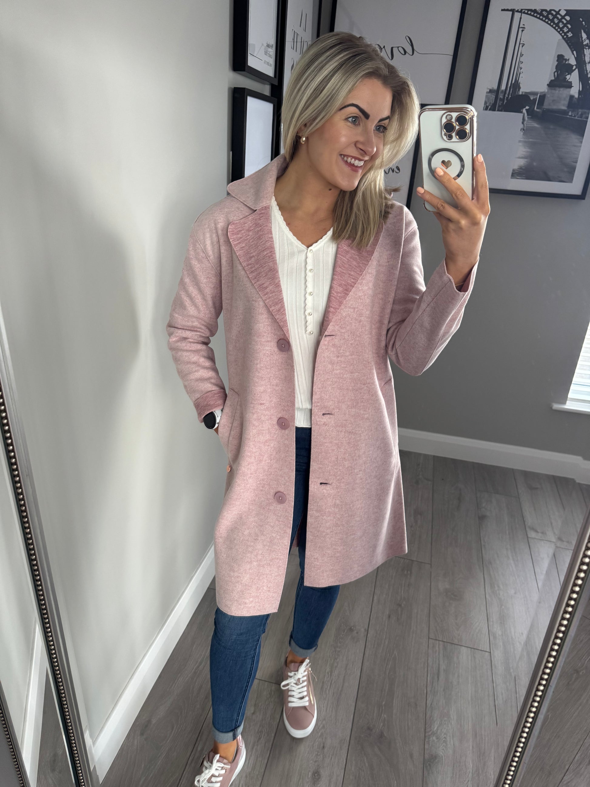 -Rant & Rave pink light coatigan with double pockets, flat lapel collaring & triple button fastening.