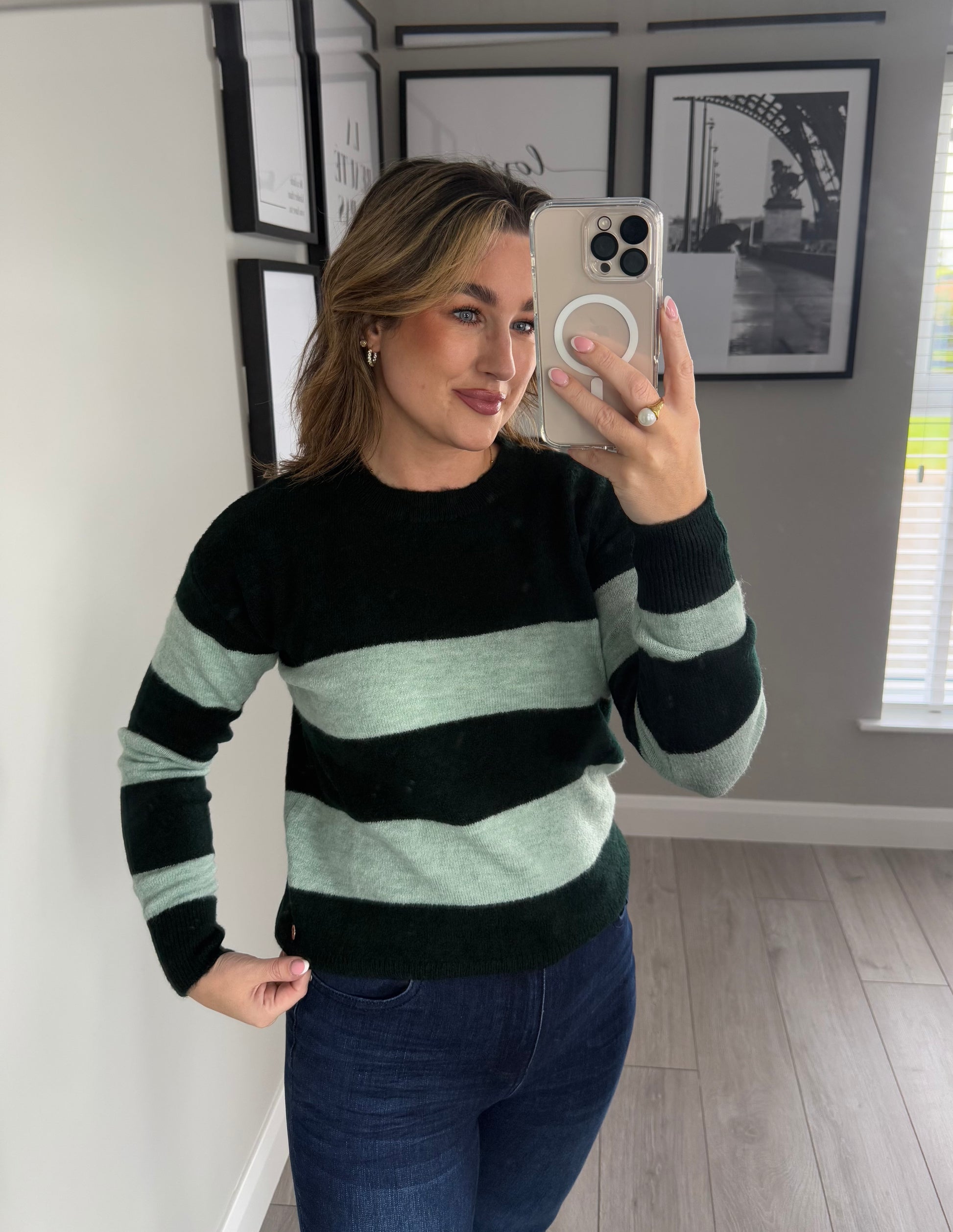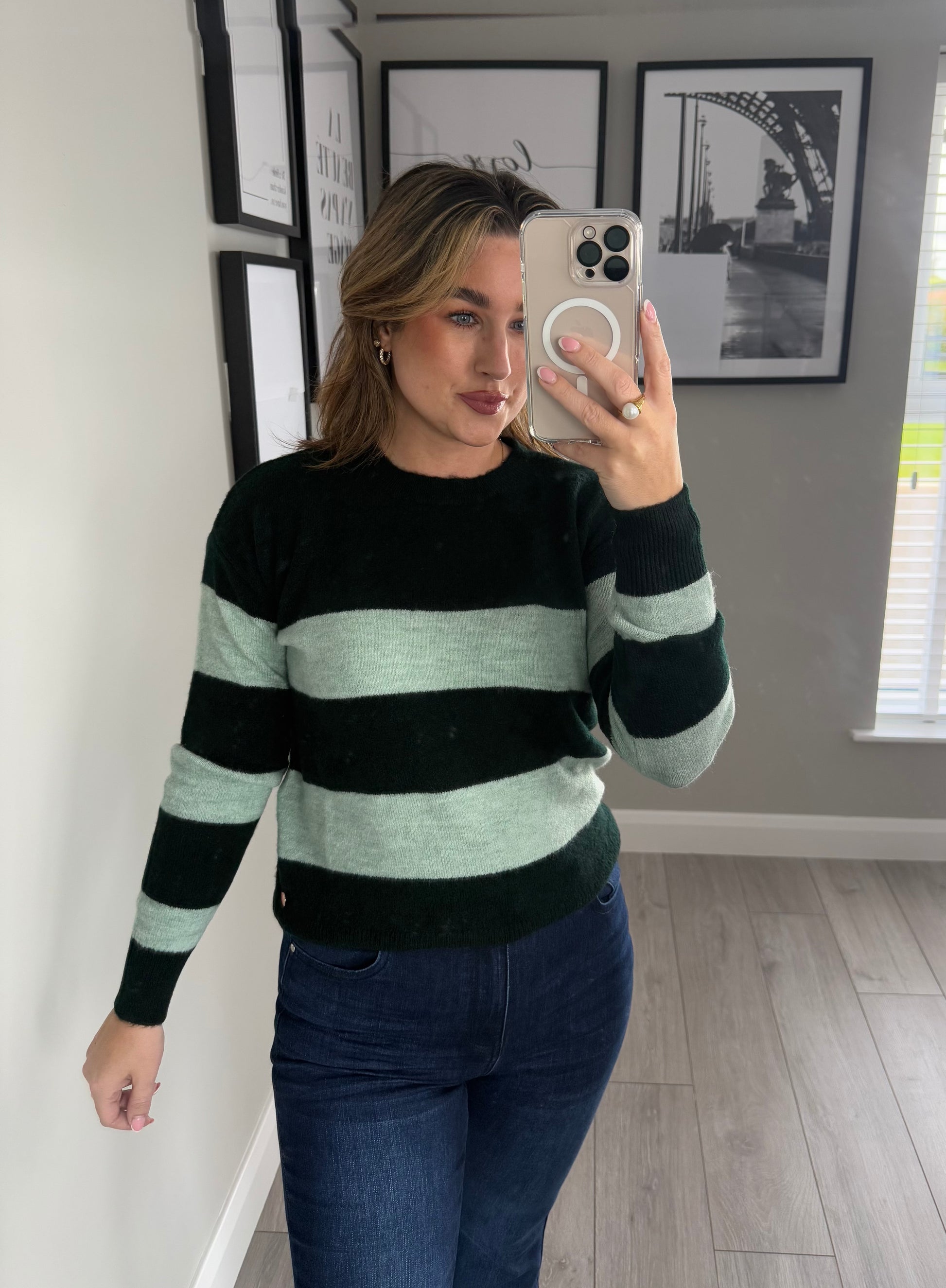 -Rant & Rave soft cosy jumper in two toned teal & navy stripe design. Round neck & long cuffed sleeves.