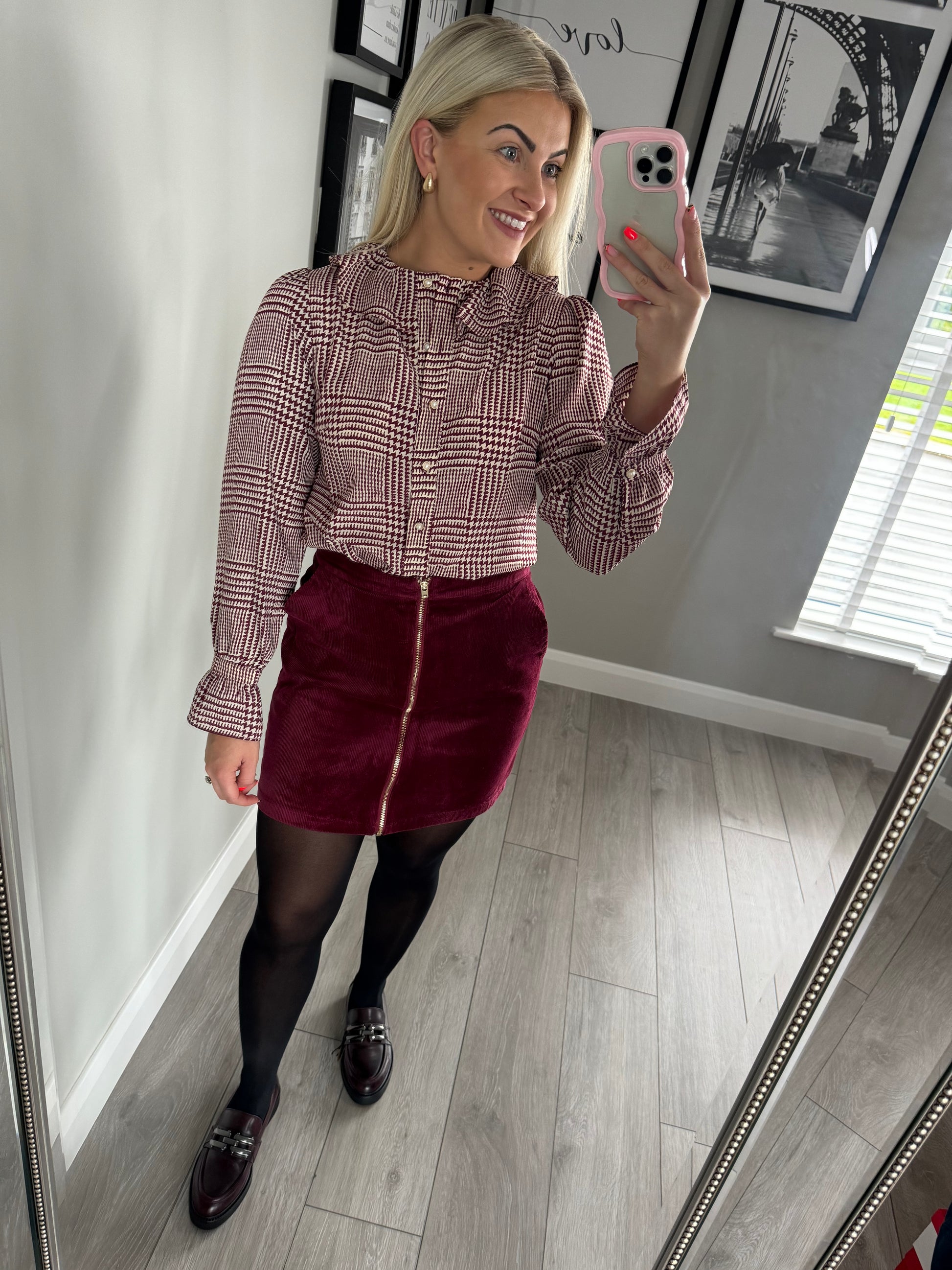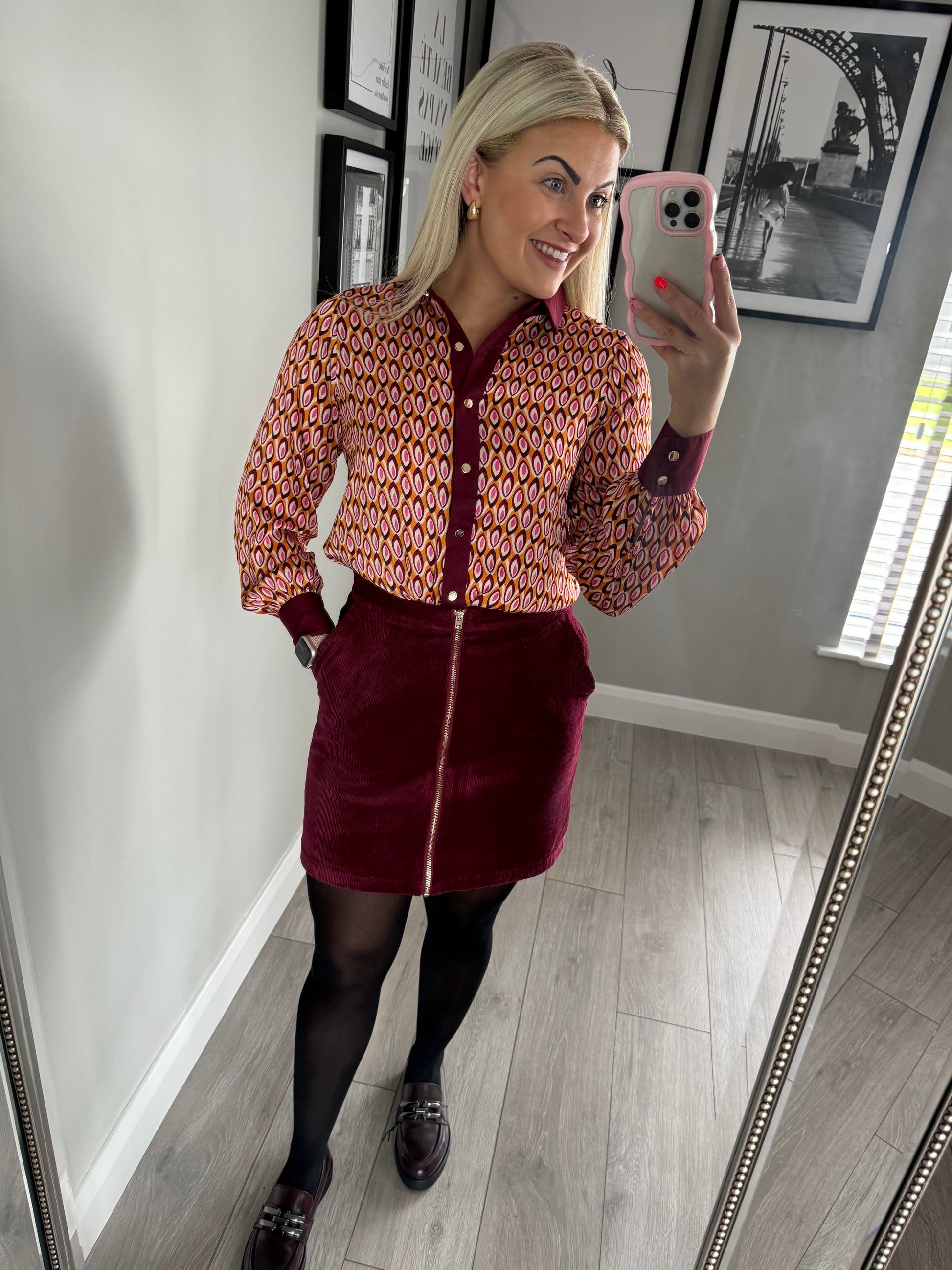 -Rant & Rave short cord skirt in burgundy with gold zip through the centre (fully functioning).