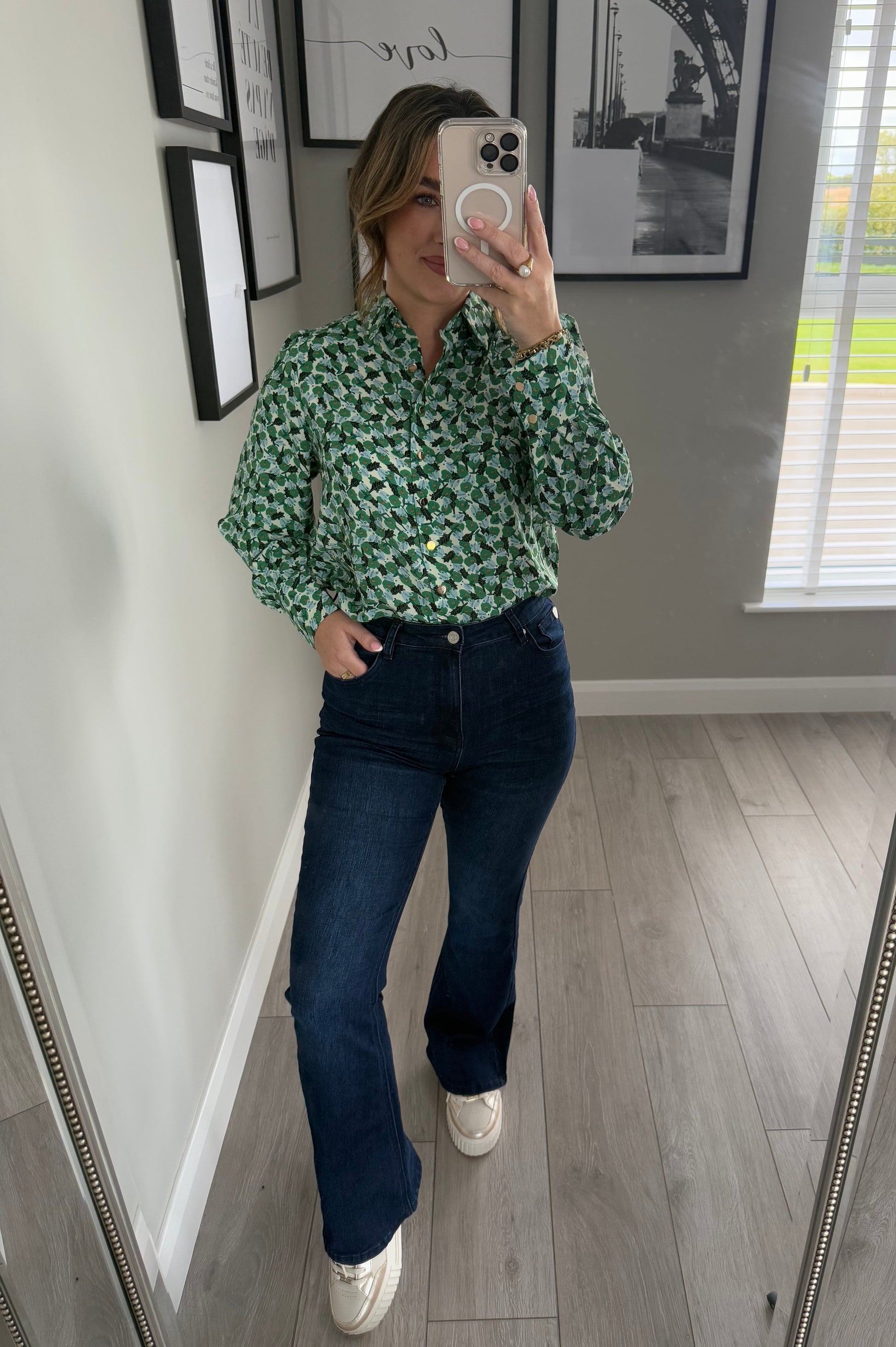 -Rant & Rave dark indigo flare jean. The flare style features Rant & Raves high waisted sculpted fit to the hips before kicking out to a statement bootcut hem! Featuring zip & button fastening on silver hardware & double pockets.