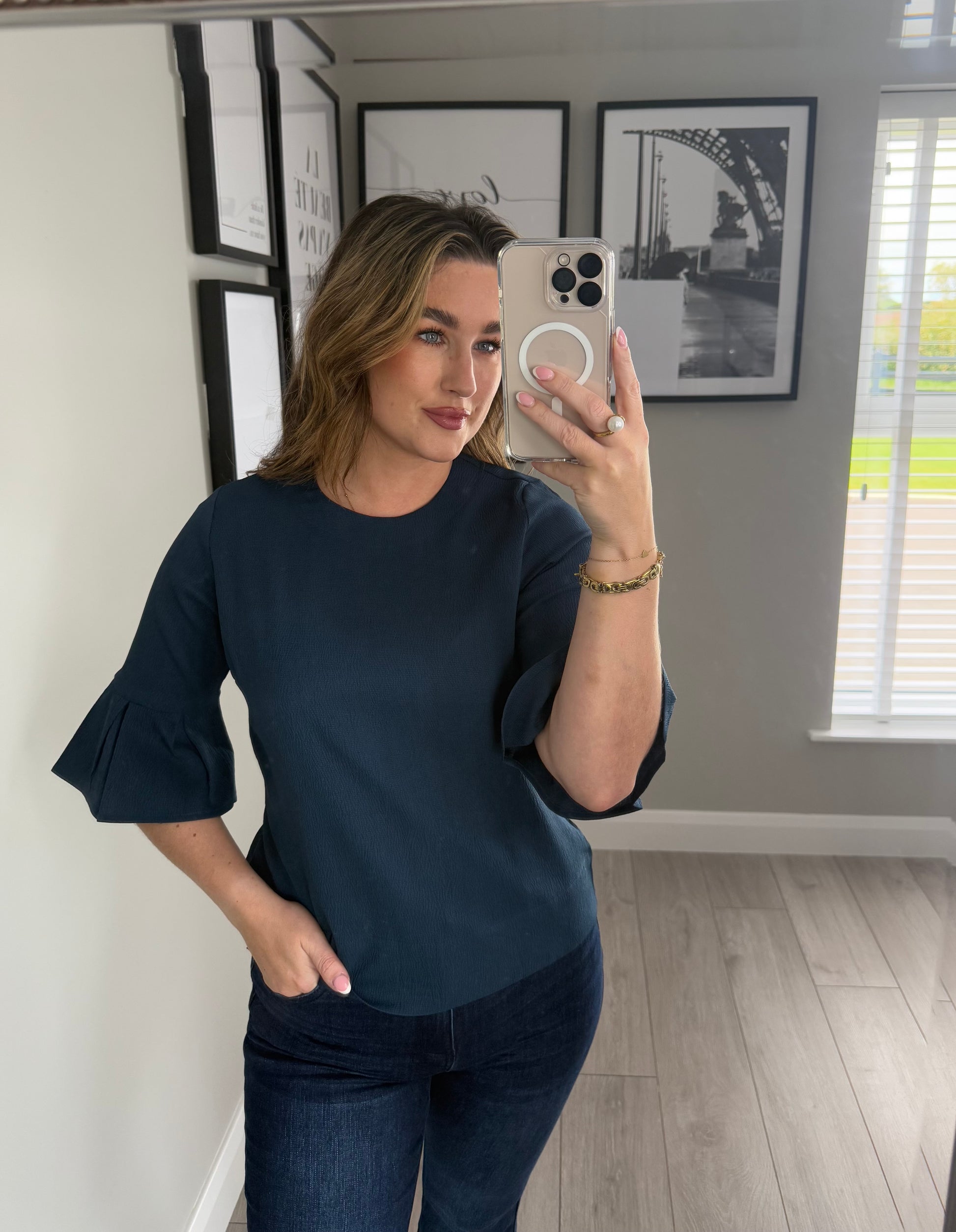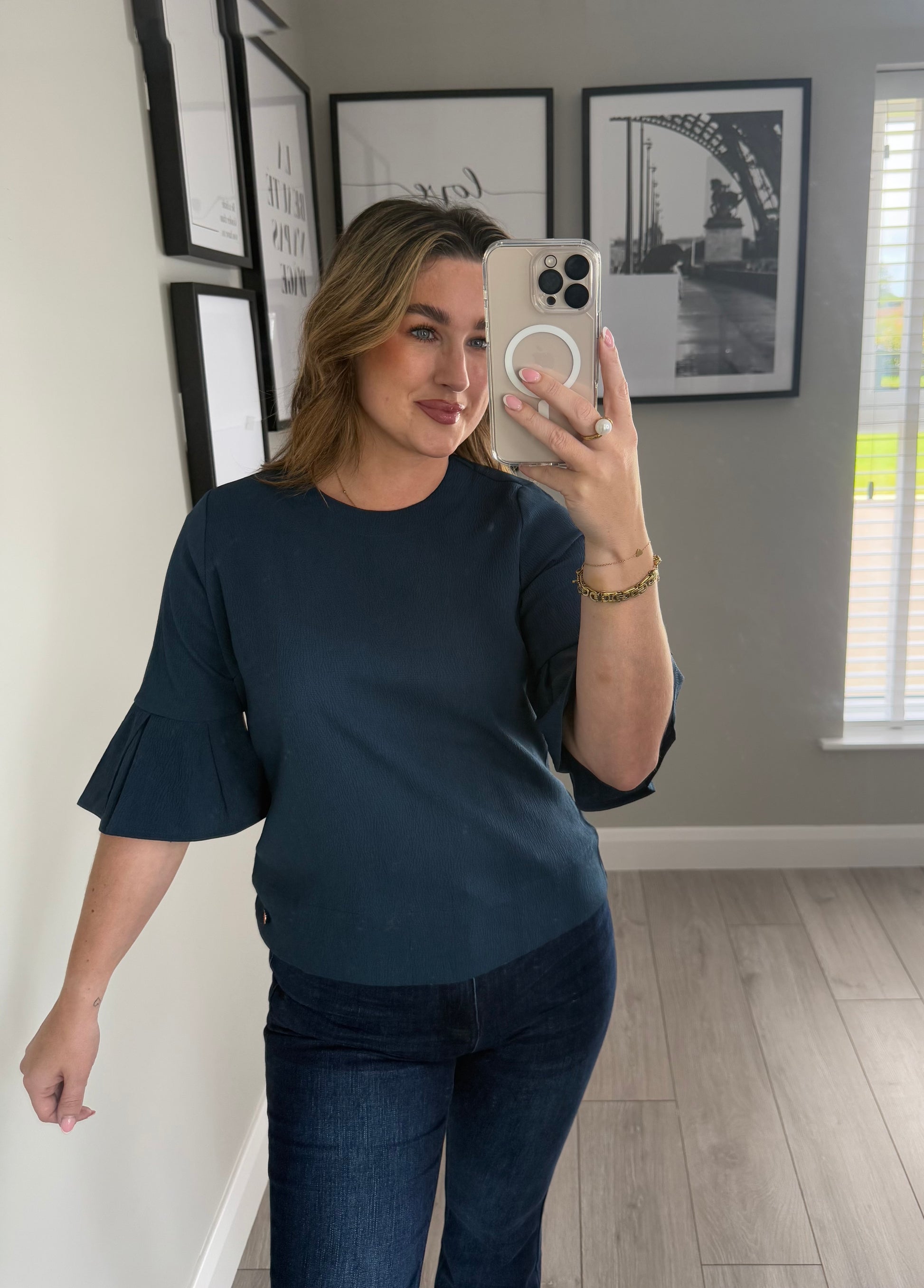 -Rant & Rave plain deep teal top with half bell sleeves & round neck. Finished with zip closure to the back of neck.
