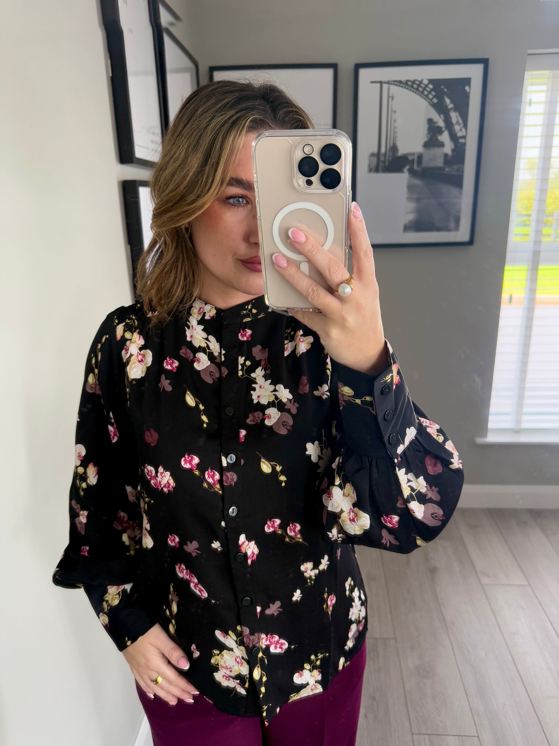 -Rant & Rave black floral printed blouse. A combination of pinks, creams & burgundy on a black base with button through high neckline & button cuff full length sleeves.
