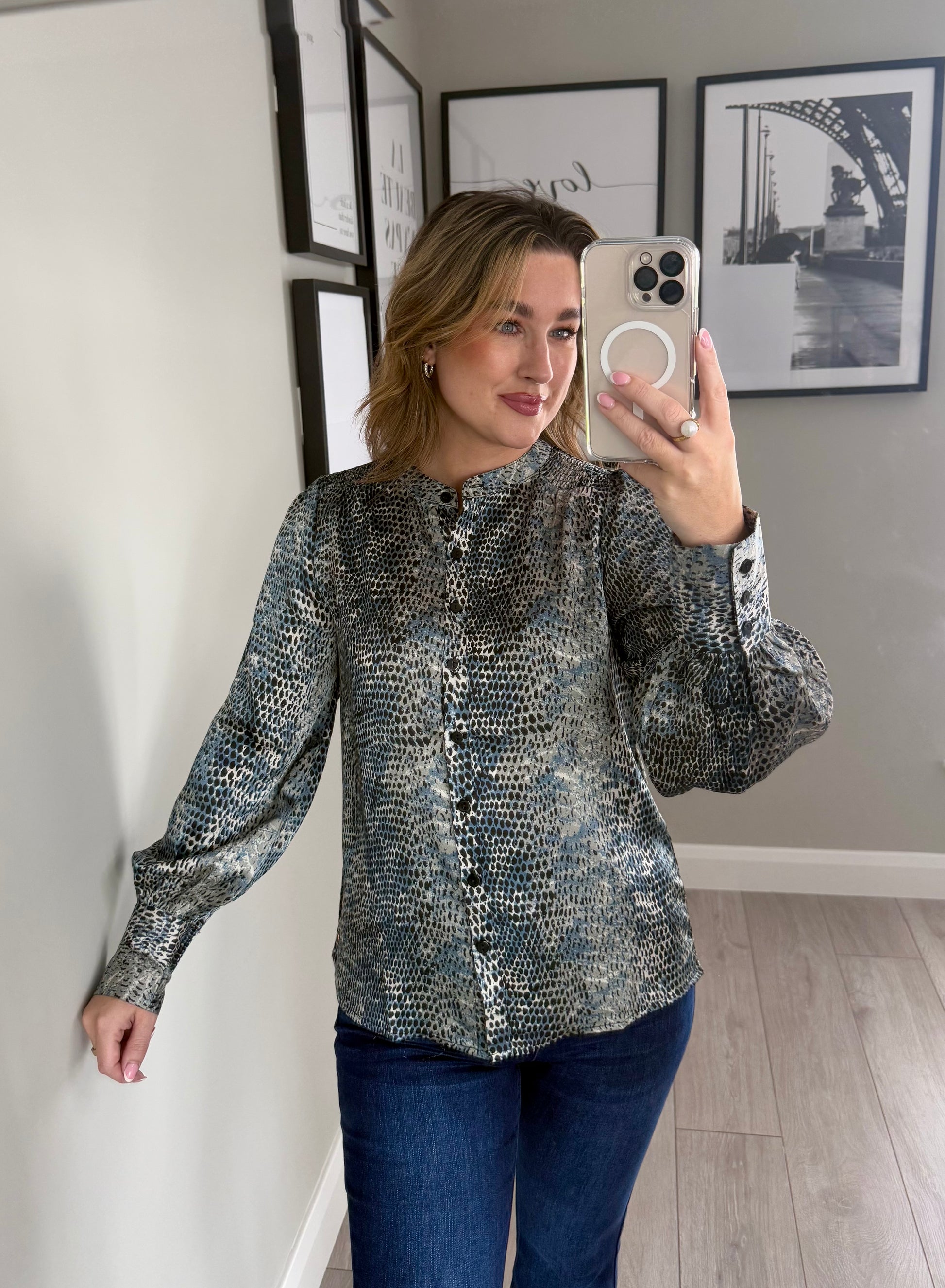 -Rant & Rave blue printed blouse. A combination of blues, beige & black subtly forming a striking snake effect print, with button through high neckline & button cuff full length sleeves.