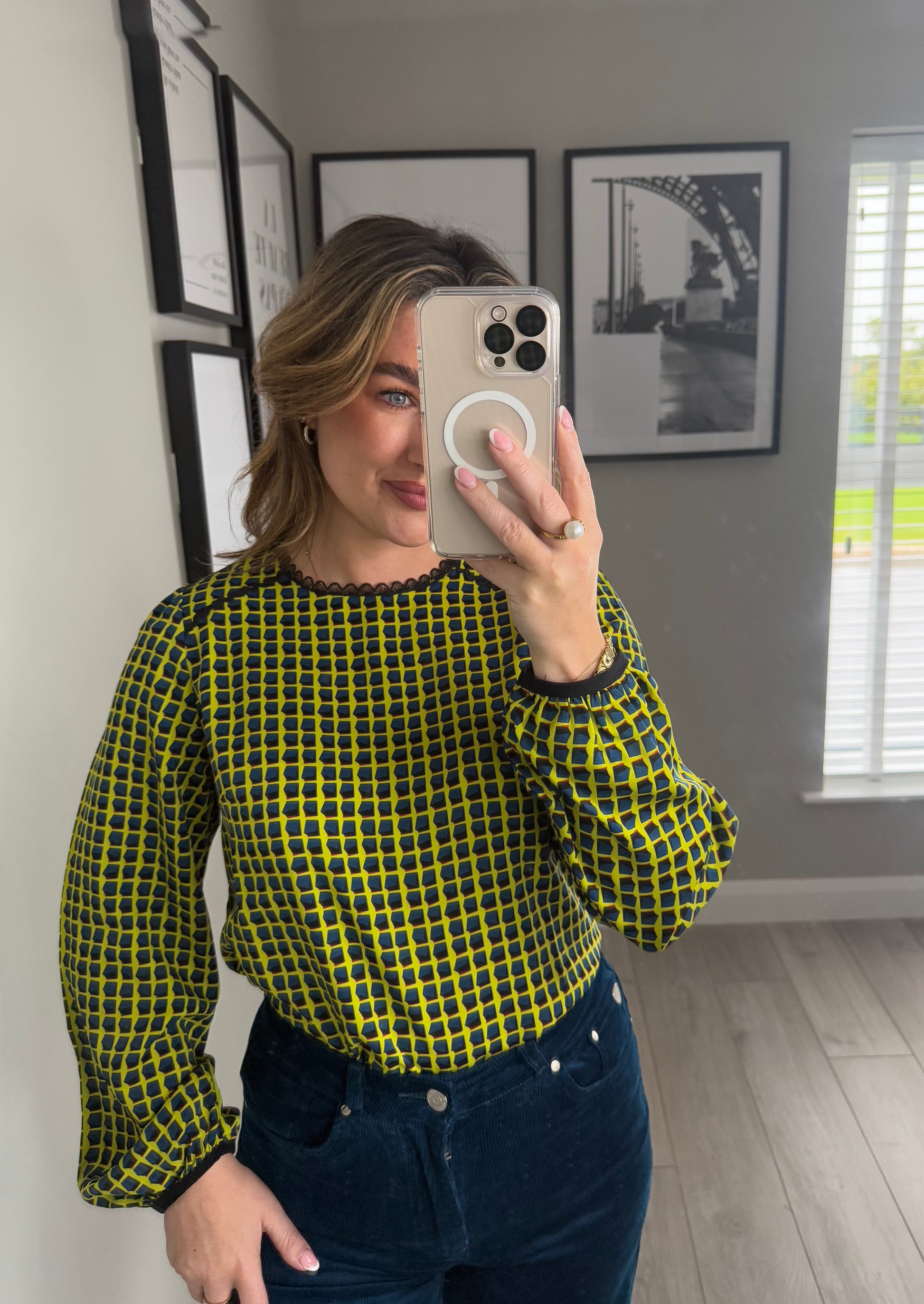 -Rant & Rave two toned green & teal blouse. Abstract print with scalloped round neck collar & full length sleeves.