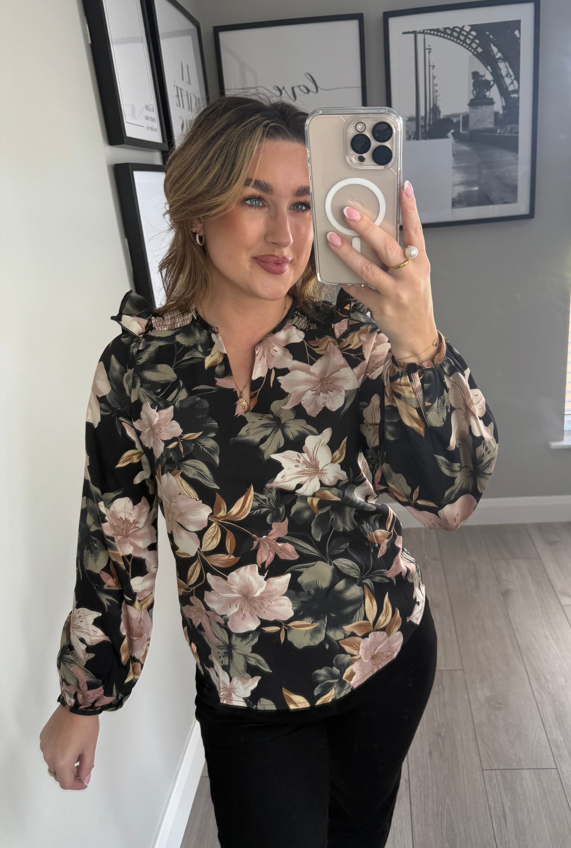 -Rant & Rave black printed top. On a black base the Taya top is florally printed in a blush, tan & green blend. Finished with small V neckline & cuffed full length sleeve.