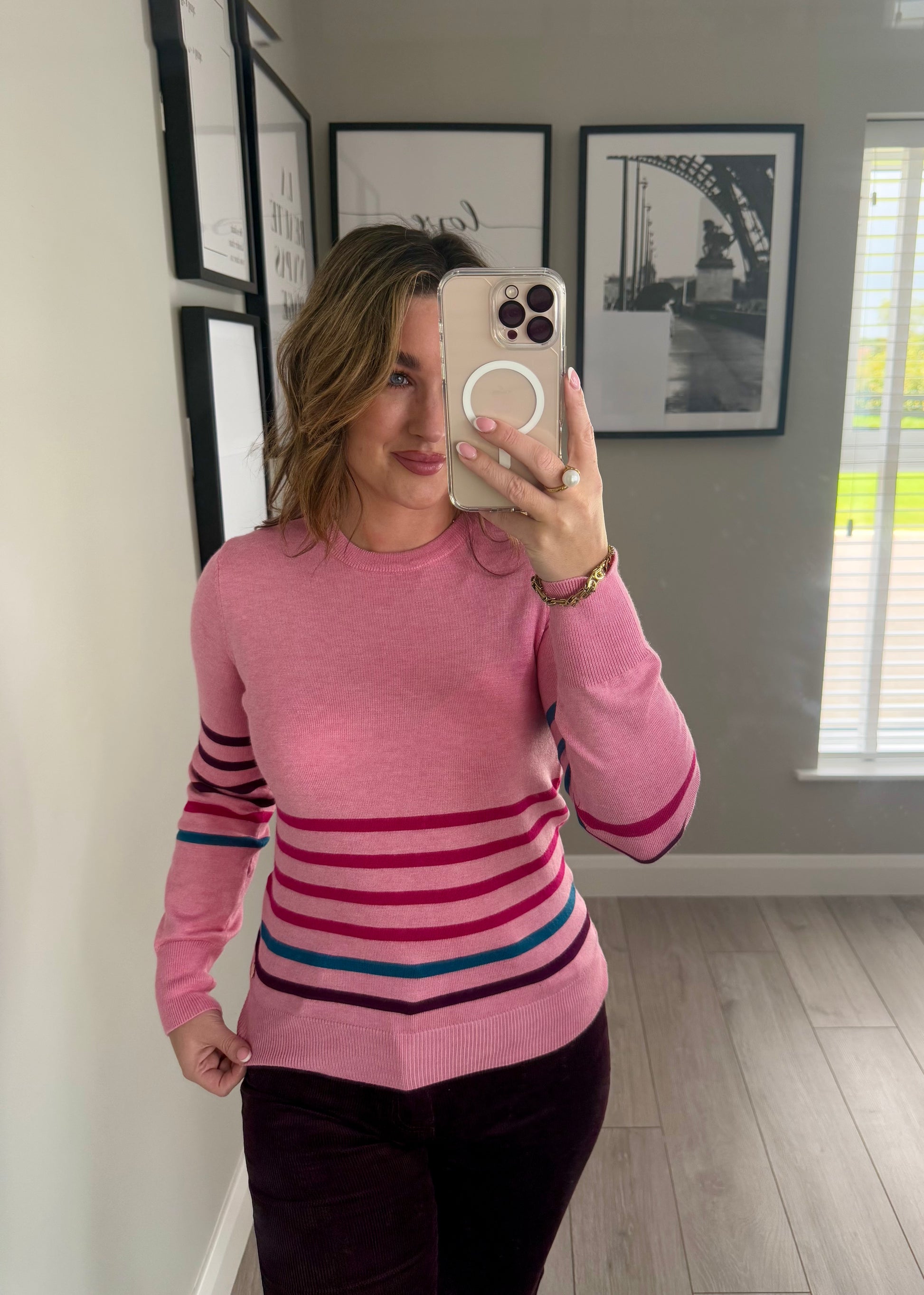 -Rant & Rave fine knit jumper in pink with multi (berry, teal & plum) stripe detail. Round neck & long cuffed sleeves.